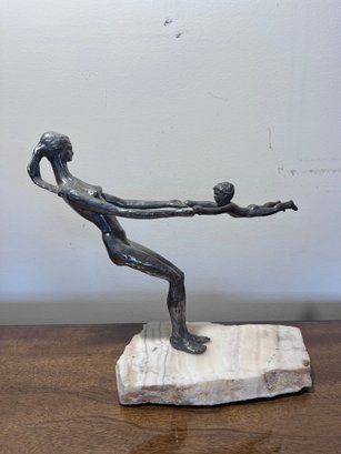 Material: It is crafted from a metal composite, such as aluminum or plaster with a cold-bronze finish, and mounted on a marble base.