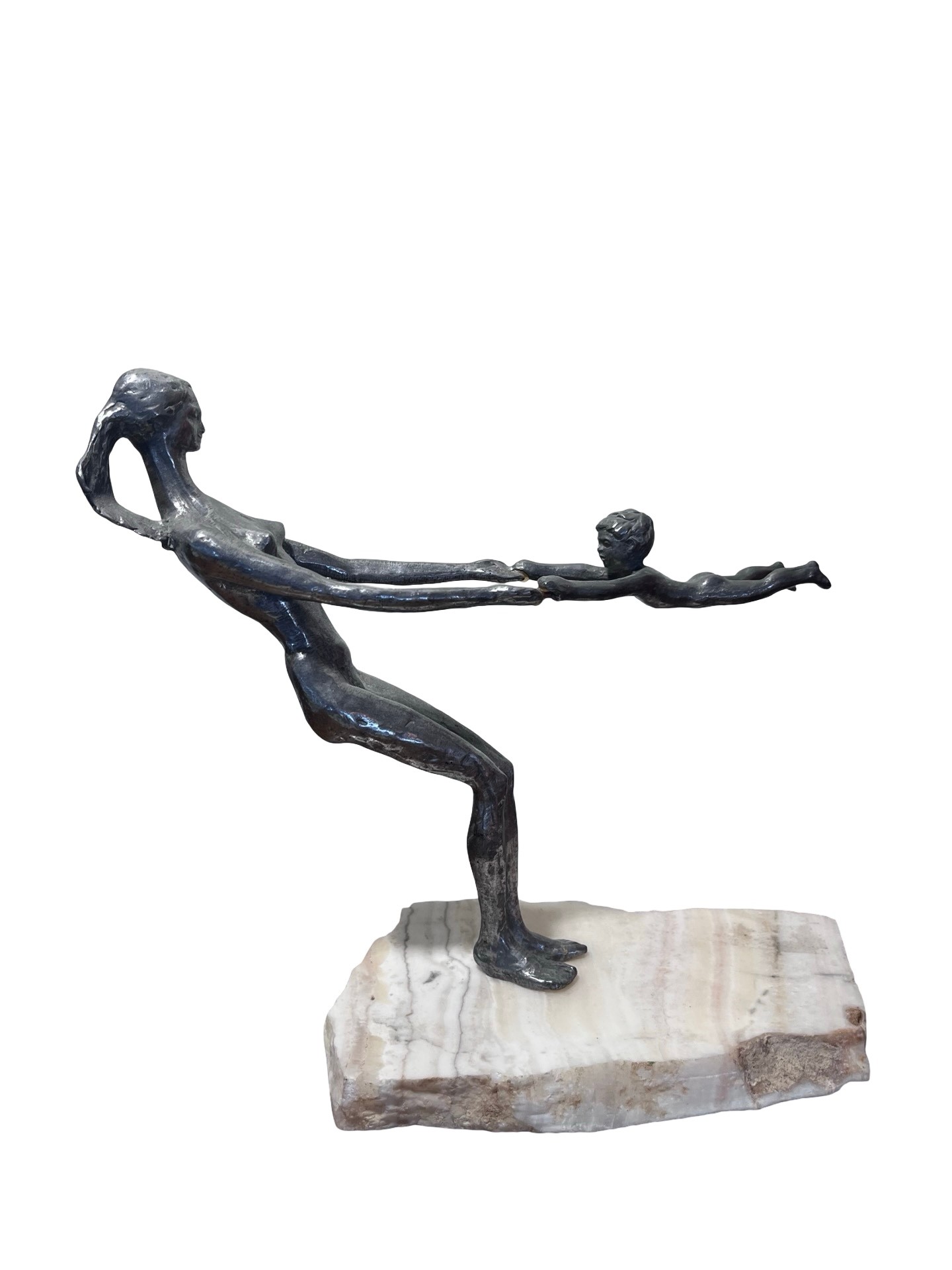 Style: It features an abstract, modernist depiction of a mother swinging her child.