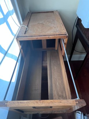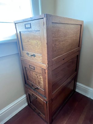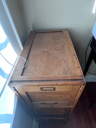 Vintage oak filing cabinet, likely in the Arts and Crafts style, which is a collectible item.