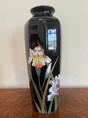 Vintage Otagiri Crown Iris Vase from Japan. Black with gold trim and hand-painted "Crown Iris" pattern in shades of white, pink, yellow, and purple. Ceramic,