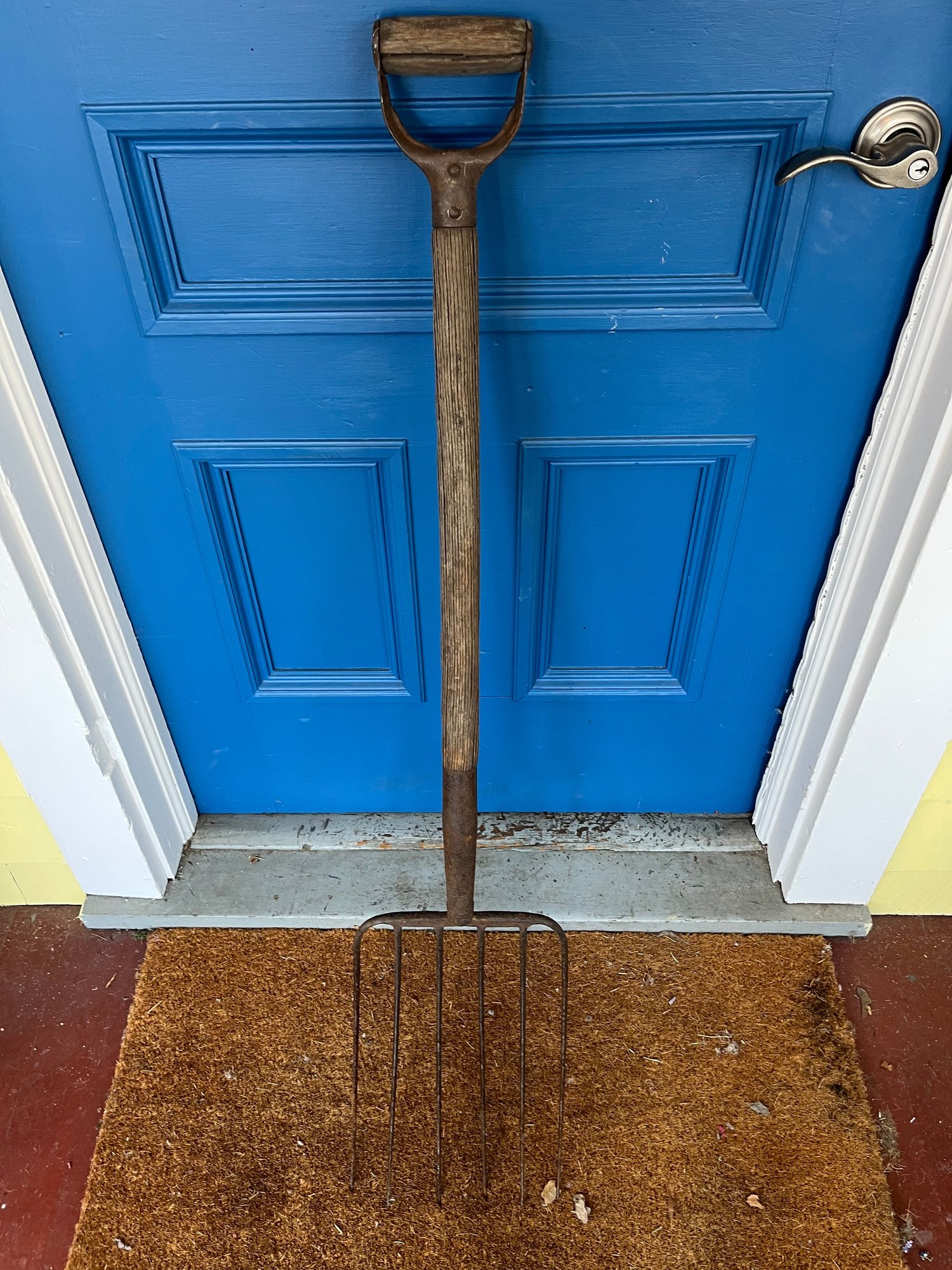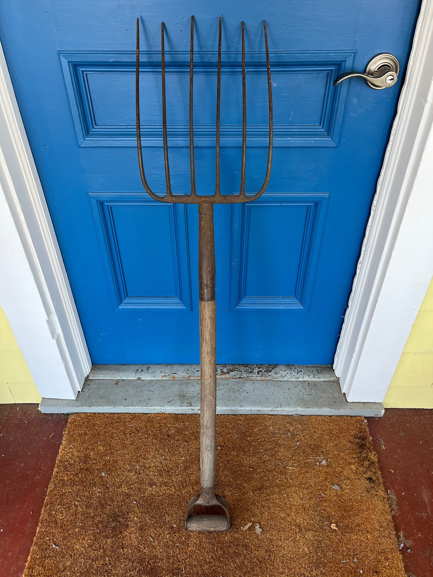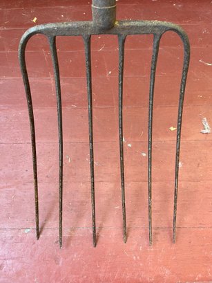 Vintage pitchfork, often used for lifting hay or straw, and frequently sought after as a decorative primitive tool or for functional gardening tasks.