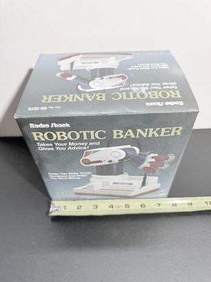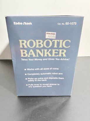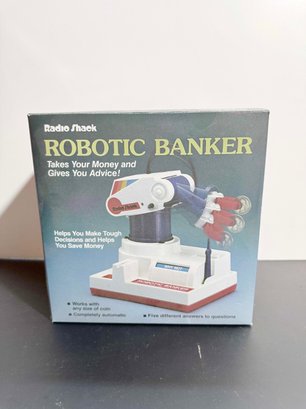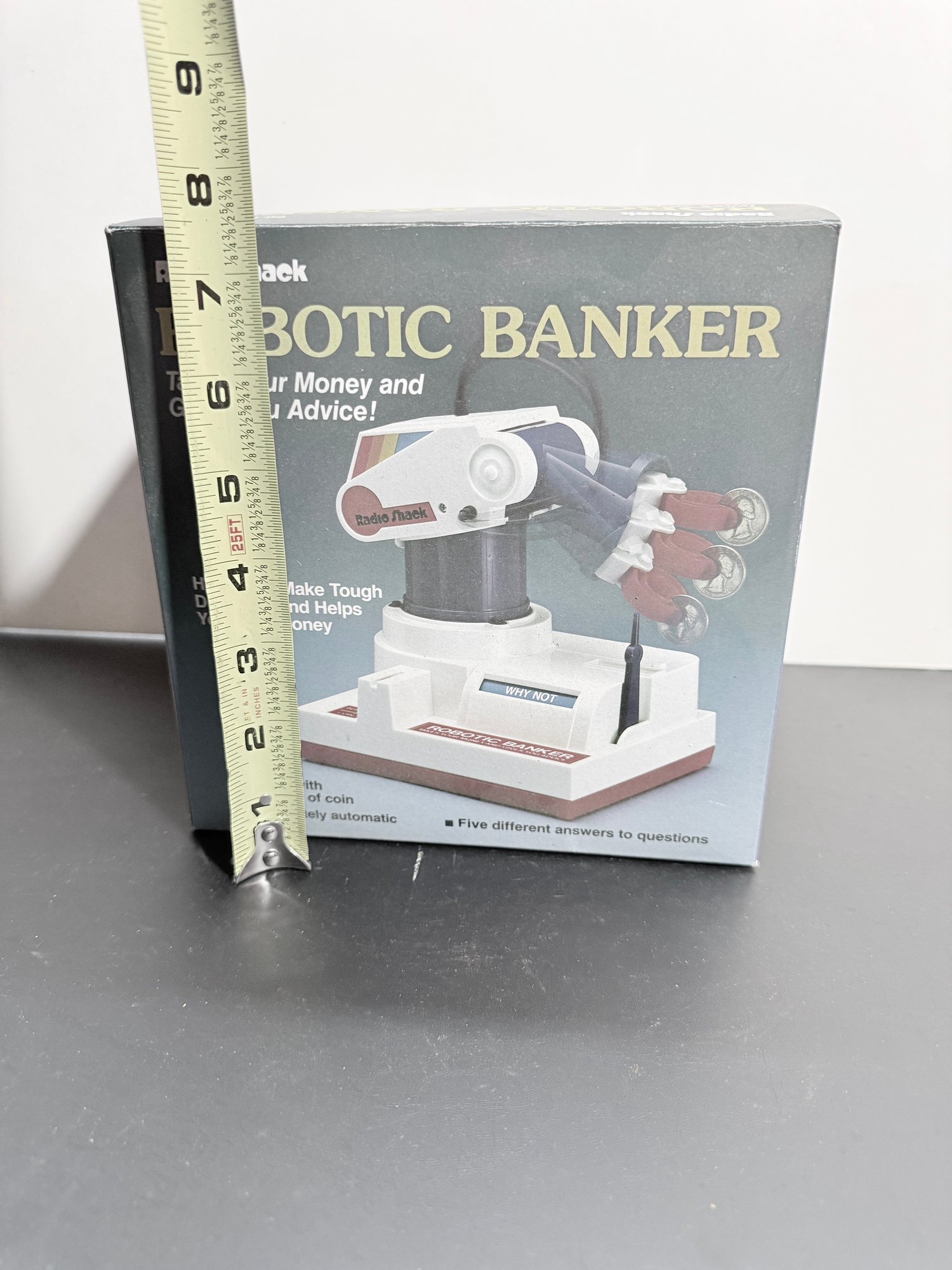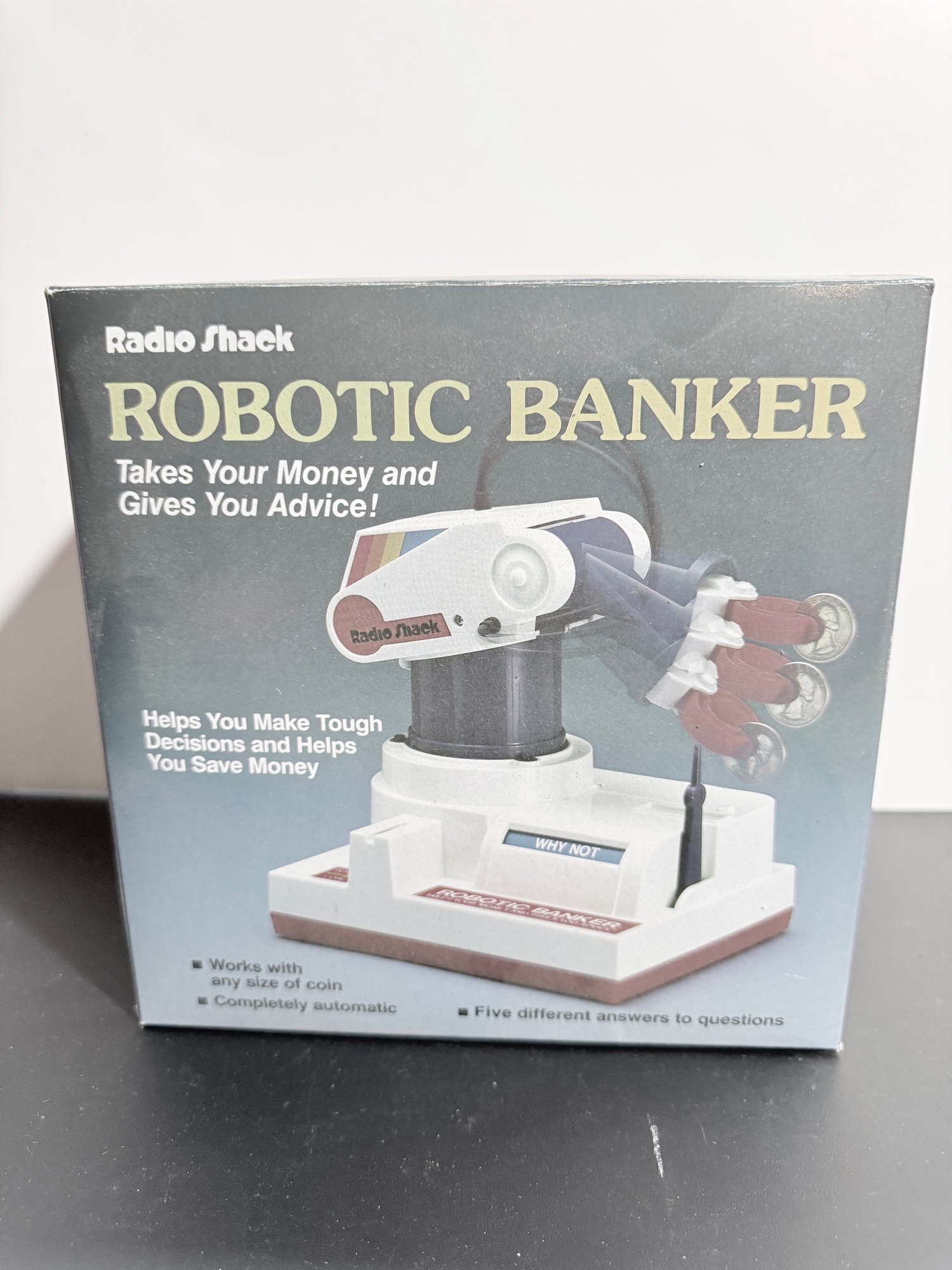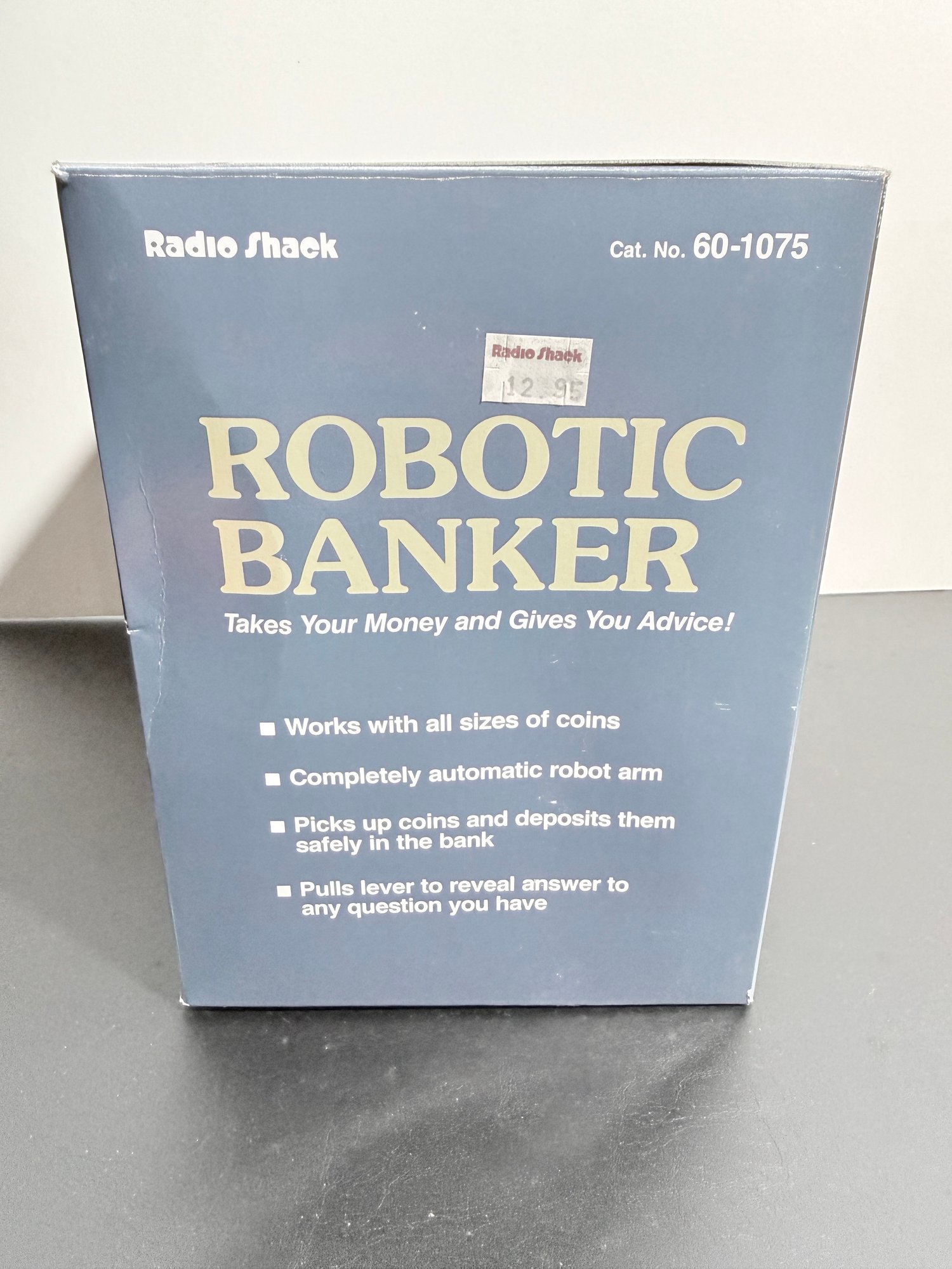 vintage Radio Shack Robotic Banker, a collectible electronic coin bank shaped like a robotic arm.