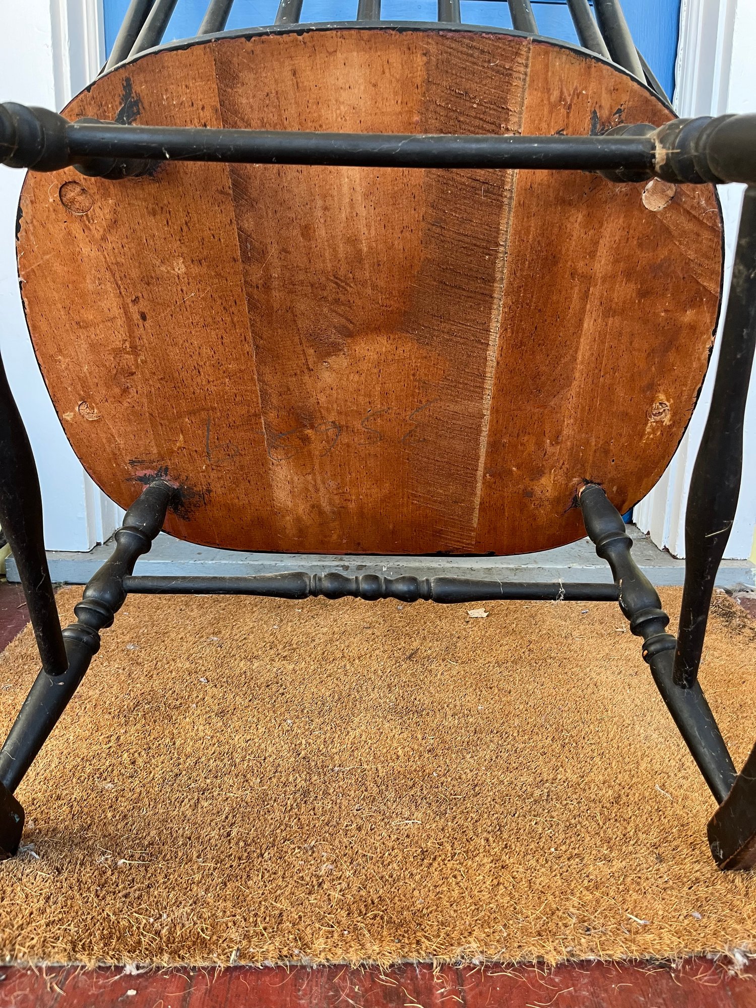 Windsor-fashion with a high, spindle "bent back" for comfort. The visible wear and tear on the paint suggests it is a well-used vintage piece.