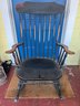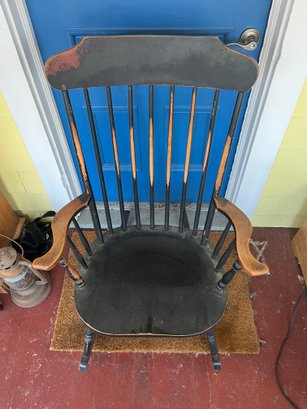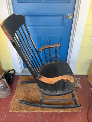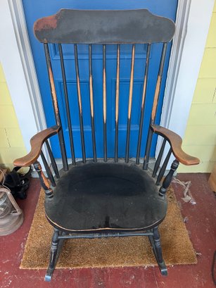 Vintage rocking chair, featuring a black painted finish and styling reminiscent of early American Windsor or Hitchcock designs.