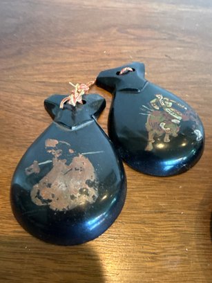 Vintage Spanish castanets, a hand-held percussion instrument commonly used in flamenco music and dance. They are a collectible item typically made of wood or similar materials like Bakelite, often featuring hand-painted designs related to Spanish culture such as bullfighters or dancers