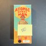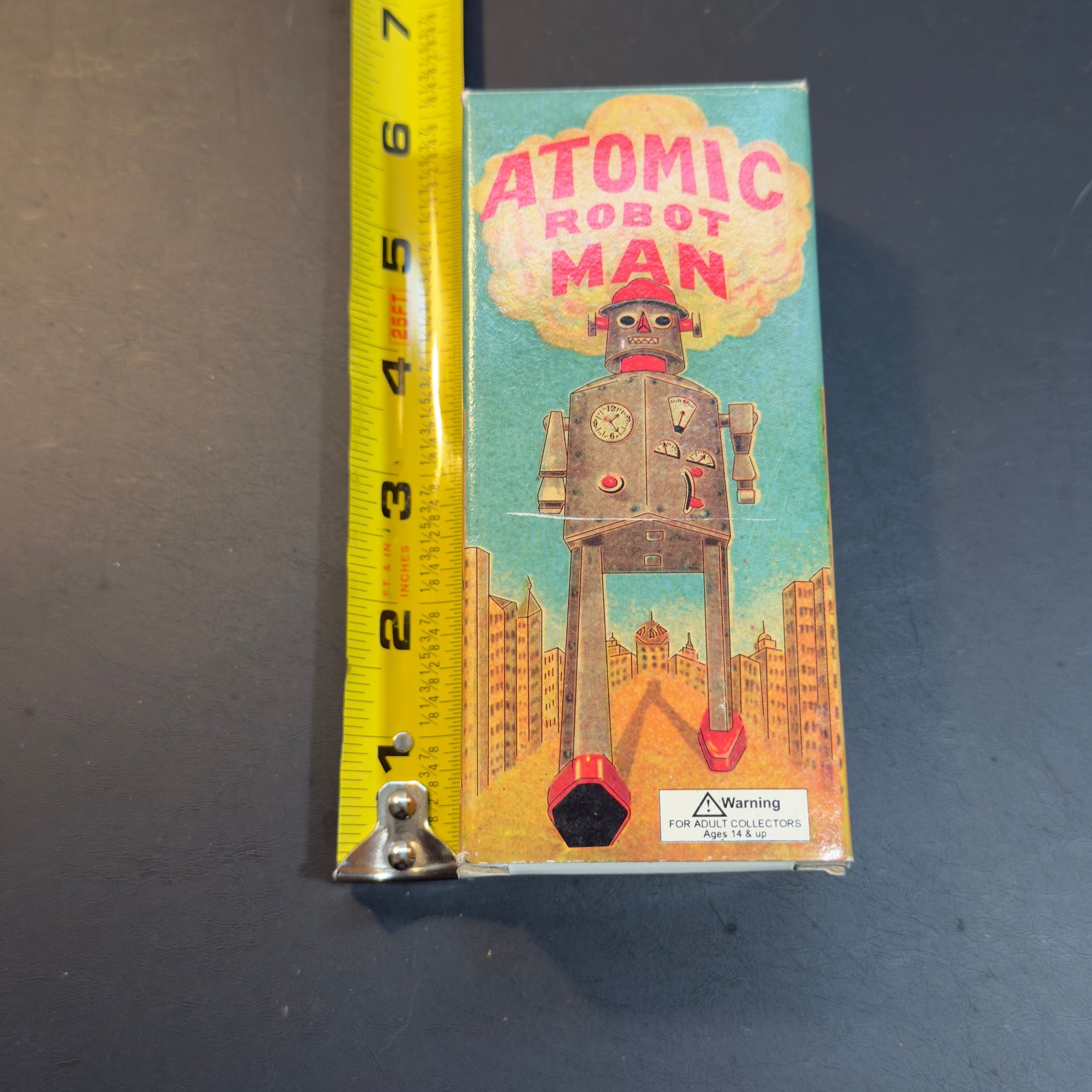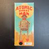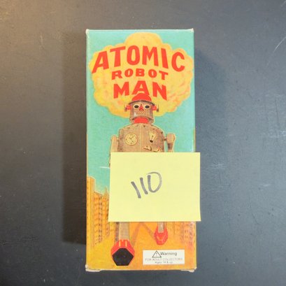 This is typically a reproduction of a late 1940s Japanese robot toy. It operates with a wind-up mechanism, causing it to walk forward with a jerky motion. The original box art features a distinctive illustration of an atomic bomb cloud.