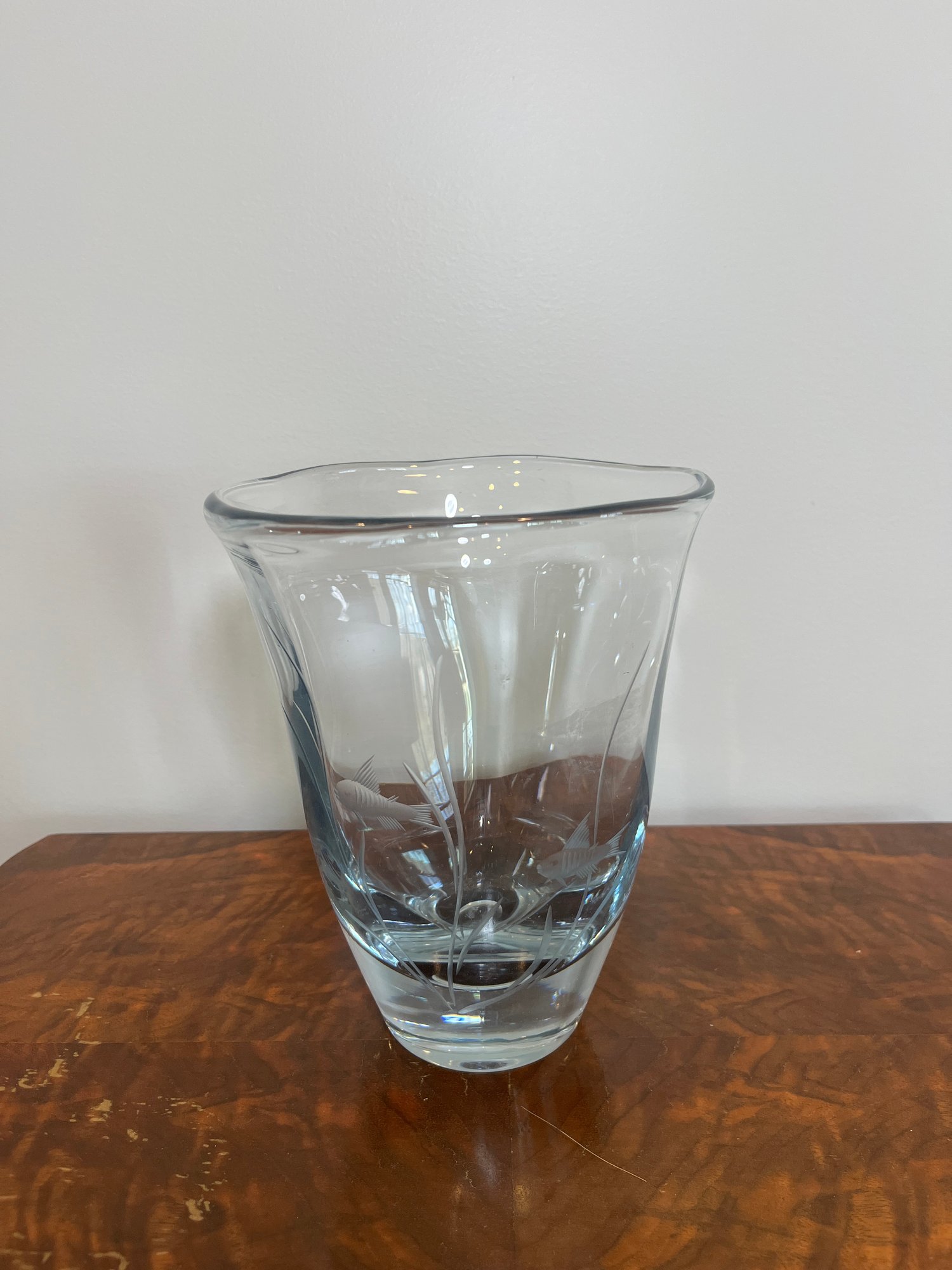 Vintage Swedish Stromberg 'fish' art glass vase design. Measures 6” across by 7” high.