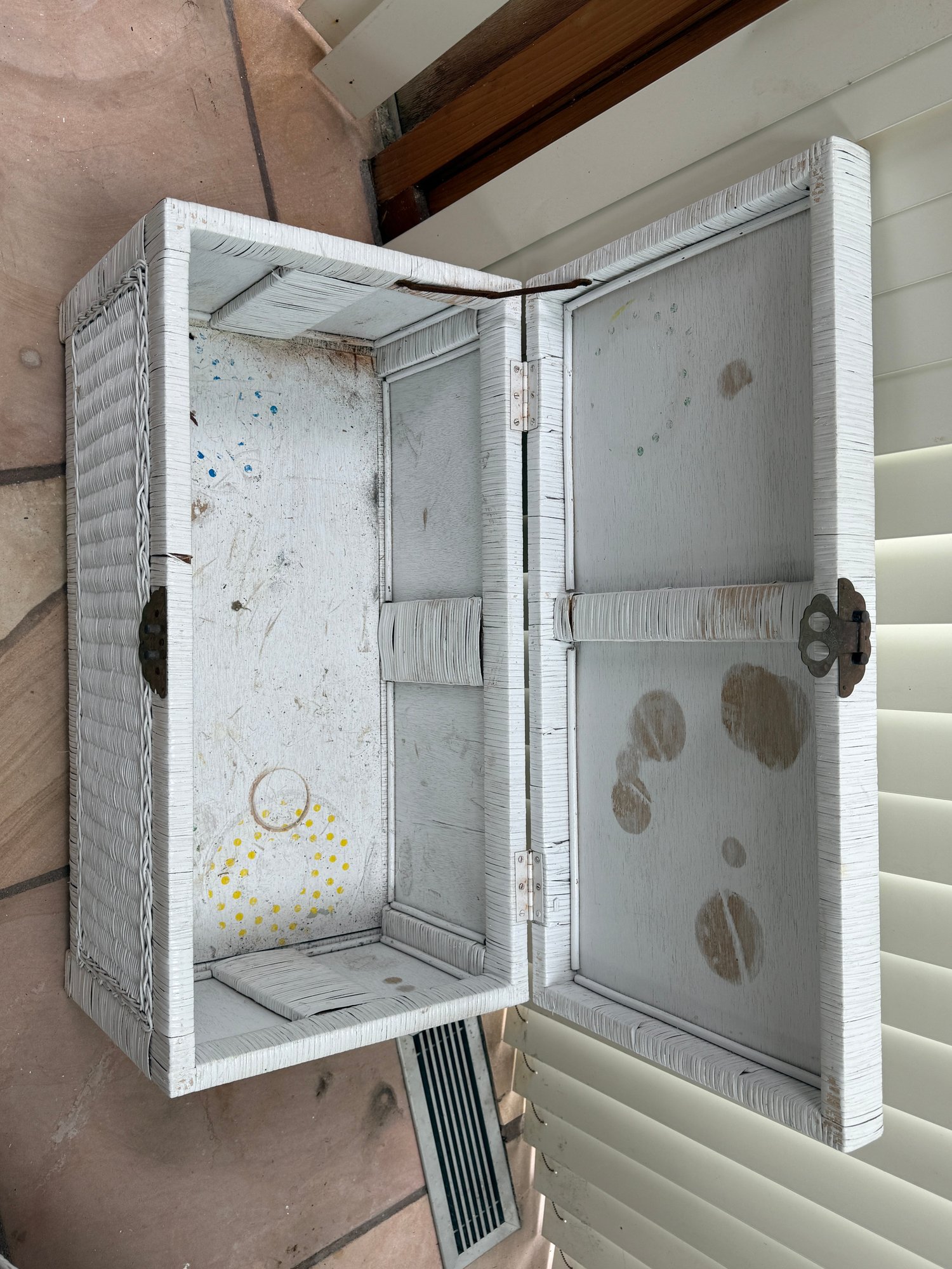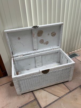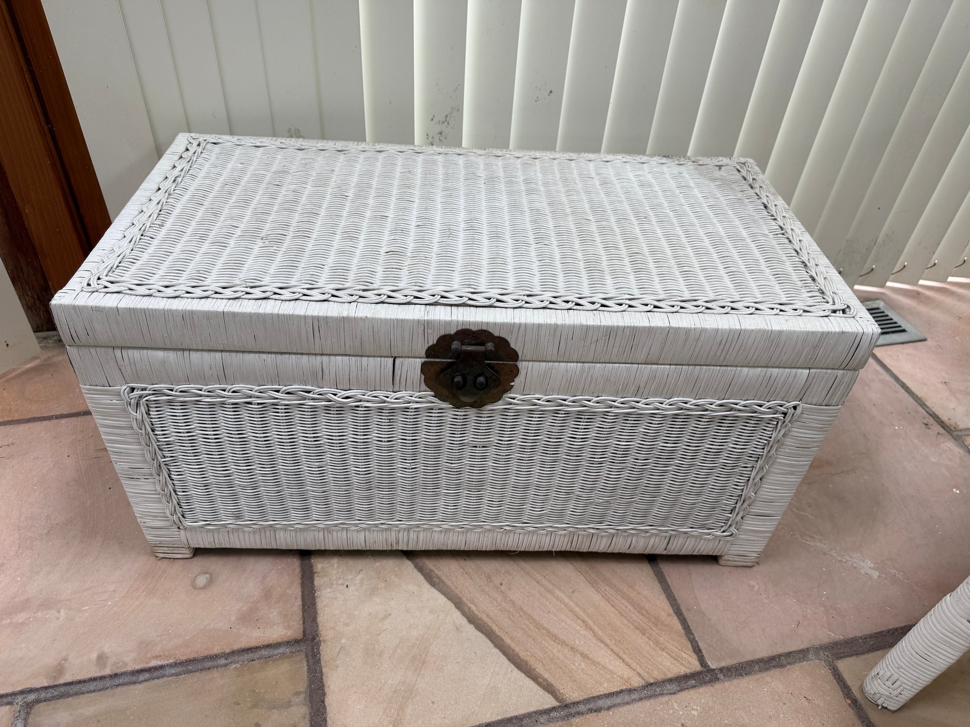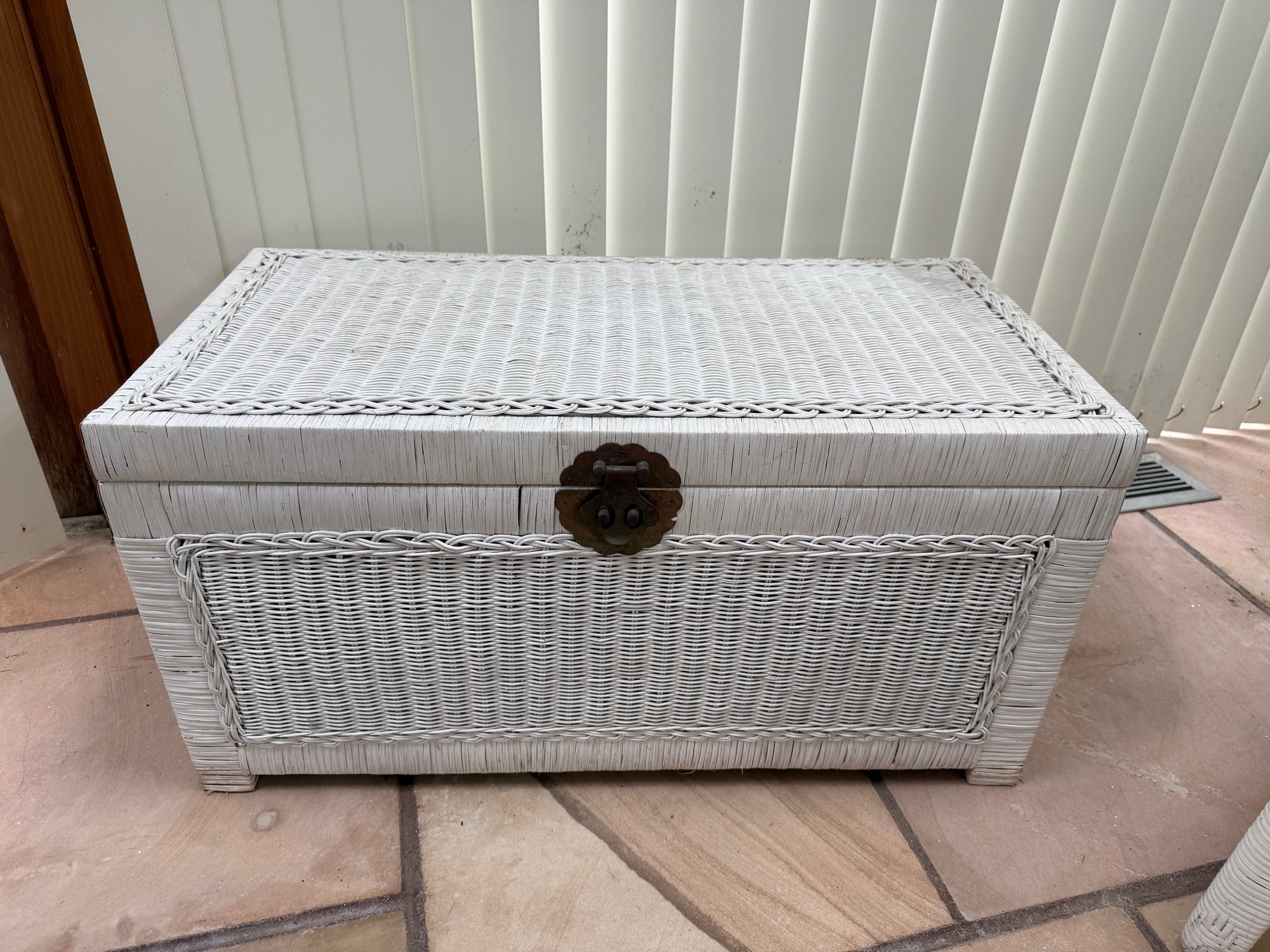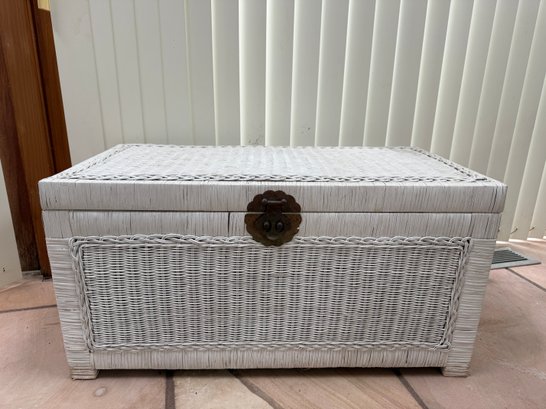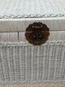 vintage white wicker trunk or storage chest, a popular piece from the late 20th century. It features a woven rattan exterior with decorative braided edges and a central engraved brass Chinoiserie latch.