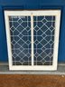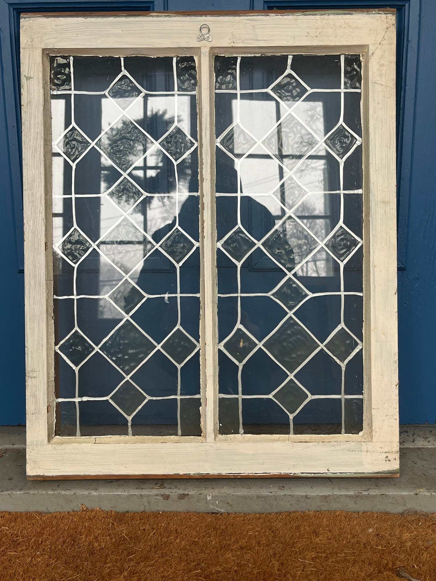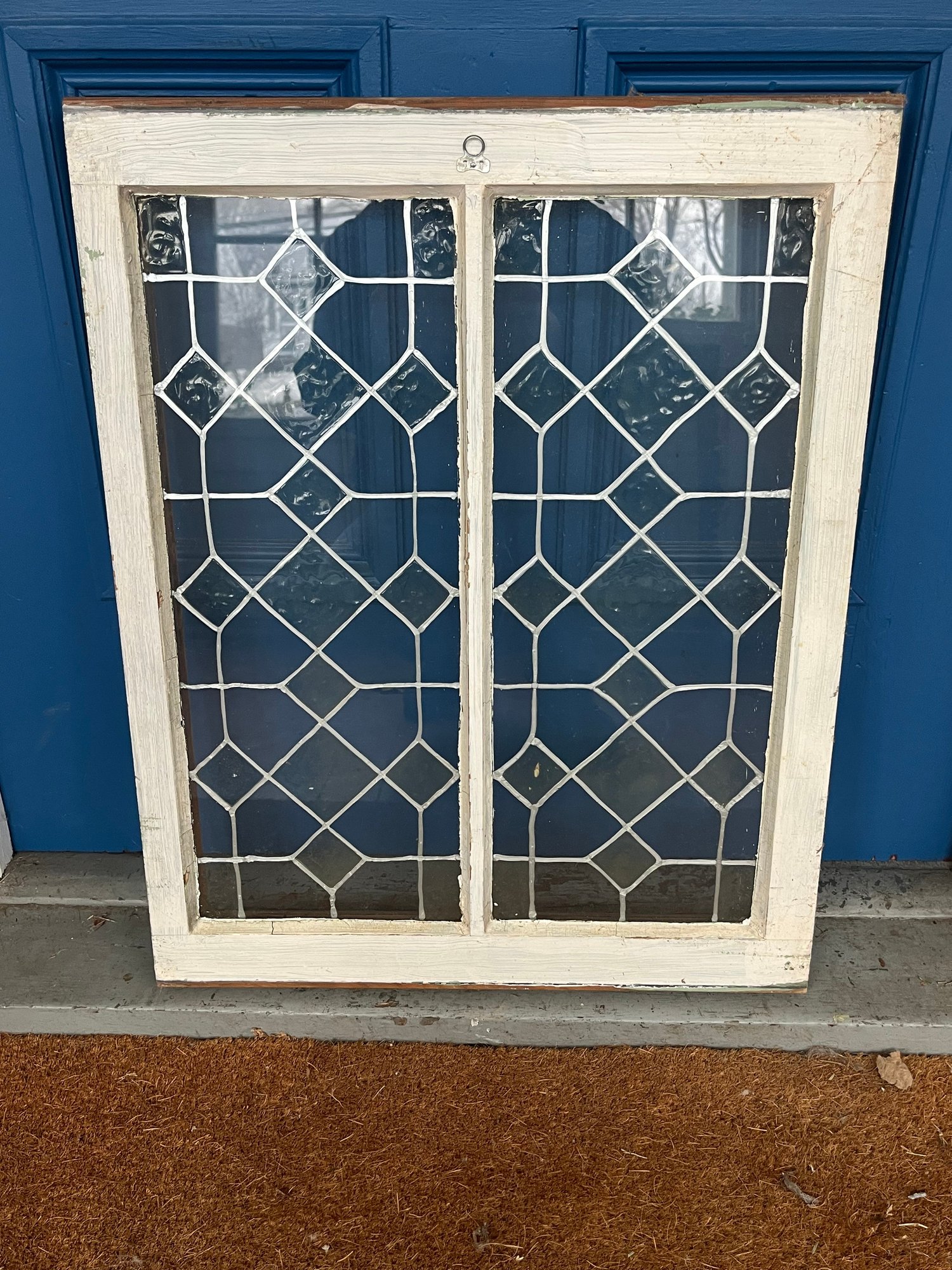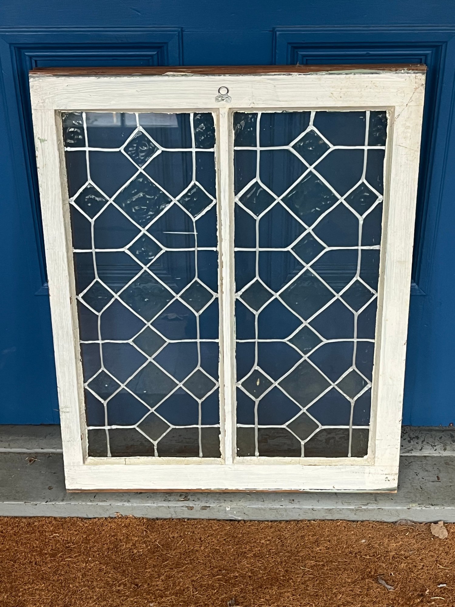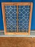 Vintage window is an antique leaded glass piece featuring a decorative diamond pattern.