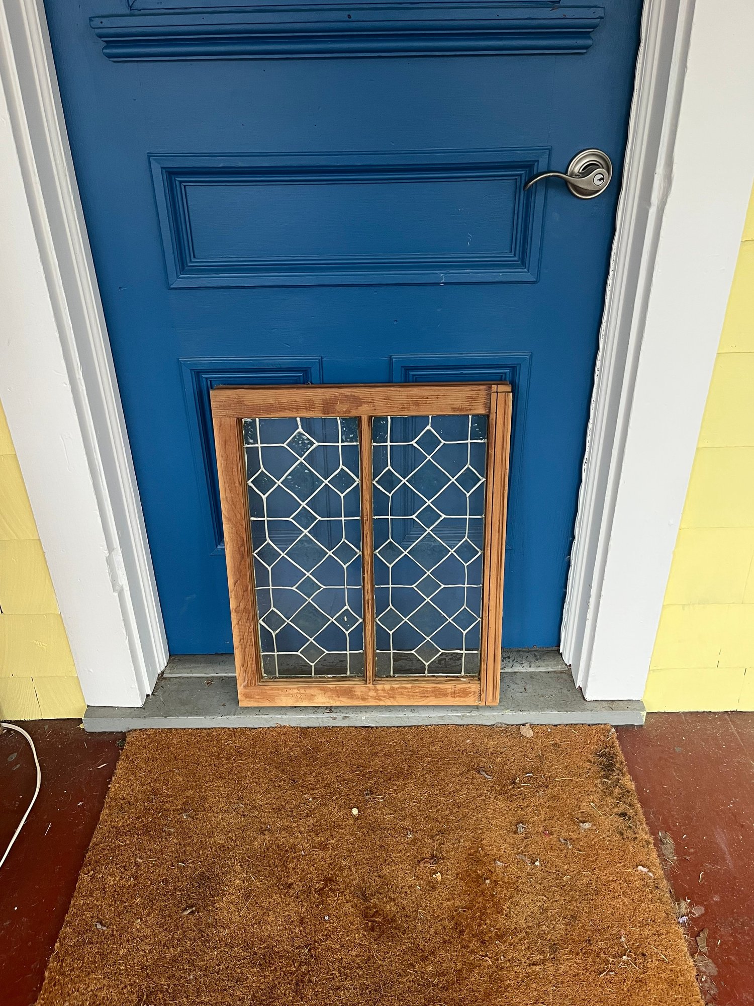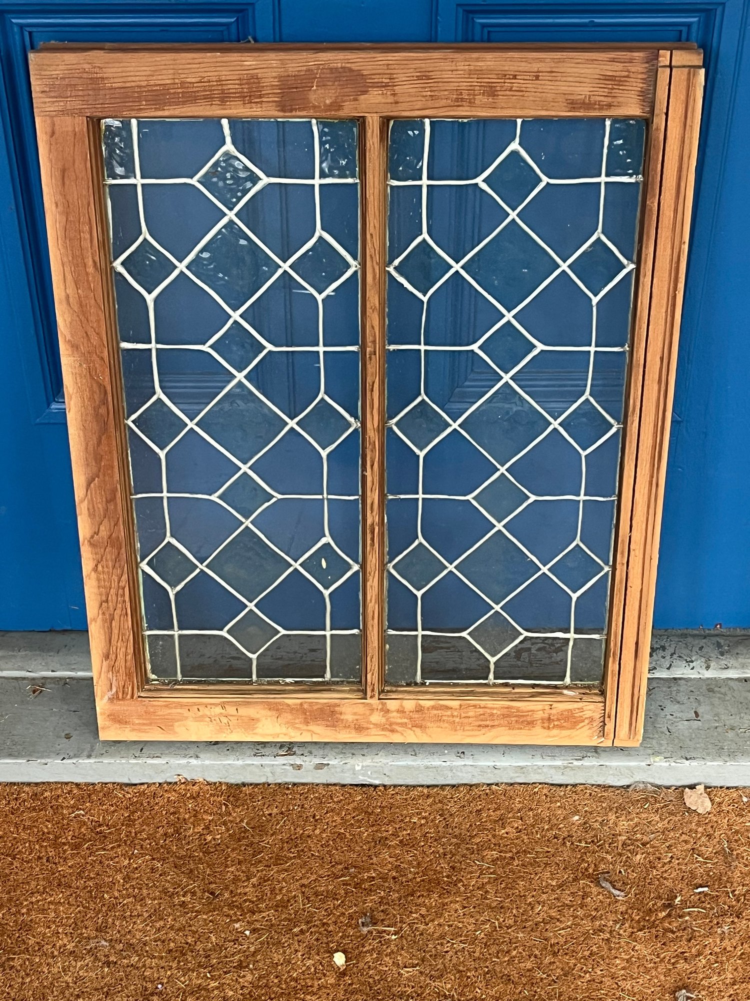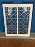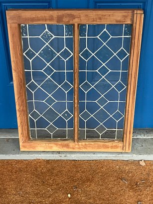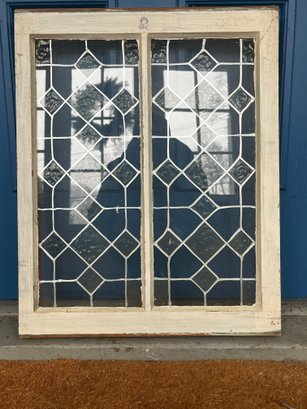 Features a geometric diamond pattern made with lead caming. Constructed with a wooden frame and textured glass panes.