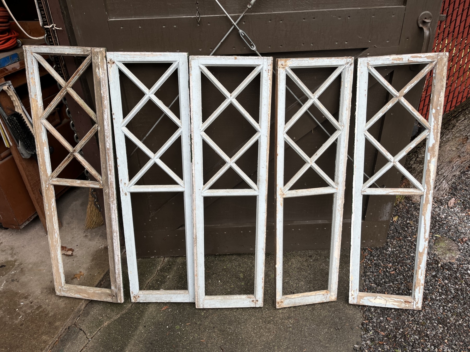 Painted green on one side light blue on the other. Show signs of age but they are structurally sound. Many people repurpose and use as picture frames or other decorative ideas.