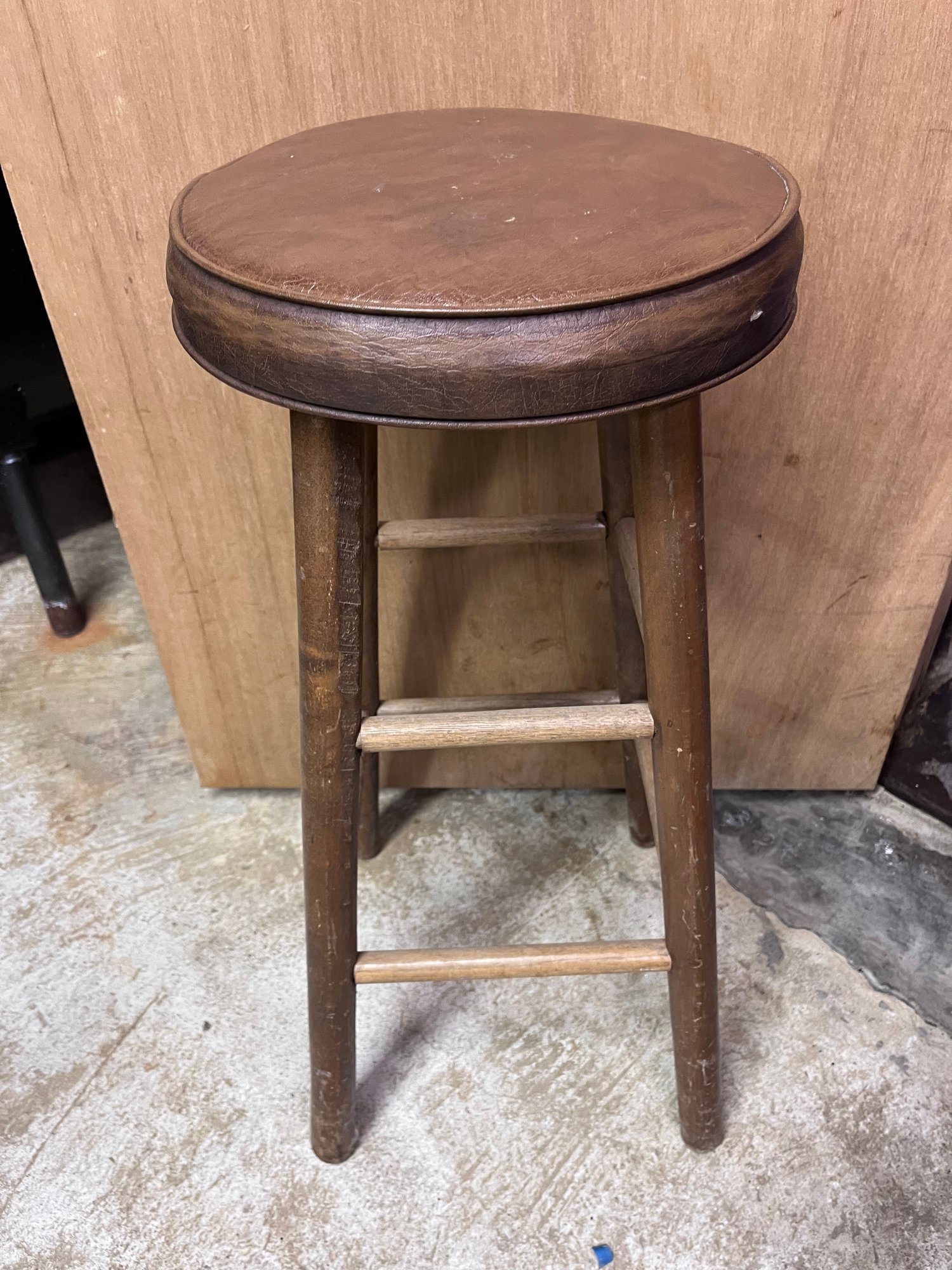 vintage wooden bar stool featuring a round, padded seat upholstered in a brown material.