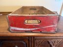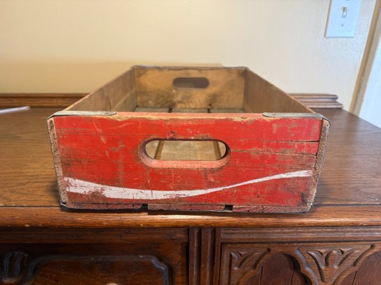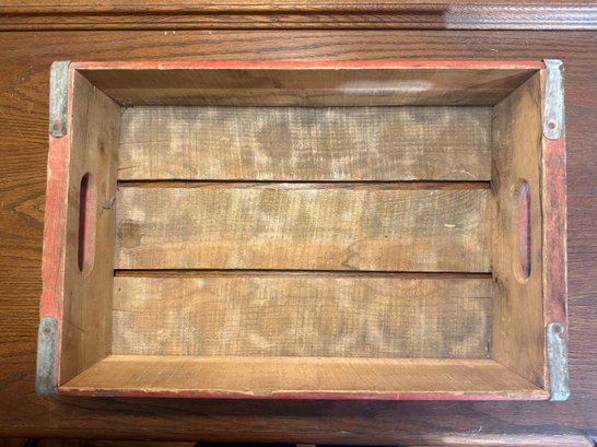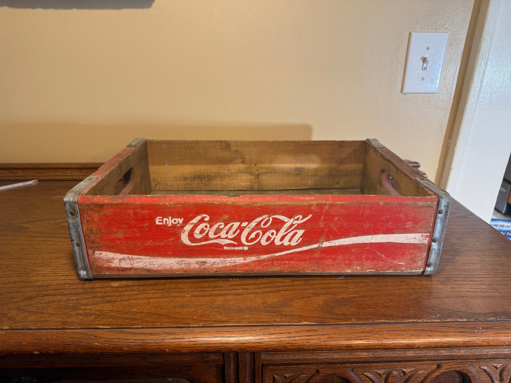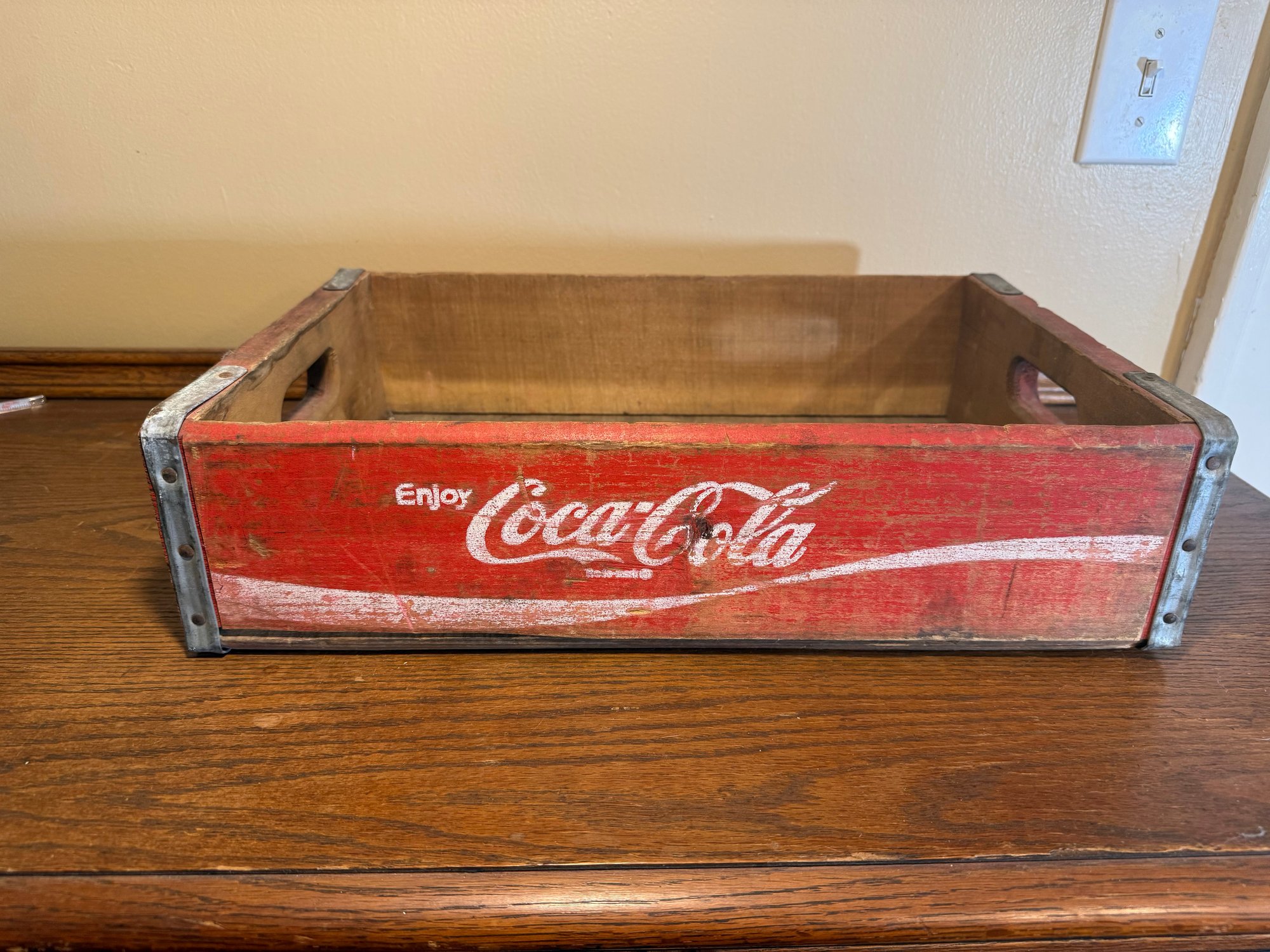 Authentic Vintage Appeal: This wooden Coca-Cola beverage crate is in good vintage condition, featuring the classic "Enjoy Coca-Cola" logo in white paint on a red background. The authentic weathered patina, distressed paint, chips, and surface scratches are consistent with its age and use, adding to its unique rustic charm.