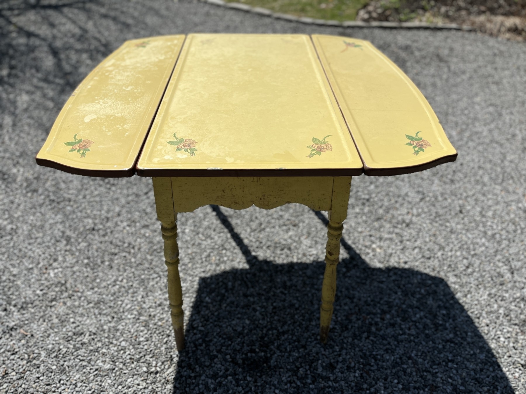 Best guess is that this table is from the 1920's-30's. The top shows some wear and there are a few places where the enamel is wearing through. The legs are a painted wood. The paint is cracking and chipping. Has a pull out drawer. Measures 29.5" tall, 42.5" across and 40" long.