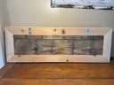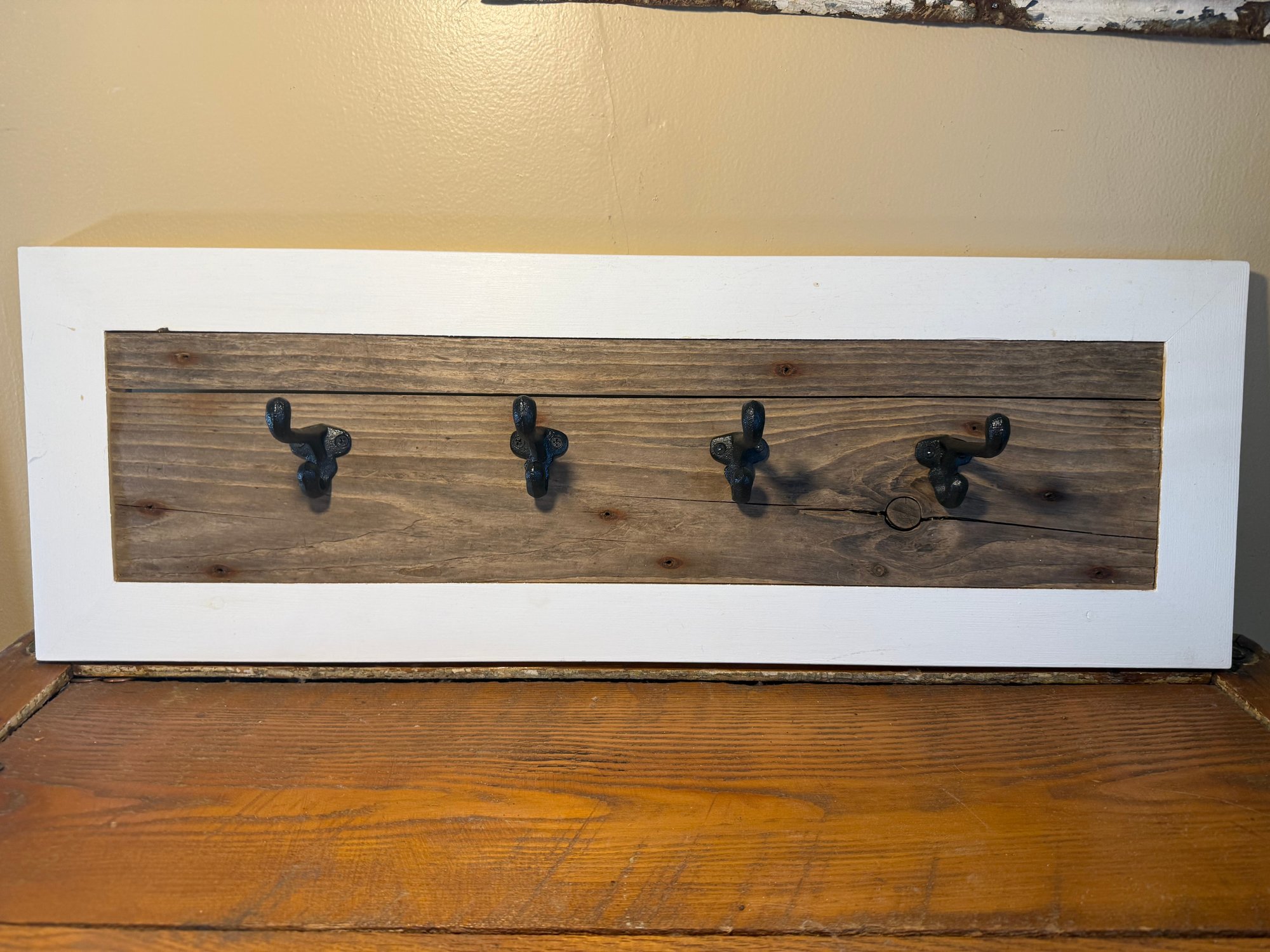 This item is a rustic, wall-mounted coat rack made with barn wood and a white frame. It is designed to be a functional and stylish addition to an entryway, mudroom, or hallway.