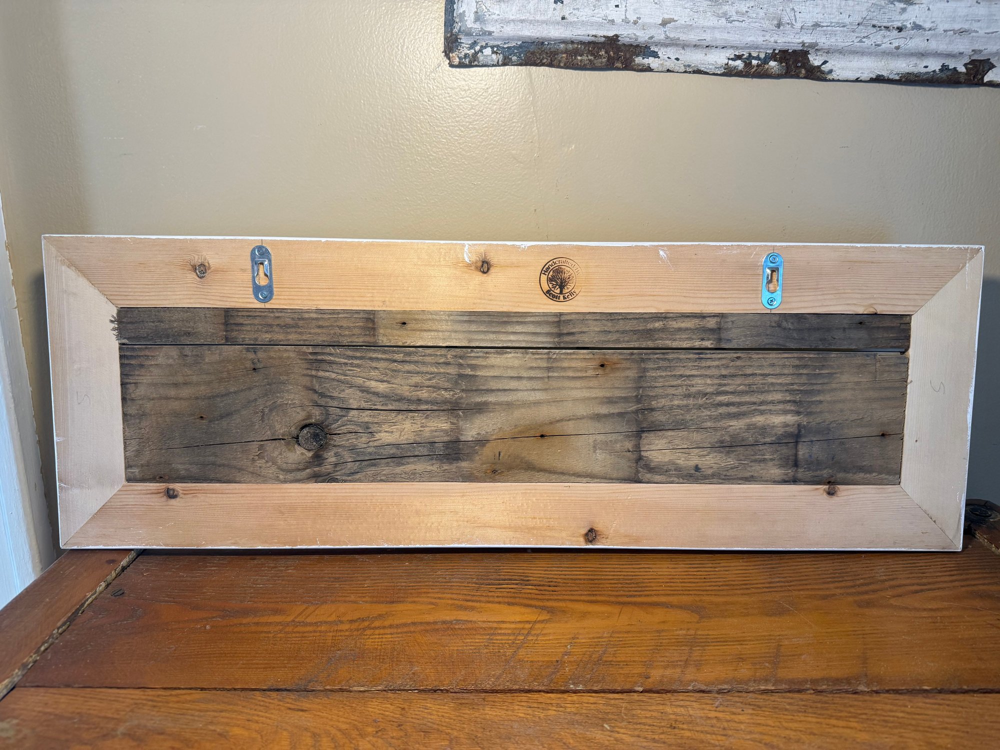 Materials: Features a center panel of reclaimed or distressed pine wood with a weathered look, framed by painted white wood.