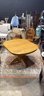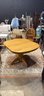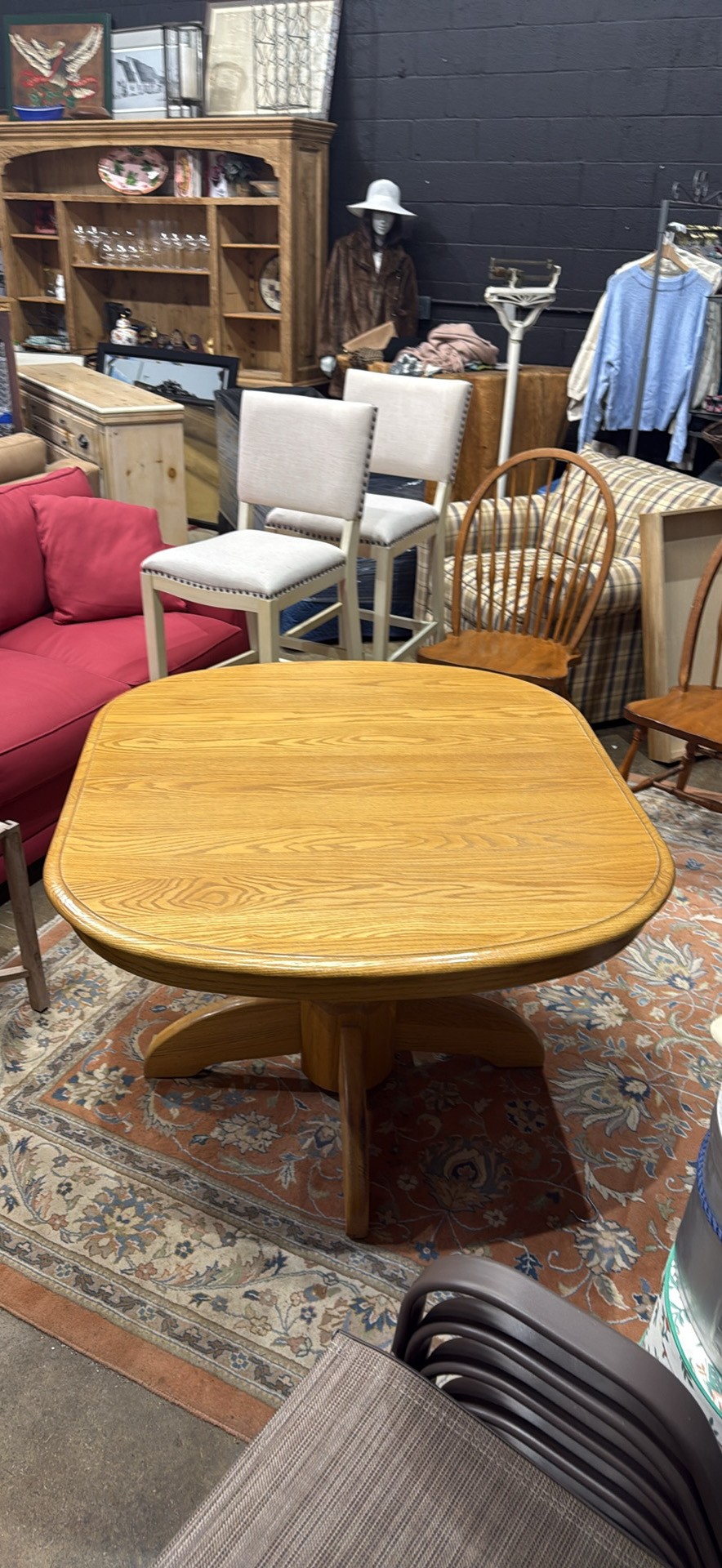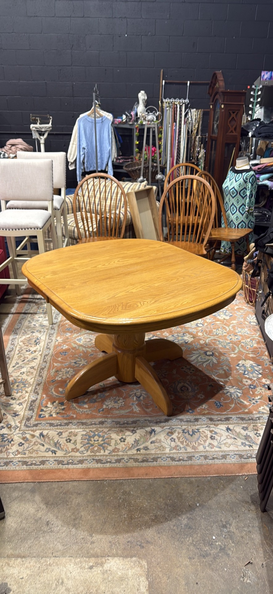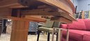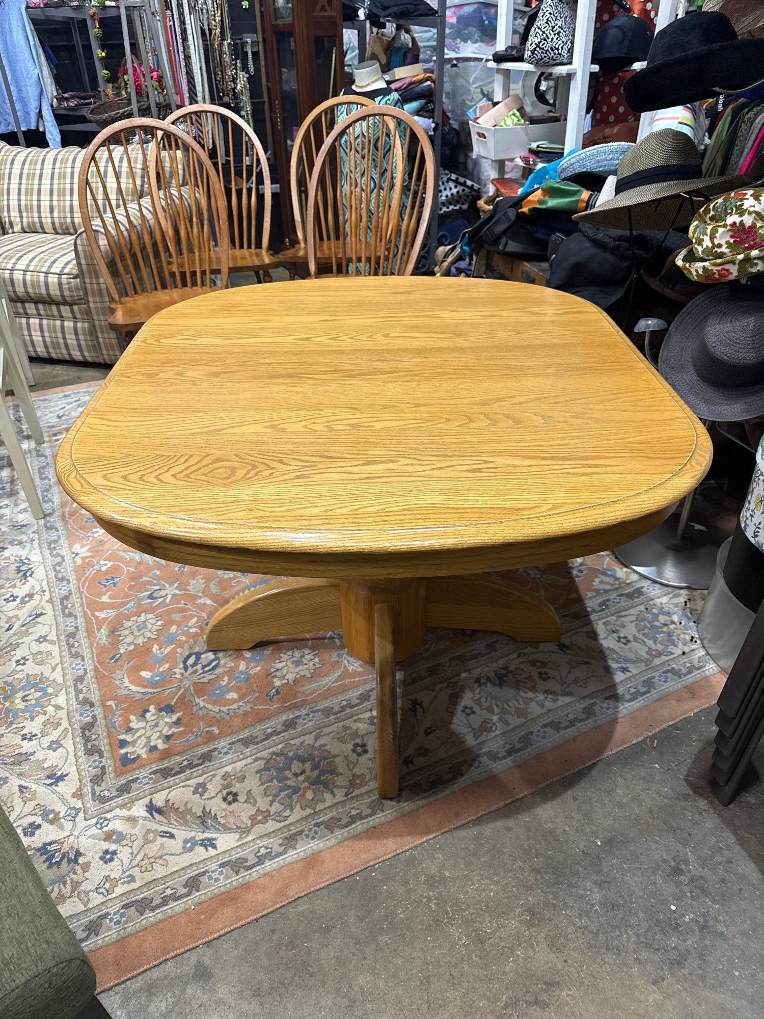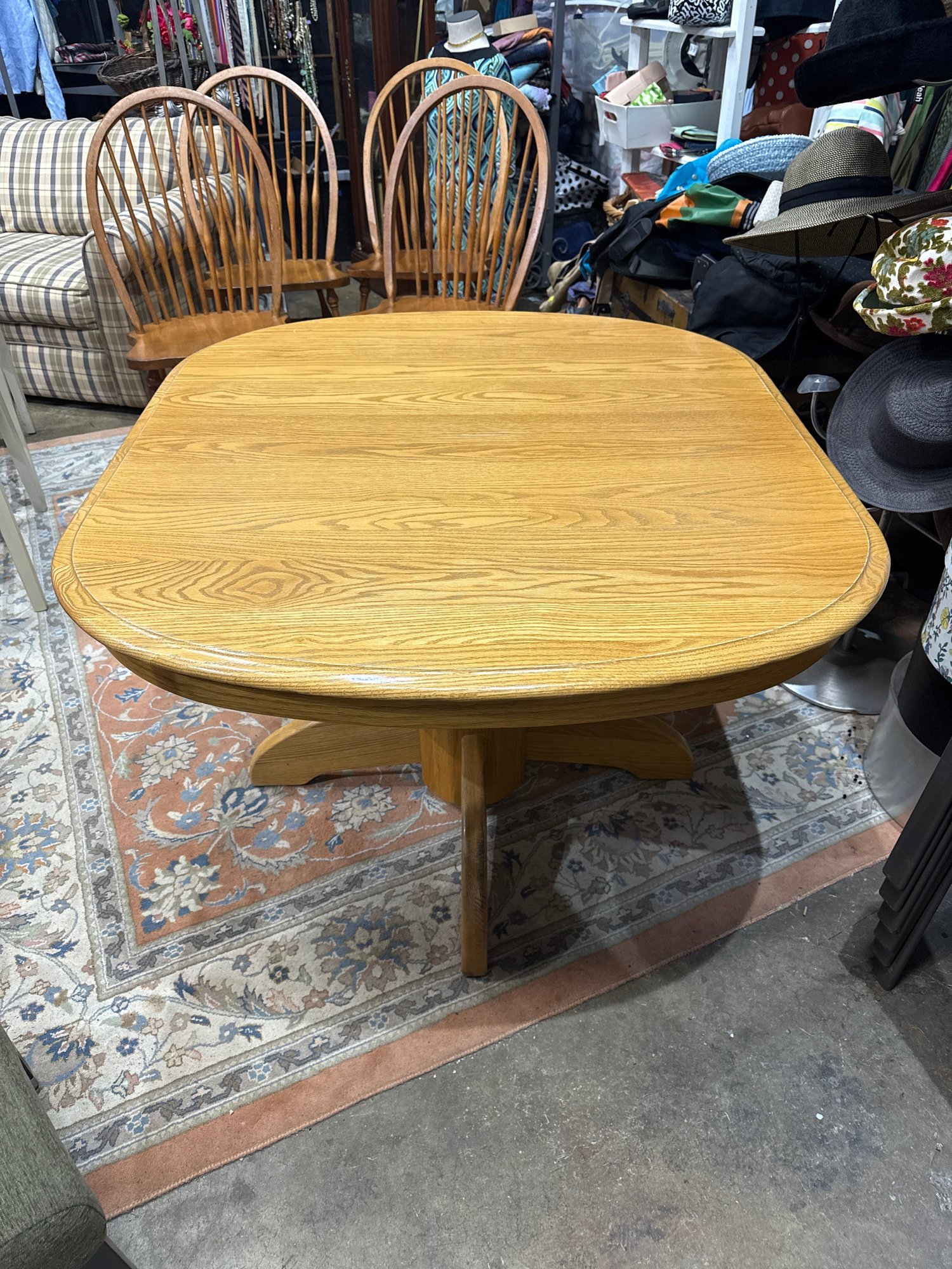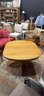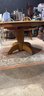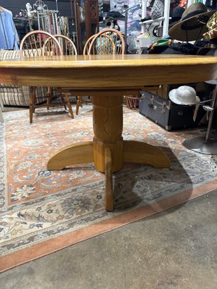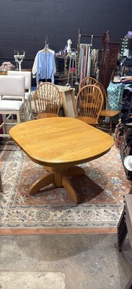 Clean wood dining table. Has a nice pedestal base. Square top with rounded edges. Includes 2- 12 inch wide leaves that are stored underneath. Table without the leaves is 42 inches wide, by 47 1/2 inches deep and 29 inches high.