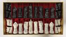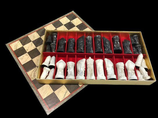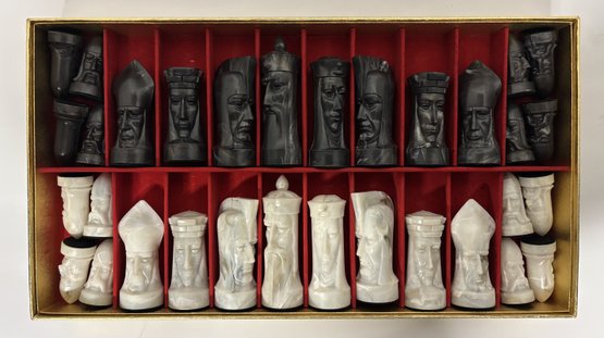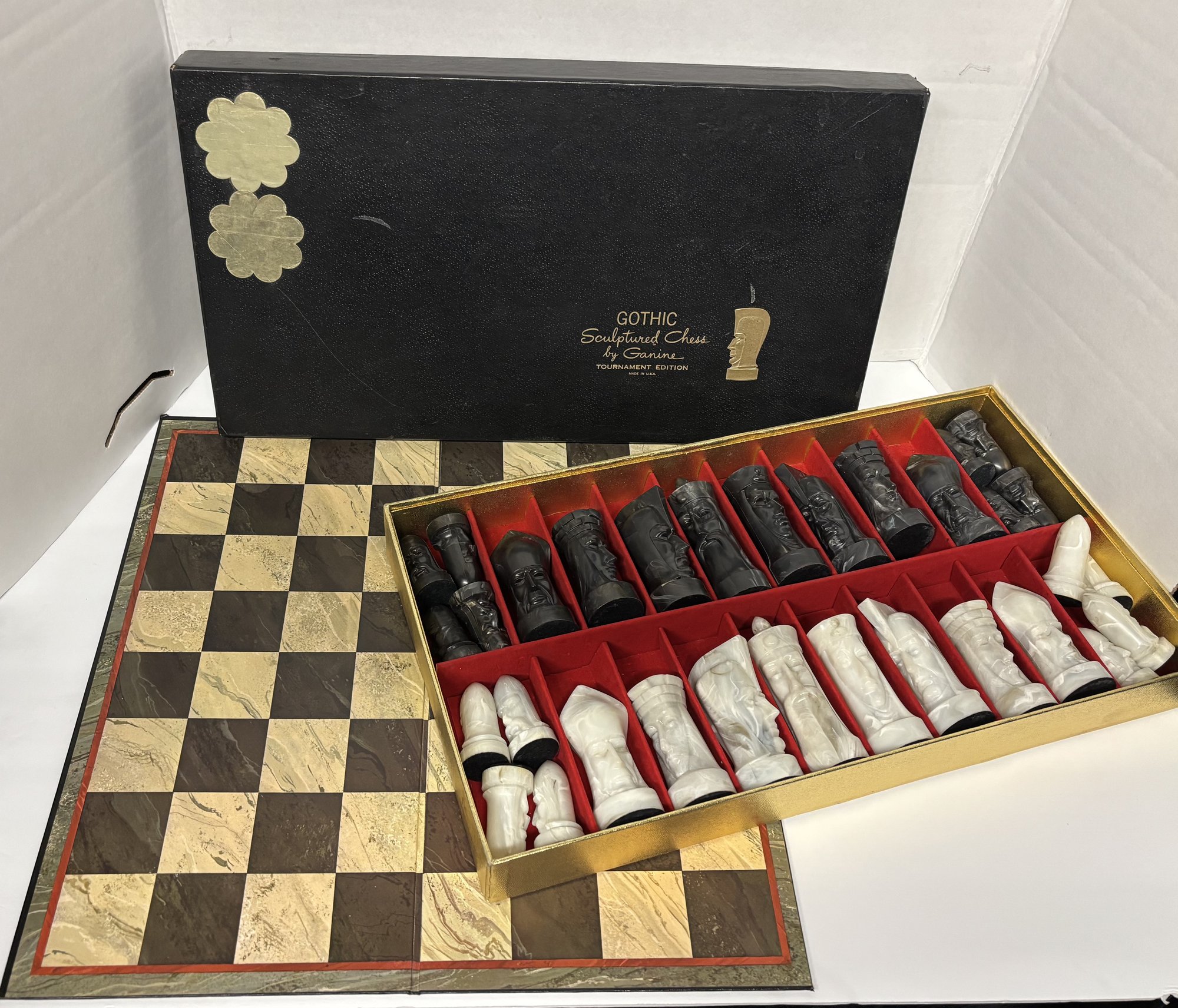 Designed by Russian Born sculptor Peter Ganine, this set features abstract gothic style sculptures in black and white plastic. Pacific Game Co, North Hollywood, CA. #1471 Original Box, board is included. King/Queen are 4" high, Pawns are 2.5" high. Board is 16"x16"