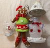 Includes a glass globes, battery powered ornament with gift box, a candle powered snowman lamp and a ginger bread girl shelf stuffy.