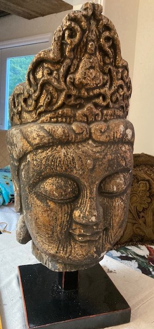 This large old wooden Buddha head with gold gilding over black-ish paint. Head alone 21” H x 12” W, with detachable wooden base 28” H. Shows some wear for its age - but still a very impressive piece.