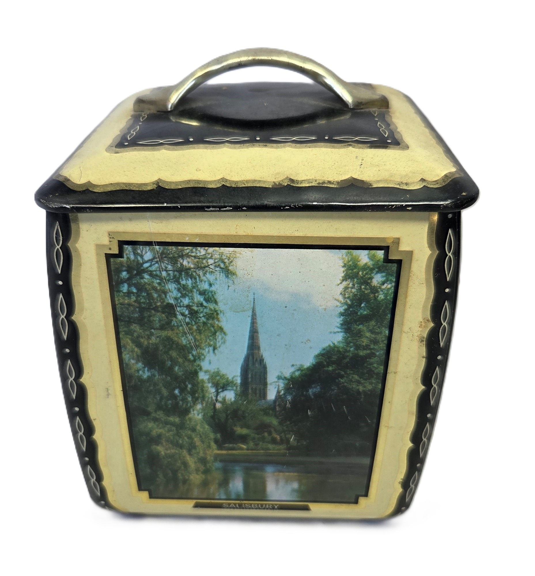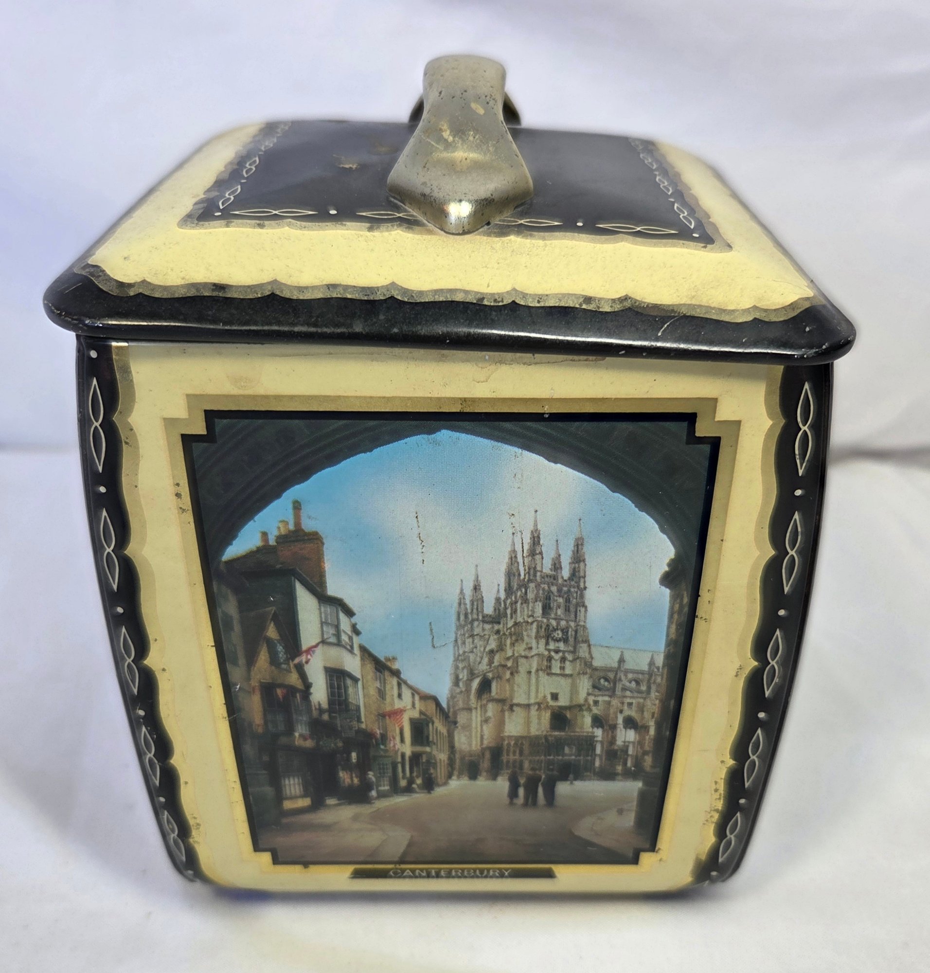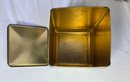 Vintage lidded tin from Sharp & Sons Ltd. Some dings and dents. Lid fits well. Approx 6" tall.