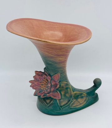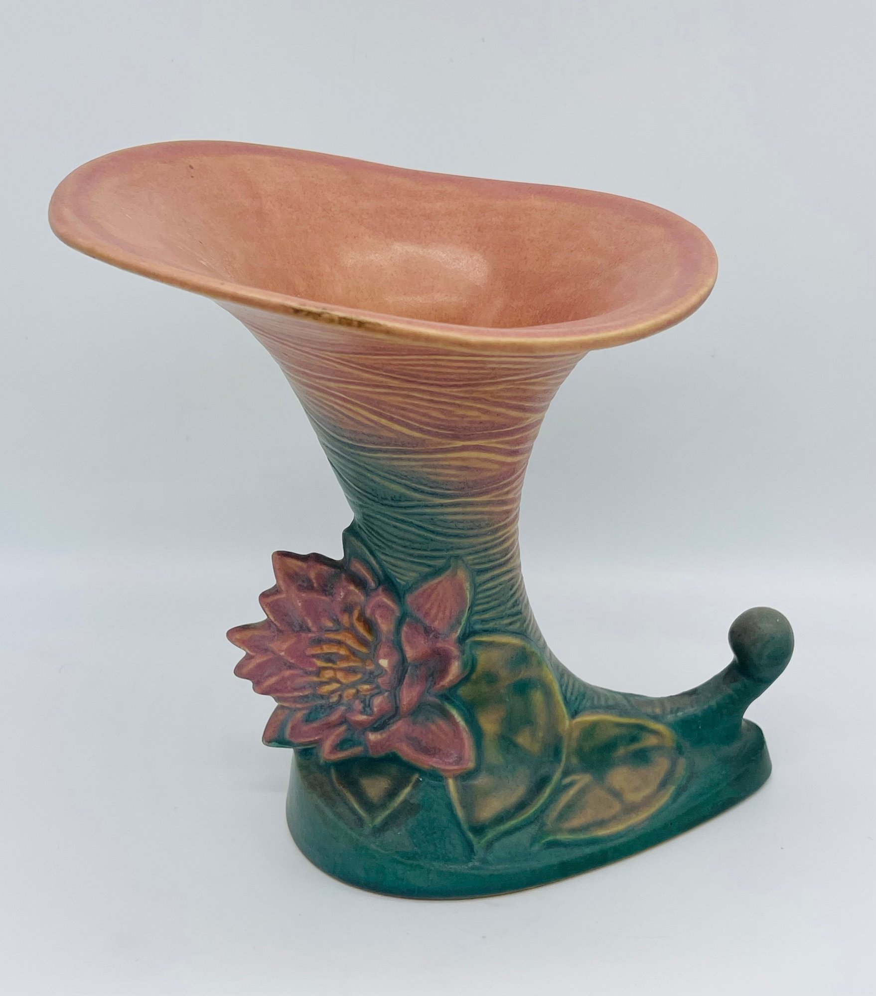 1943 Roseville Art Pottery Pink Water Lily Cornucopia Vase 178-8 8" in good condition with no chips or cracks.