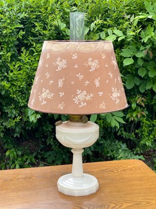 Outstanding example of an Aladdin Tall Lincoln Drape with Original Parchment Shade Alacite Uranium Glass Kerosene Oil Lamp with Model B Burner and Aladdin marked chimney that measures approximately 25 1/2" tall with chimney. Very hard to find one of these with the original existing parchment shade.