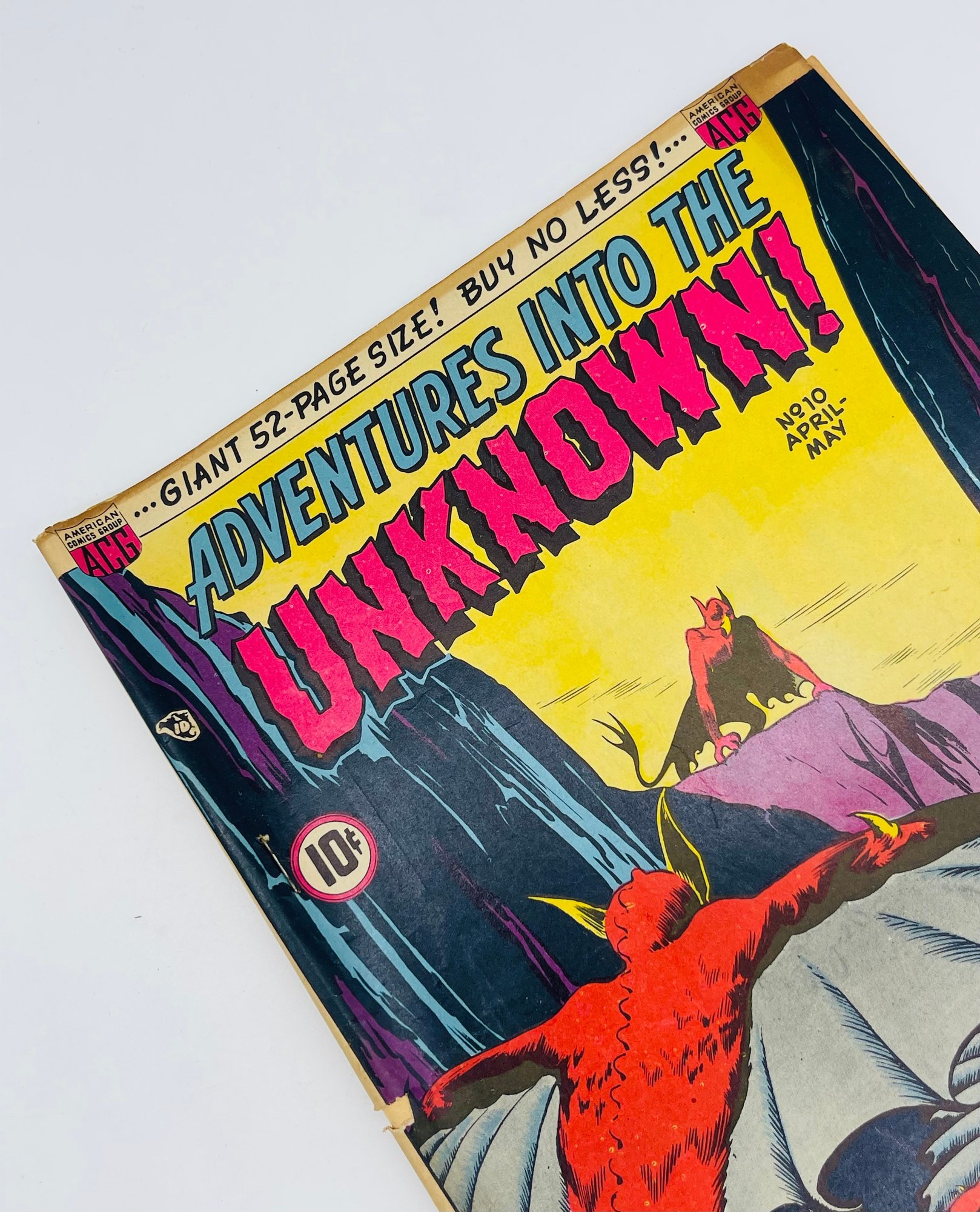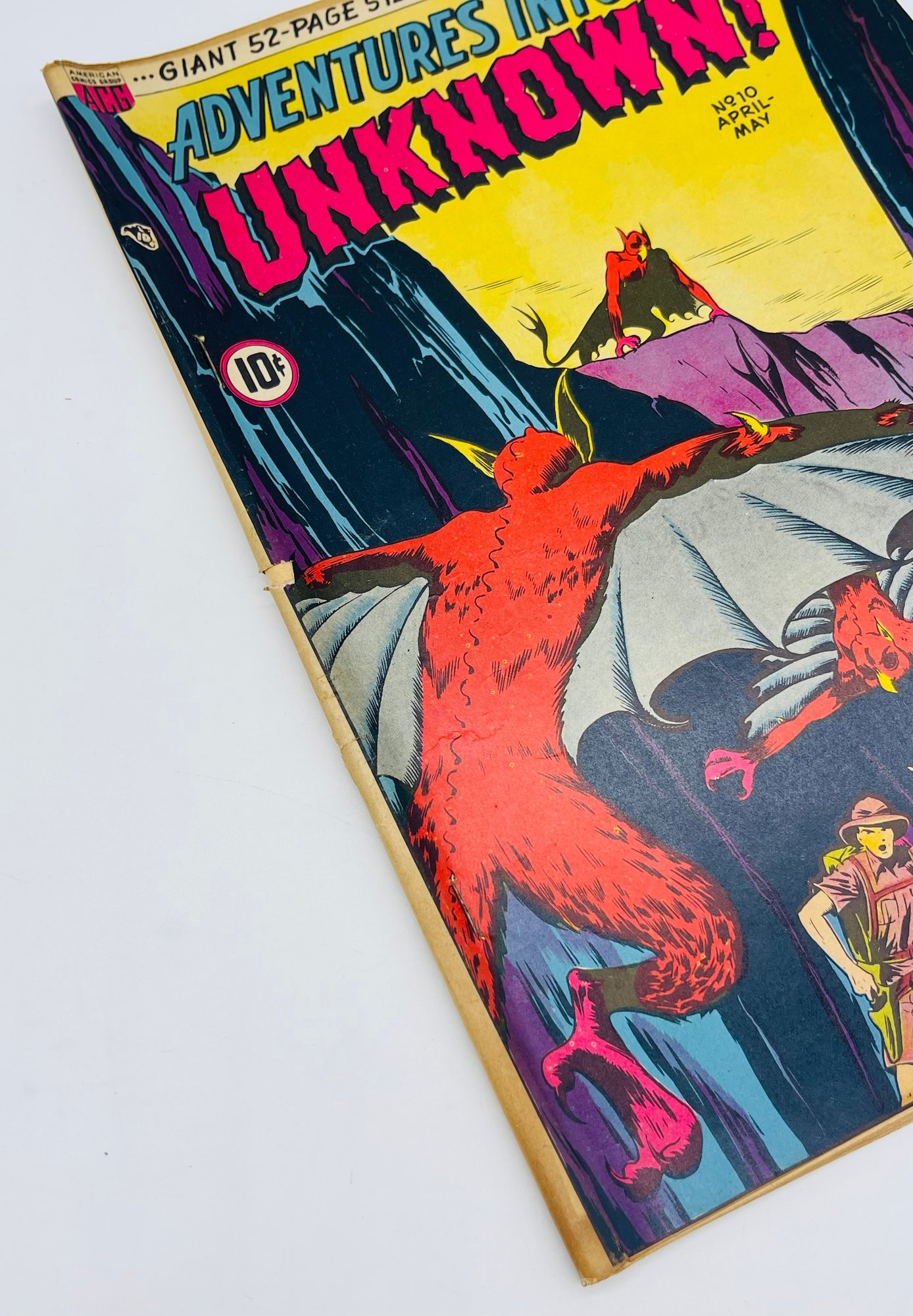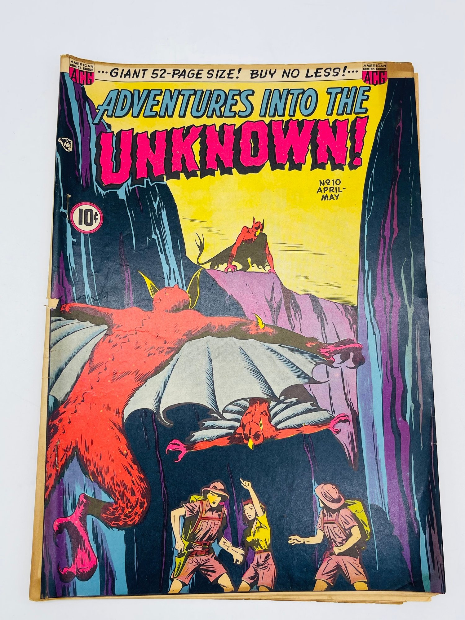 Up for sale in this NO RESERVE auction is a Vintage 10 Cent Golden Age Comic Book Adventures Into The Unkown Issue No. 10 April May 1950. Published by American Comics Group ACG. All pages are intact with cover attached and please view close up photos to help in condition detail.