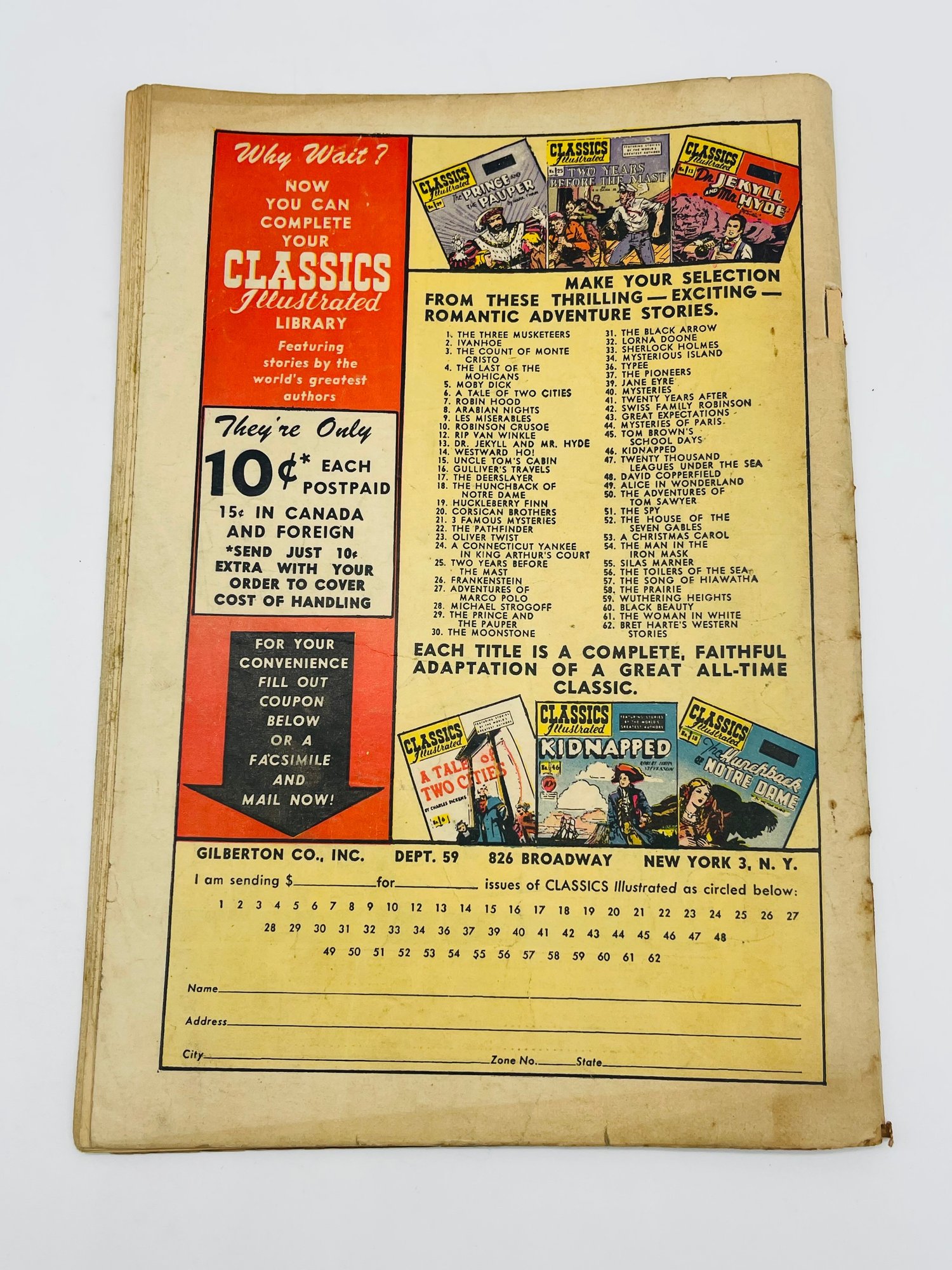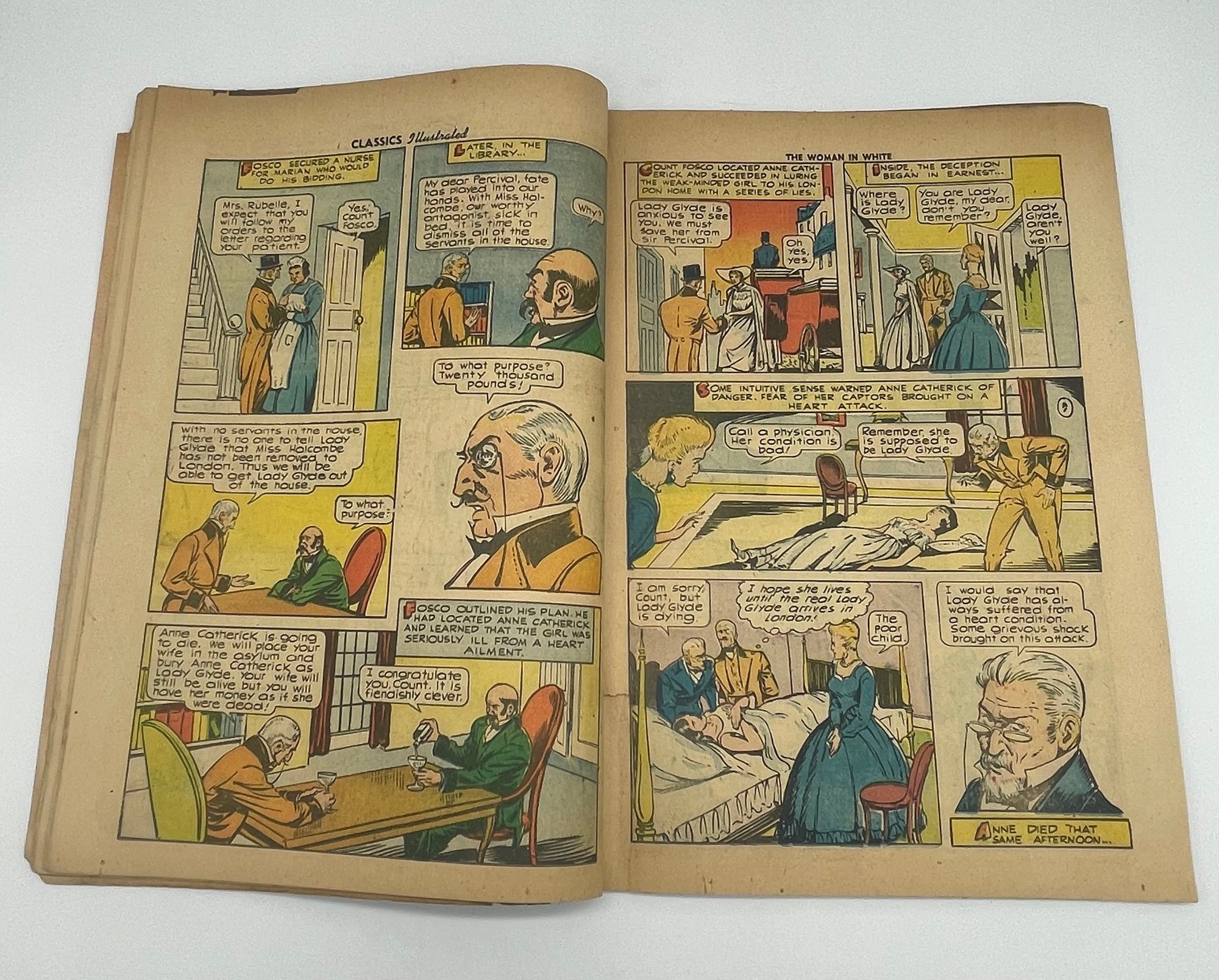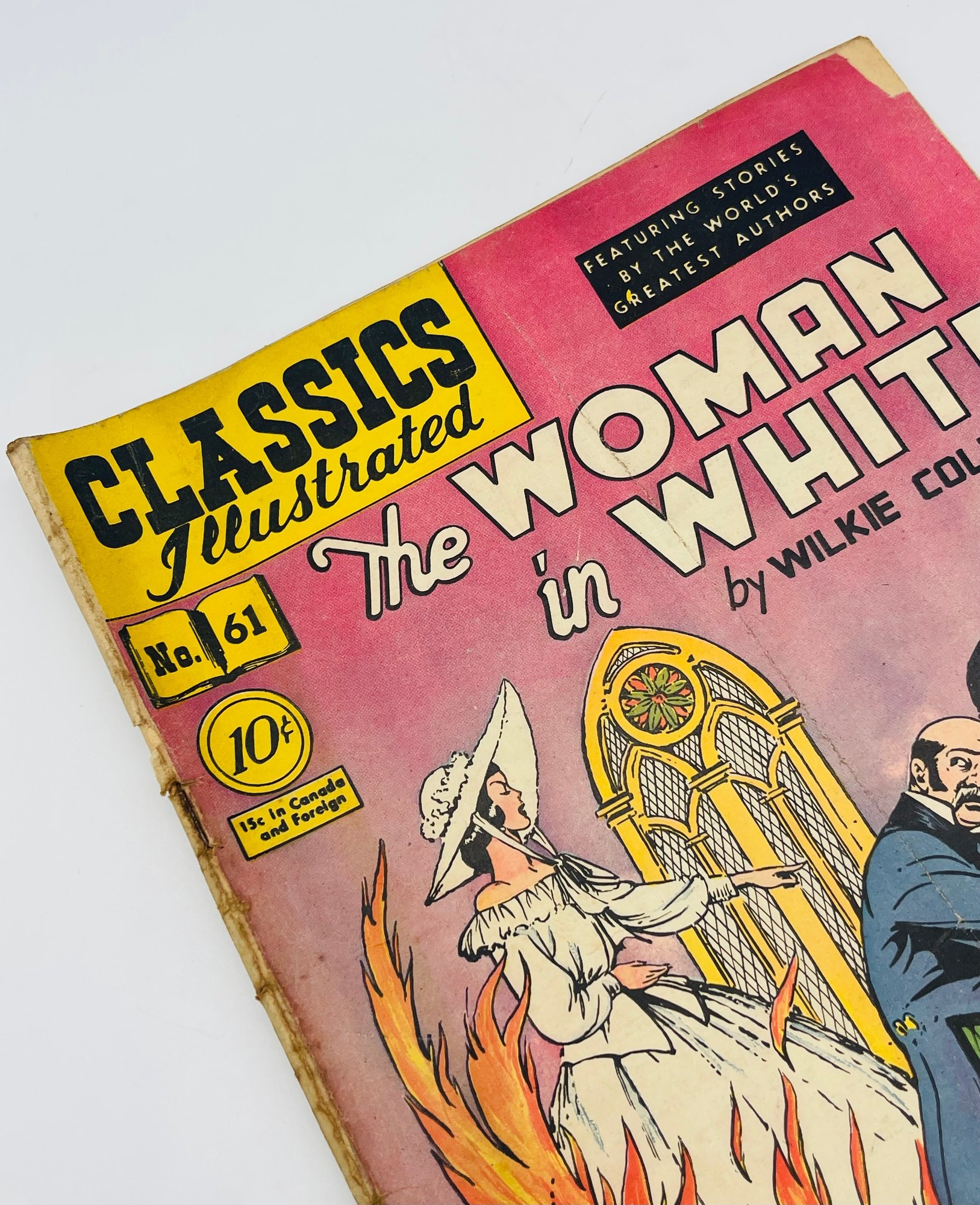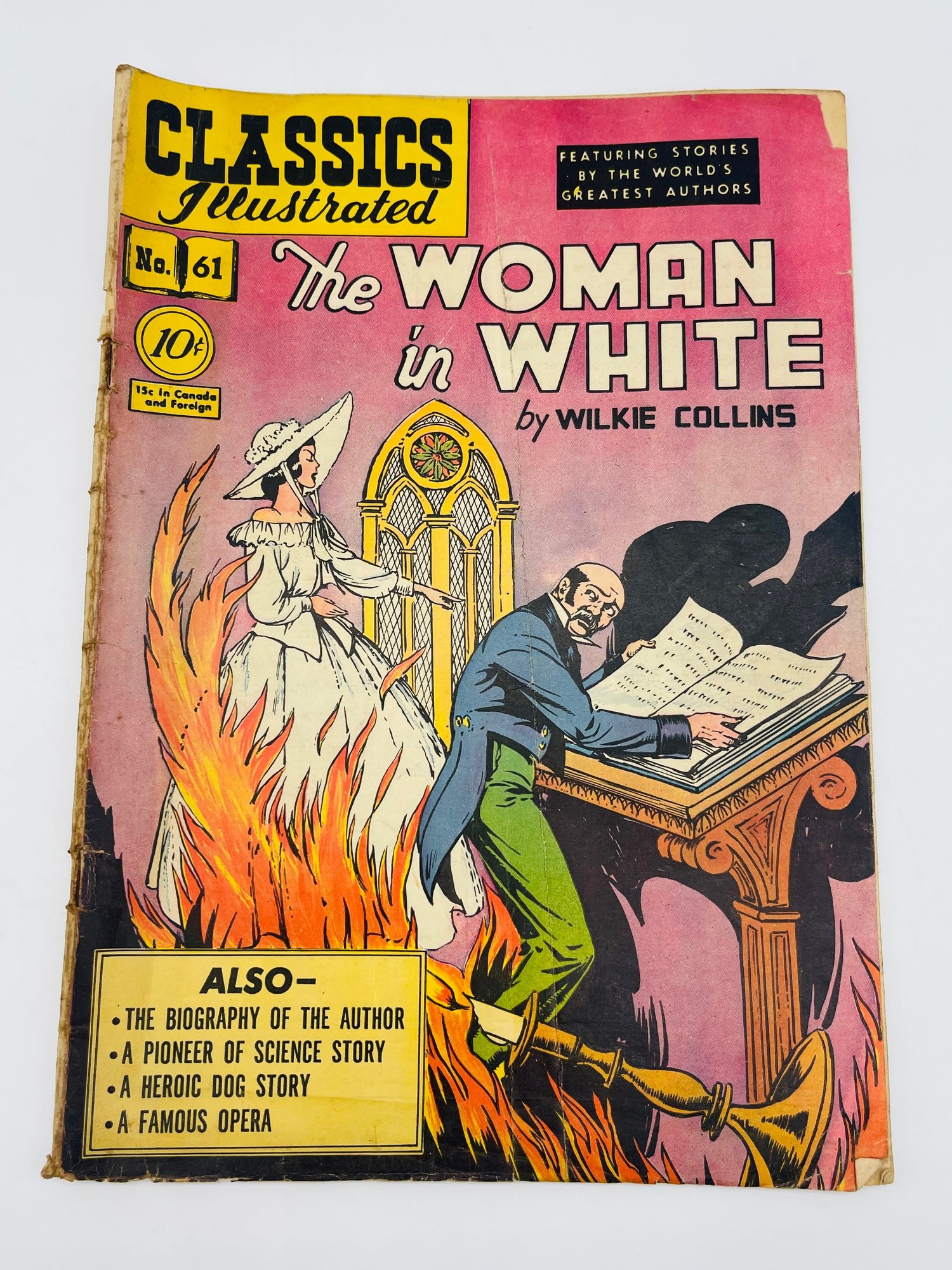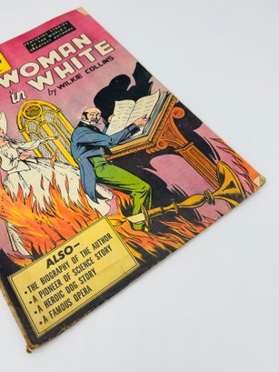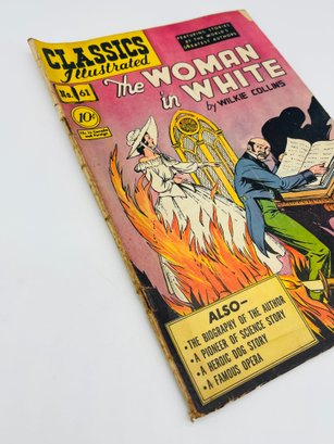 Up for sale in this NO RESERVE auction is a Vintage 10 Cent Golden Age Comic Book Classic Illustrated The Woman In White by Wilkie Collins Issue No. 61 July 1949. Published by Gilbertson Co. Publisher. All pages are intact with cover attached and please view close up photos to help in condition detail.