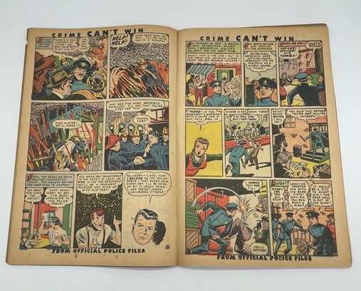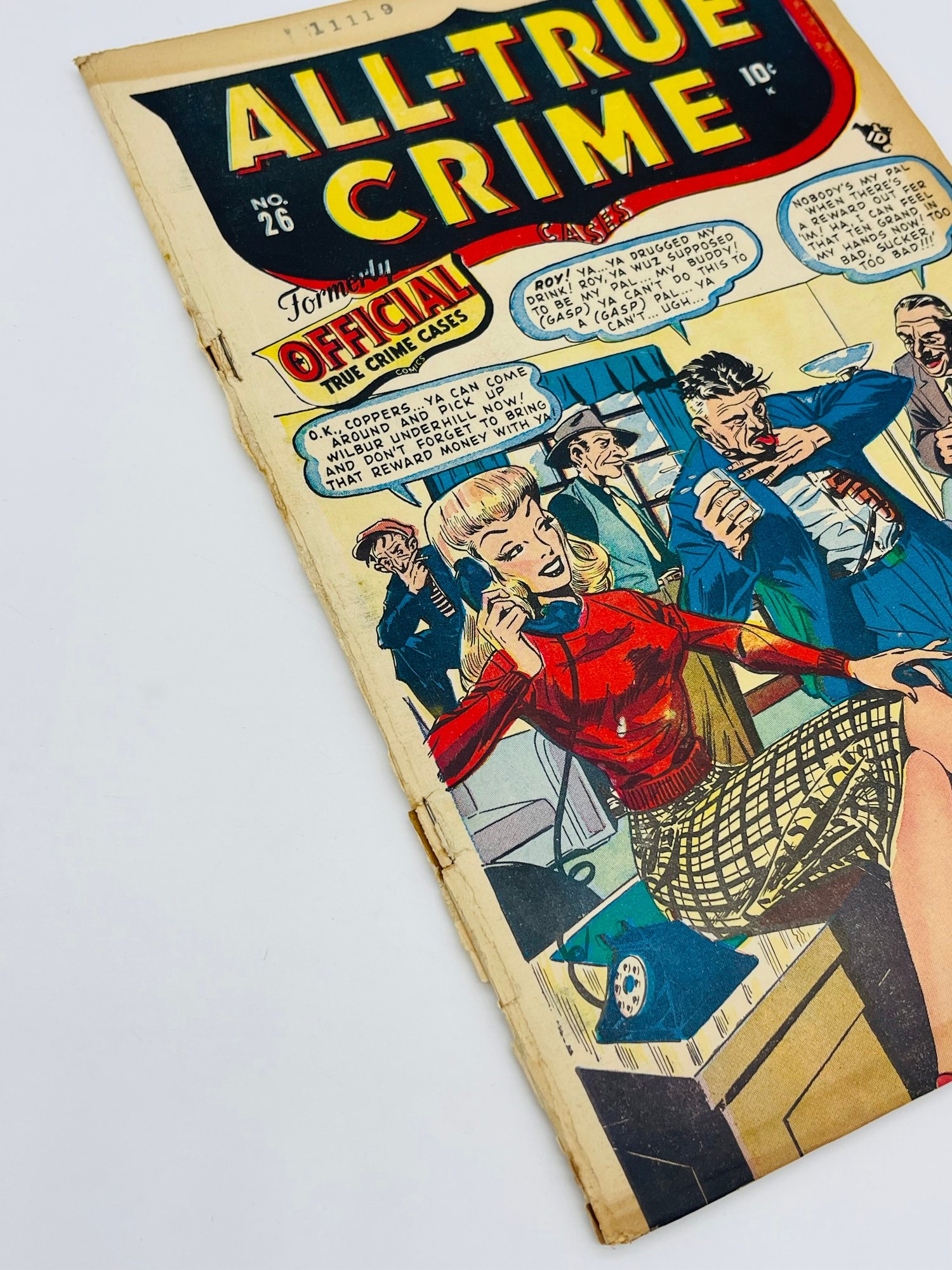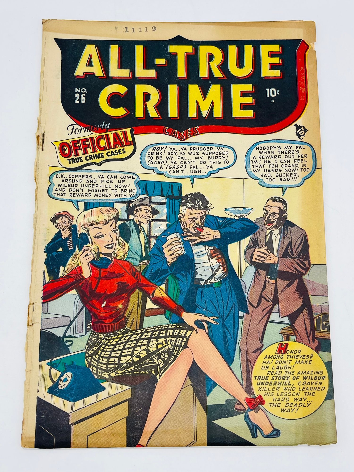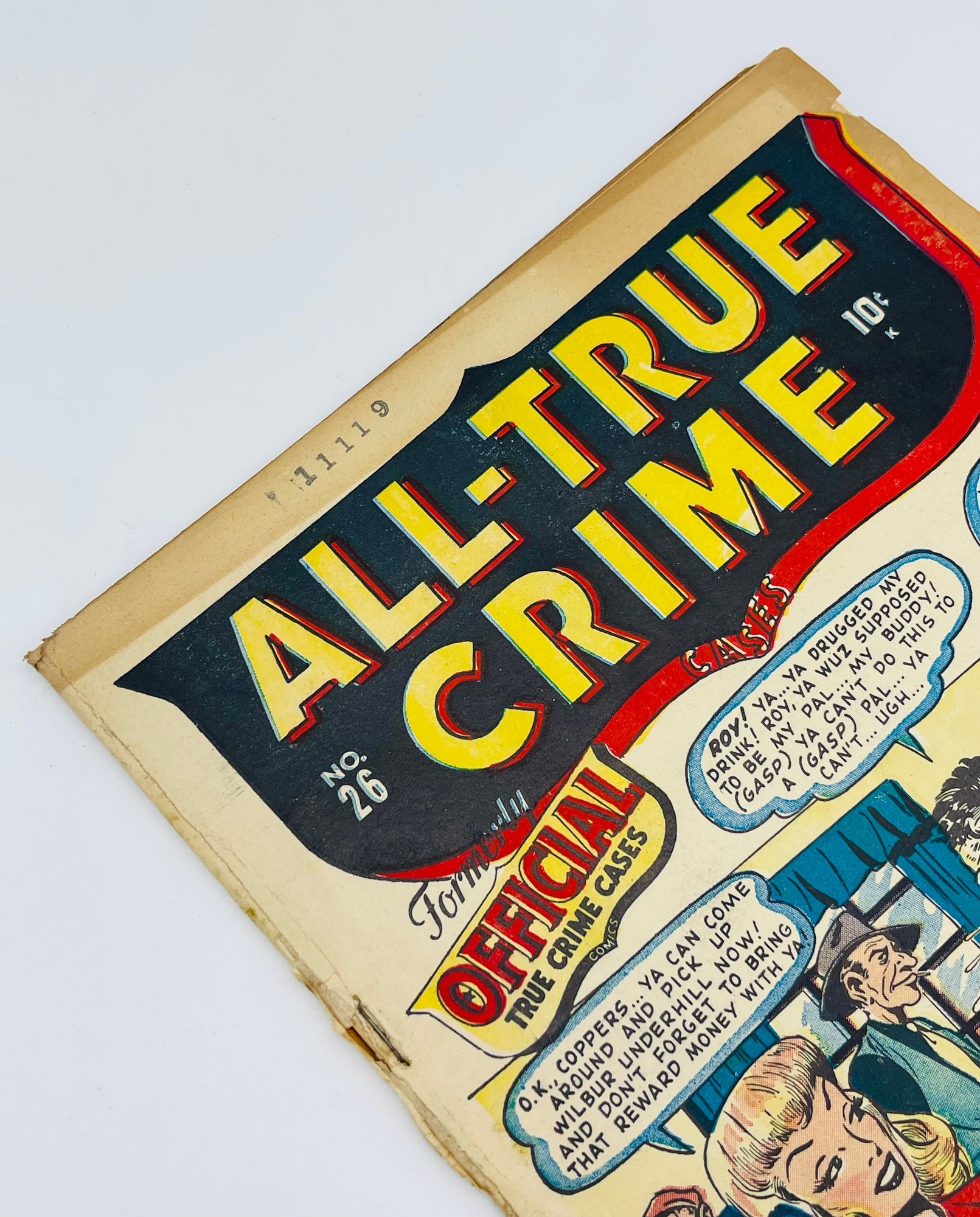 Up for sale in this NO RESERVE auction is a Vintage 10 Cent Golden Age Comic Book Formerly Official True Crime Cases All True Crime Cases Issue No. 26 February 1948. Published by Atlas Marvel. Cover Art by Syd Shores. Real story of bank robber Wilbur Underhill Tri State Terror or Mad Dog. All pages are intact with cover attached and please view close up photos to help in condition detail.