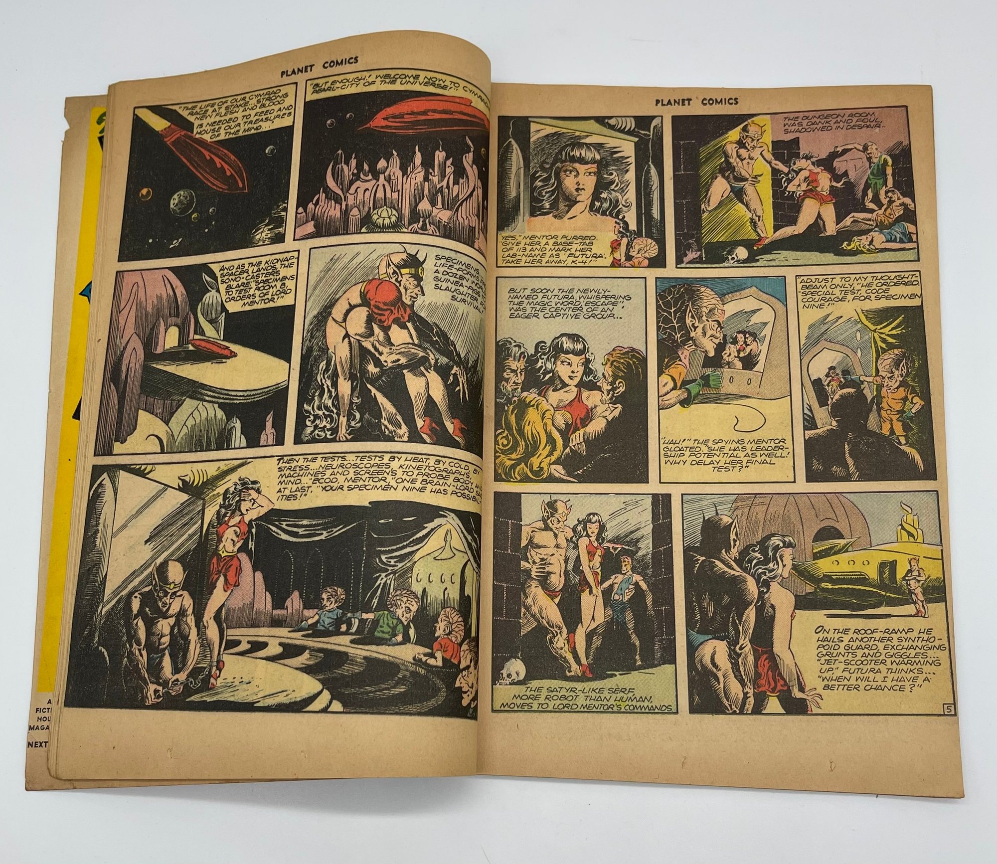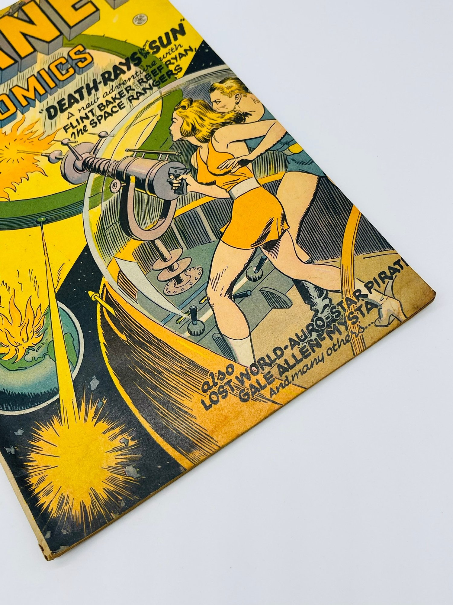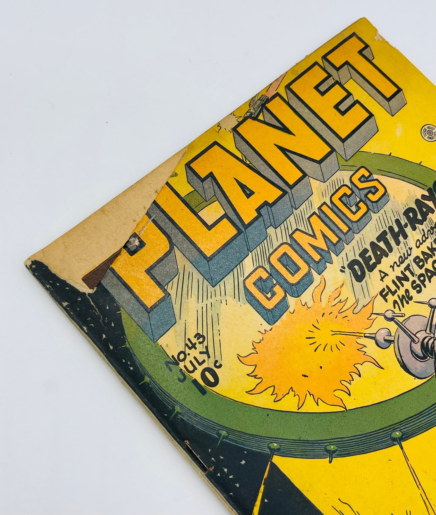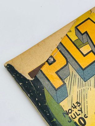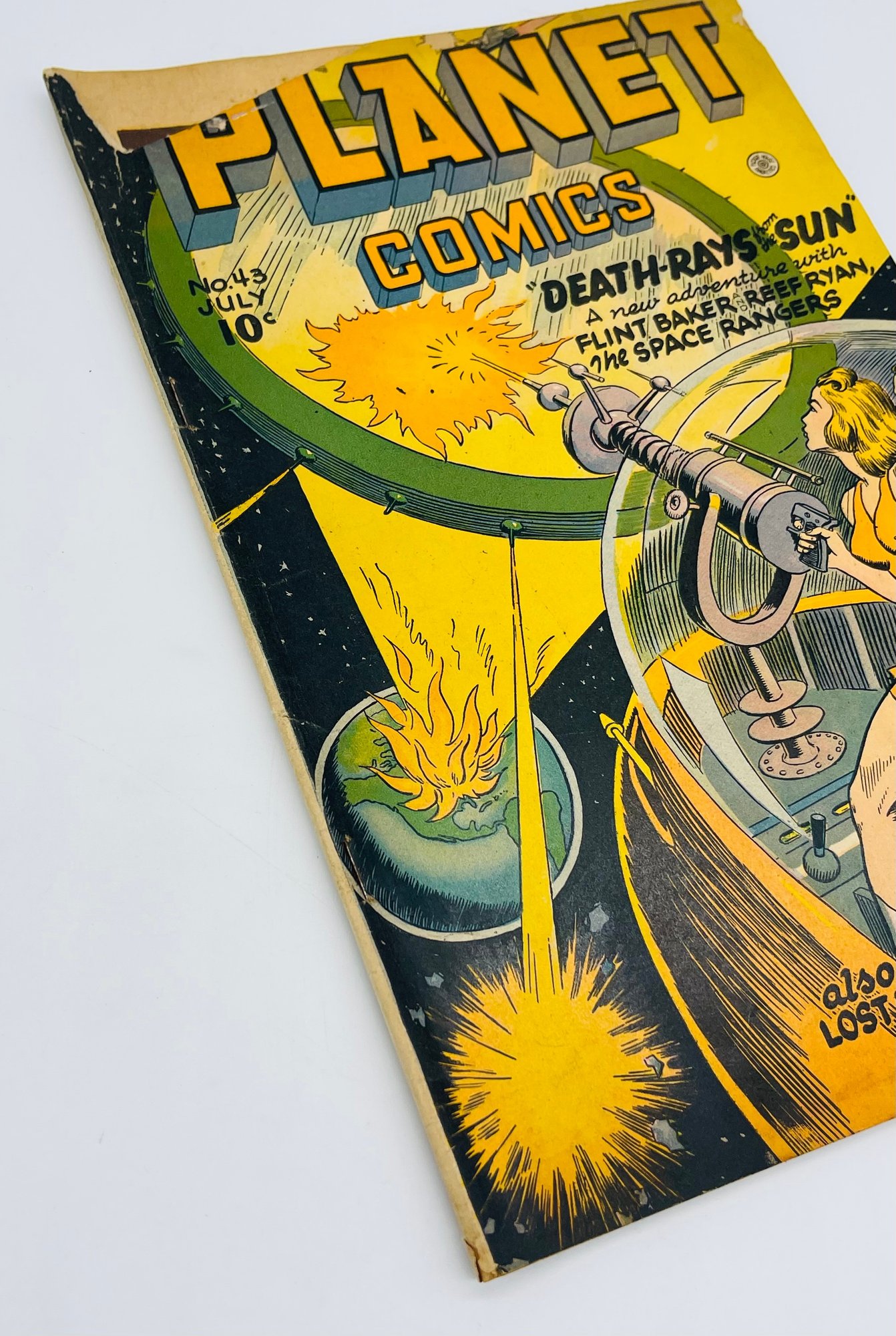 Up for sale in this NO RESERVE auction is a Vintage 10 Cent Golden Age Comic Book Planet Comics Death Rays from the Sun Issue No. 43 1946. Published by Fiction House. With appearances by Flint Baker, Reef Ryan, The Space Rangers, Mysta of the Moon, Auro Lord of Jupiter and the debut of Futura. Cover Art by Joe Doolin. All pages are intact with cover attached and please view close up photos to help in condition detail.