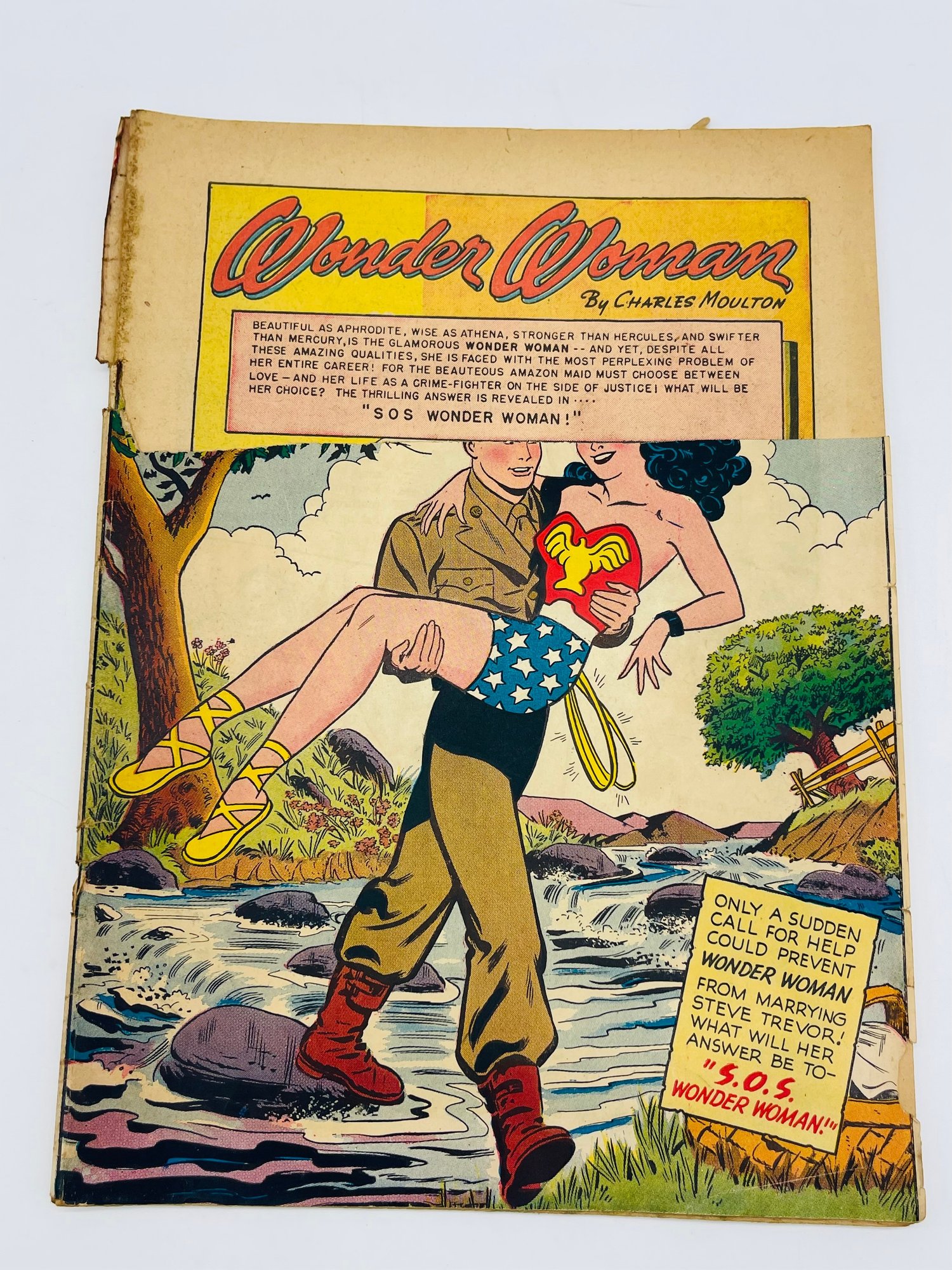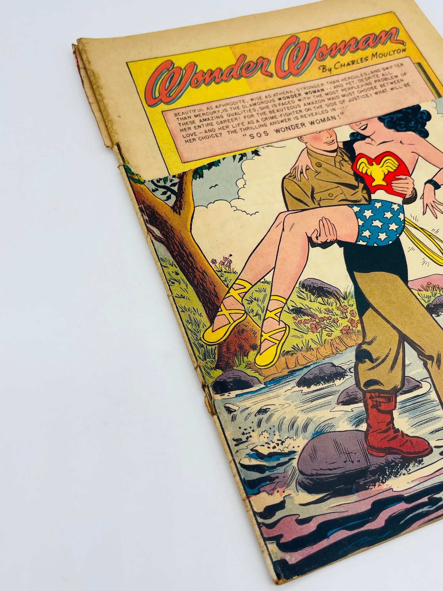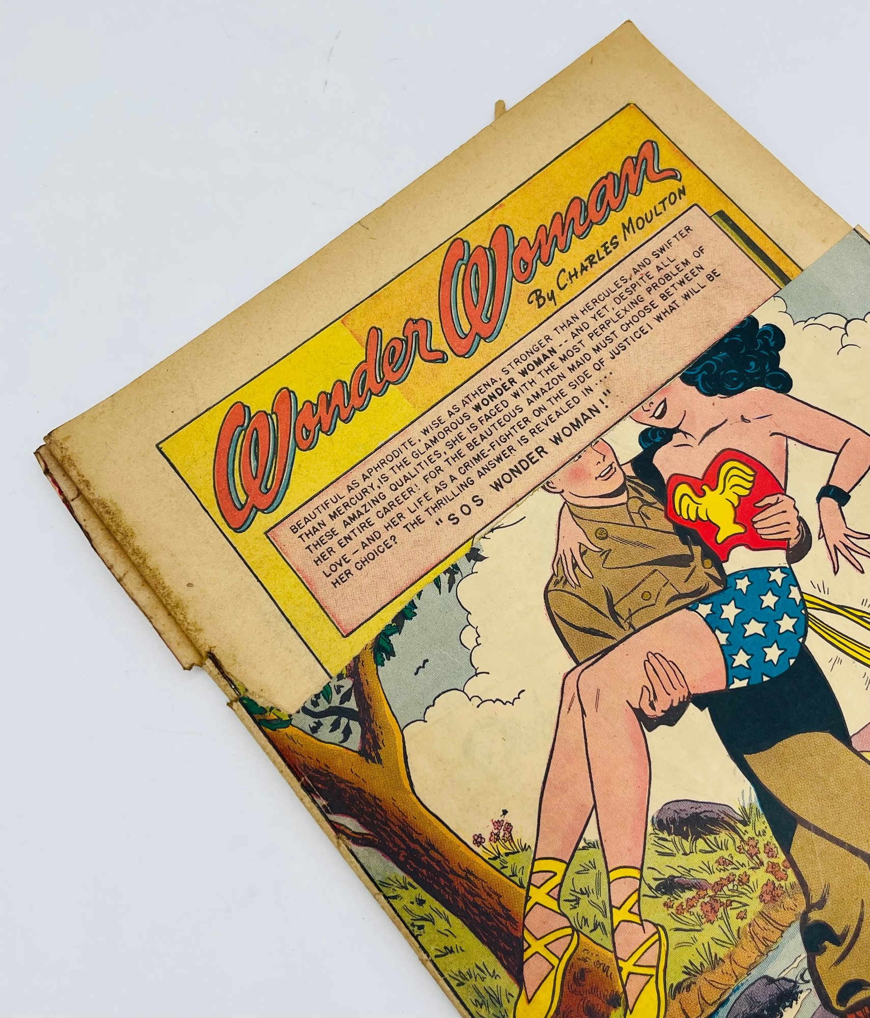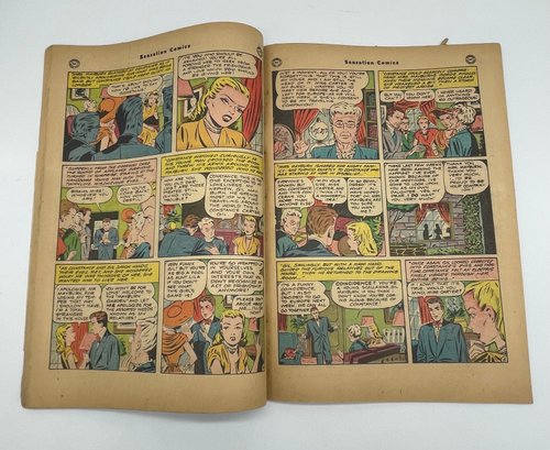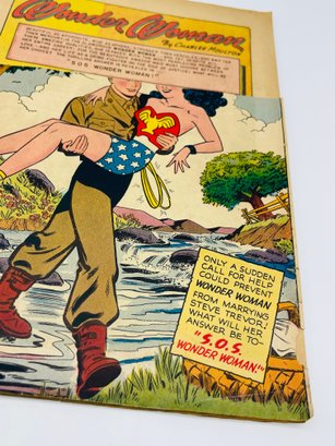 Up for sale in this NO RESERVE auction is a Vintage 10 Cent Golden Age Comic Book Sensation Comics Wonder Woman Soldier DC Comics Issue No. 94 November 1949. Published by DC Comics. All pages are intact with cover attached, but top quarter portion has been tore off and missing and please view close up photos to help in condition detail.