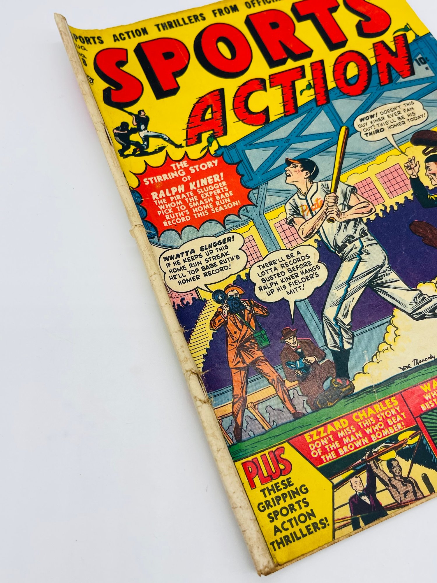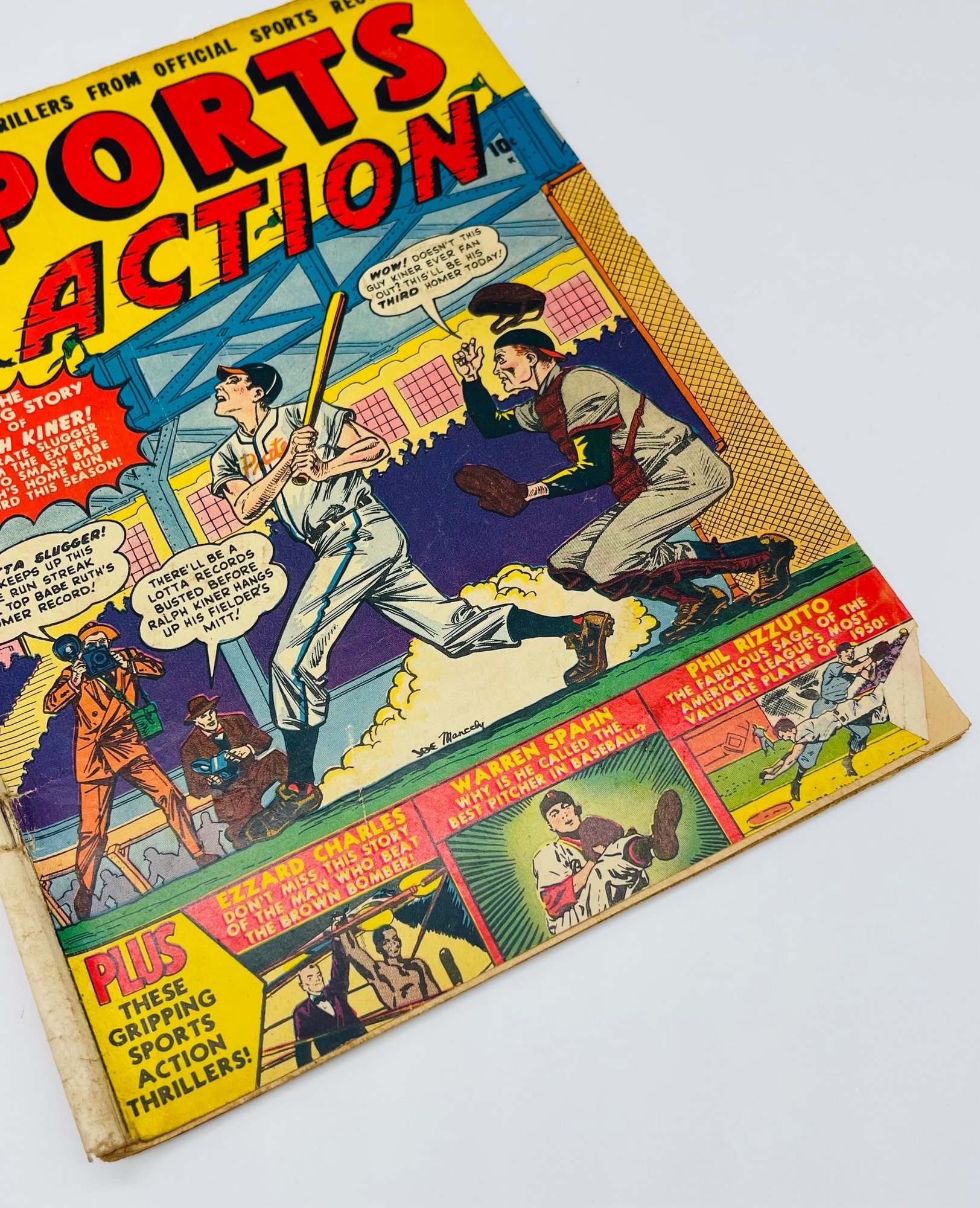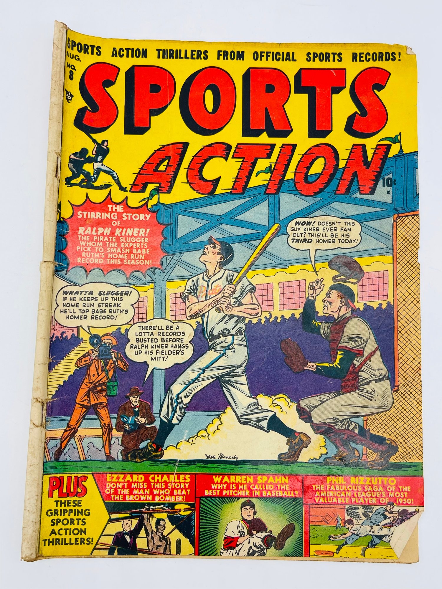 Up for sale in this NO RESERVE auction is a Vintage 10 Cent Golden Age Comic Book Sports Action No. 8 August 1951. Featured Athletes Ralph Kiner, Ezzard Charles, Warren Spahn, Phil Rizzuto, Dimaggio. Published by Atlas Comics Marvel. All pages are intact with cover attached and please view close up photos to help in condition detail.