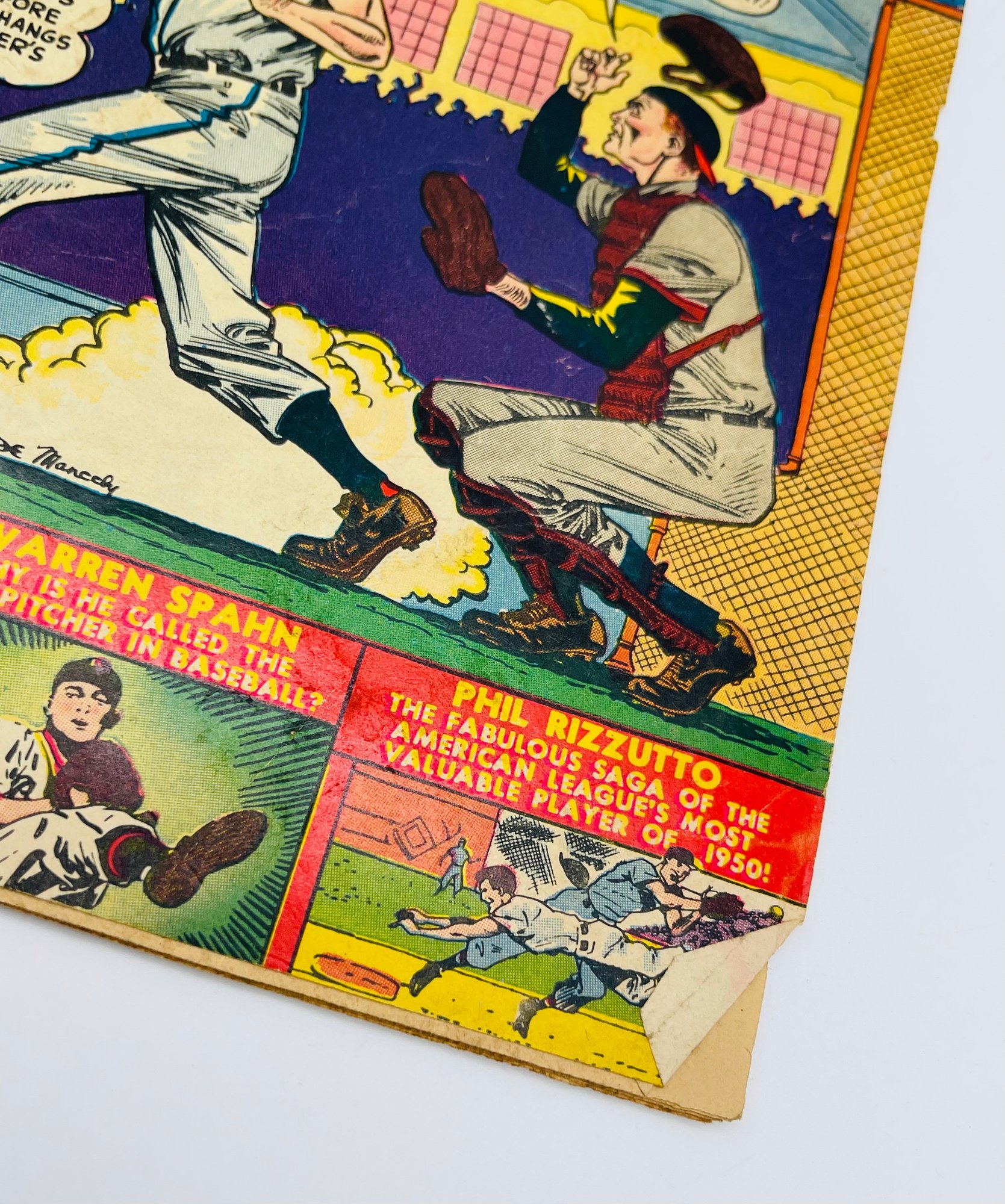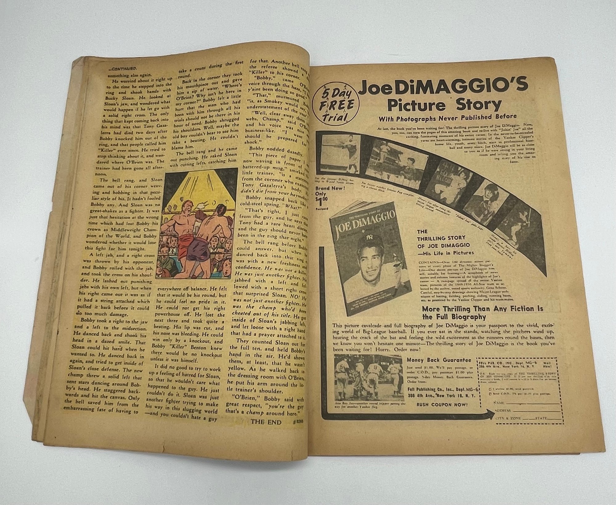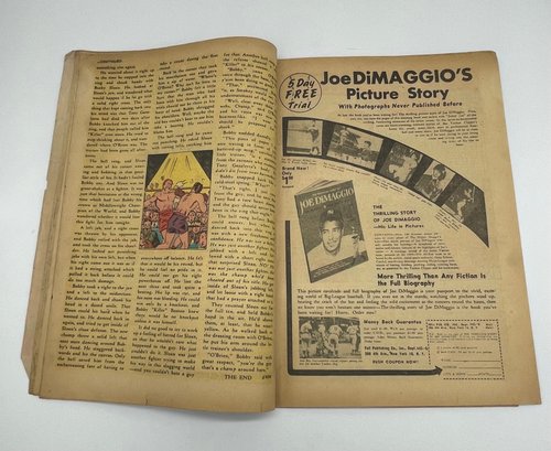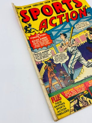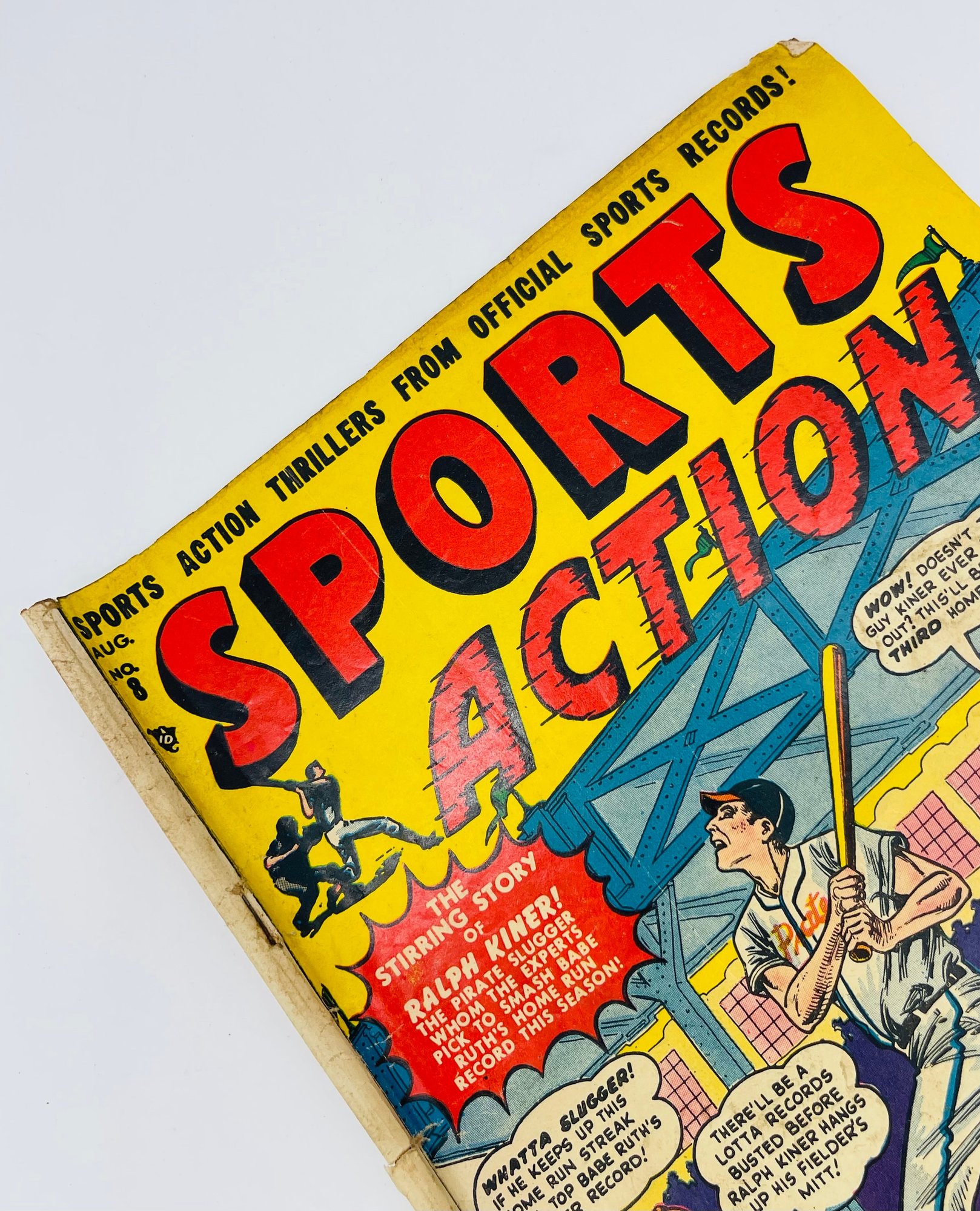 Up for sale in this NO RESERVE auction is a Vintage 10 Cent Golden Age Comic Book Sports Action No. 8 August 1951. Featured Athletes Ralph Kiner, Ezzard Charles, Warren Spahn, Phil Rizzuto, Dimaggio. Published by Atlas Comics Marvel. All pages are intact with cover attached and please view close up photos to help in condition detail.