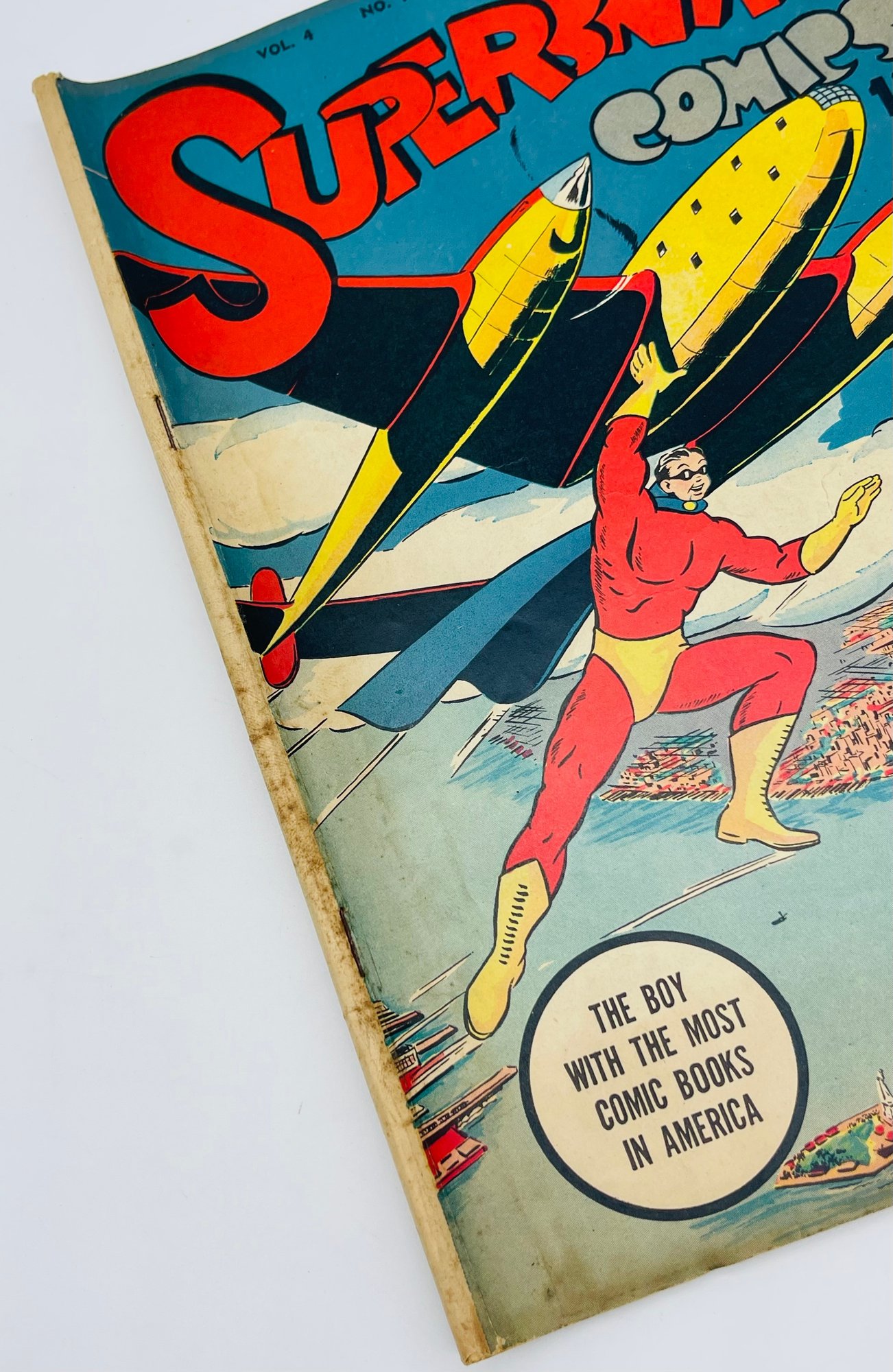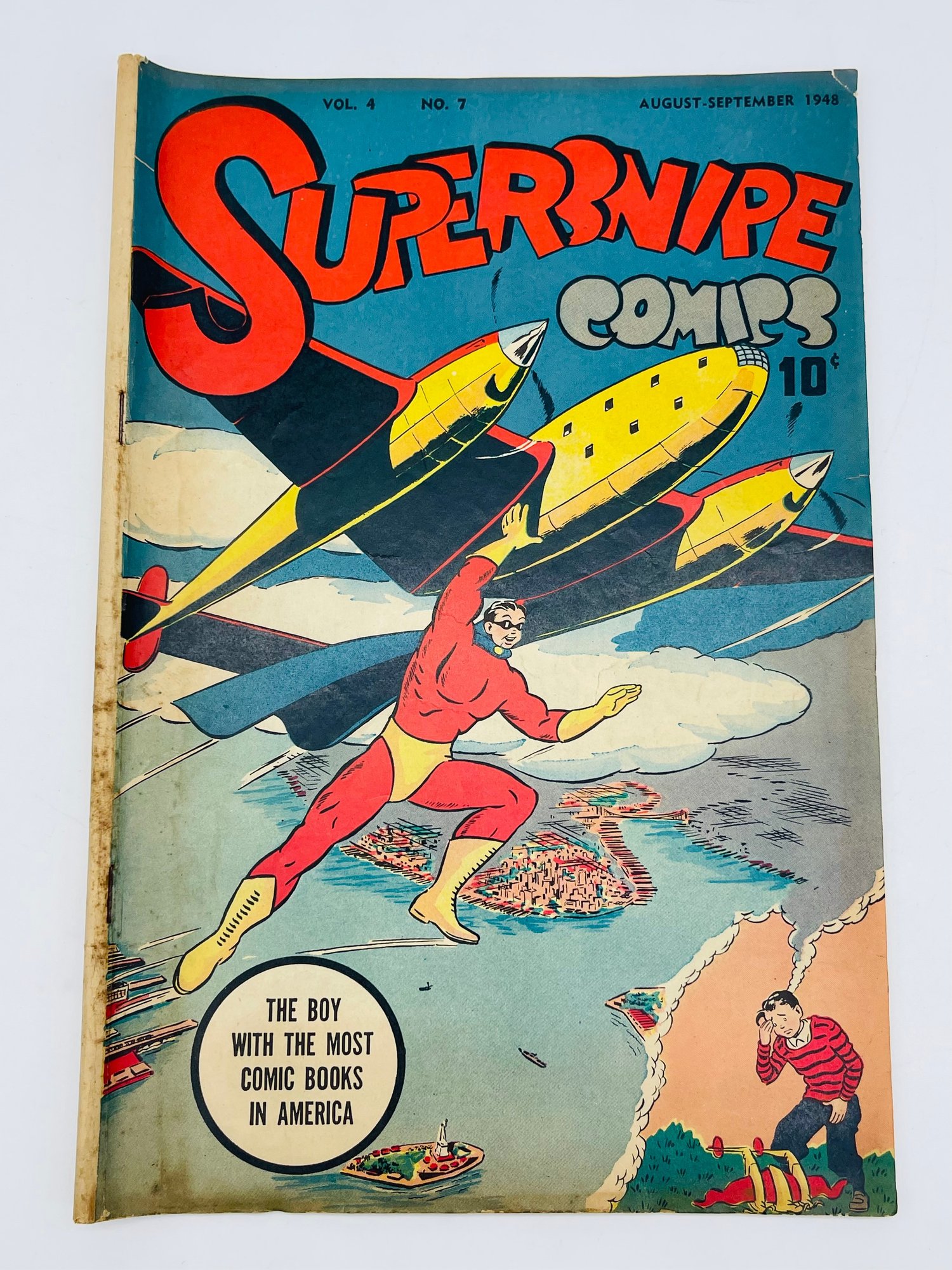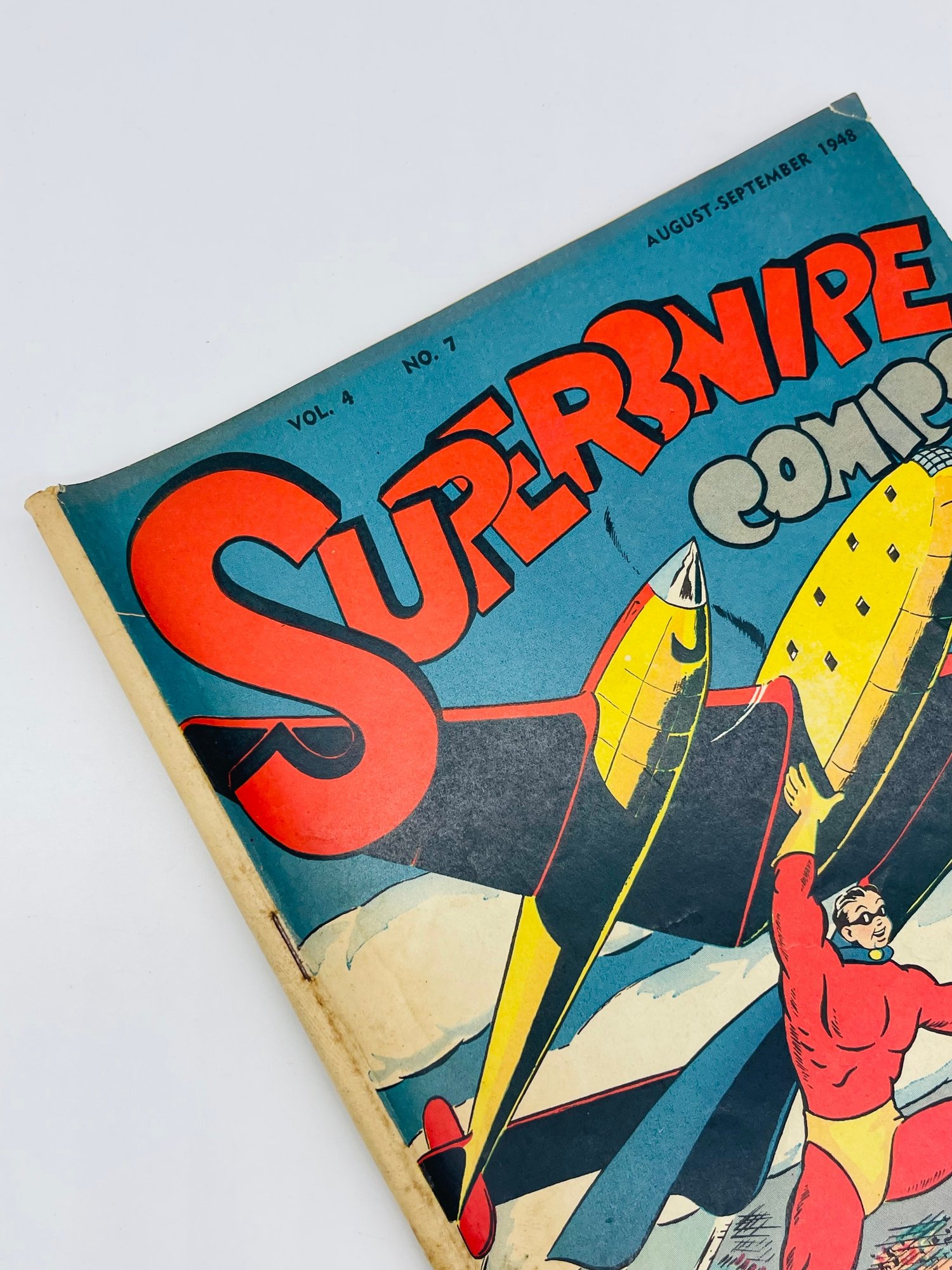Up for sale in this NO RESERVE auction is a Vintage 10 Cent Golden Age Comic Book Supersnipe Comics Koppy McFad The Boy With The Most Comic Books Issue No. 7 August September 1948. Published by Street & Smith Publications. All pages are intact with cover attached and please view close up photos to help in condition detail.
