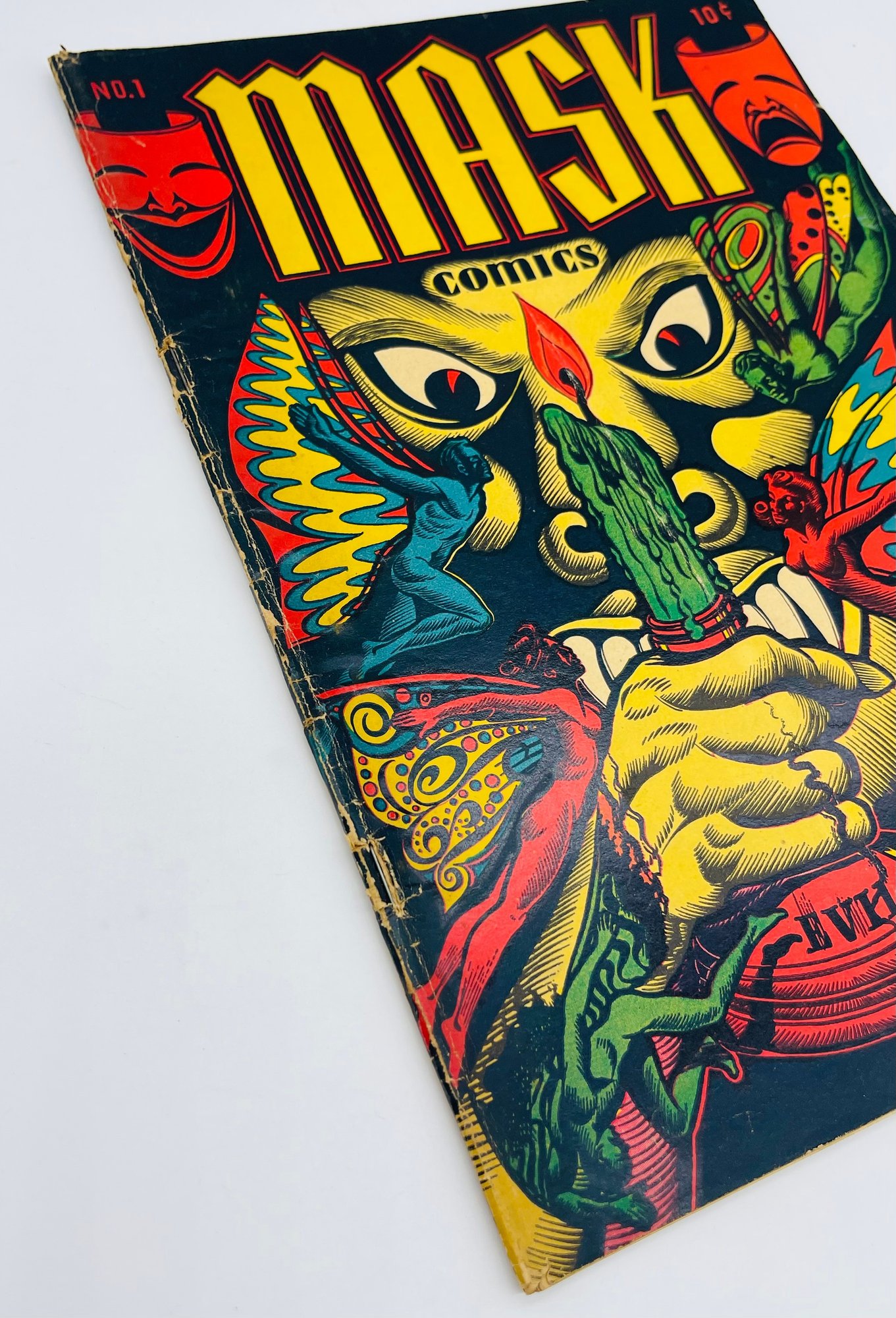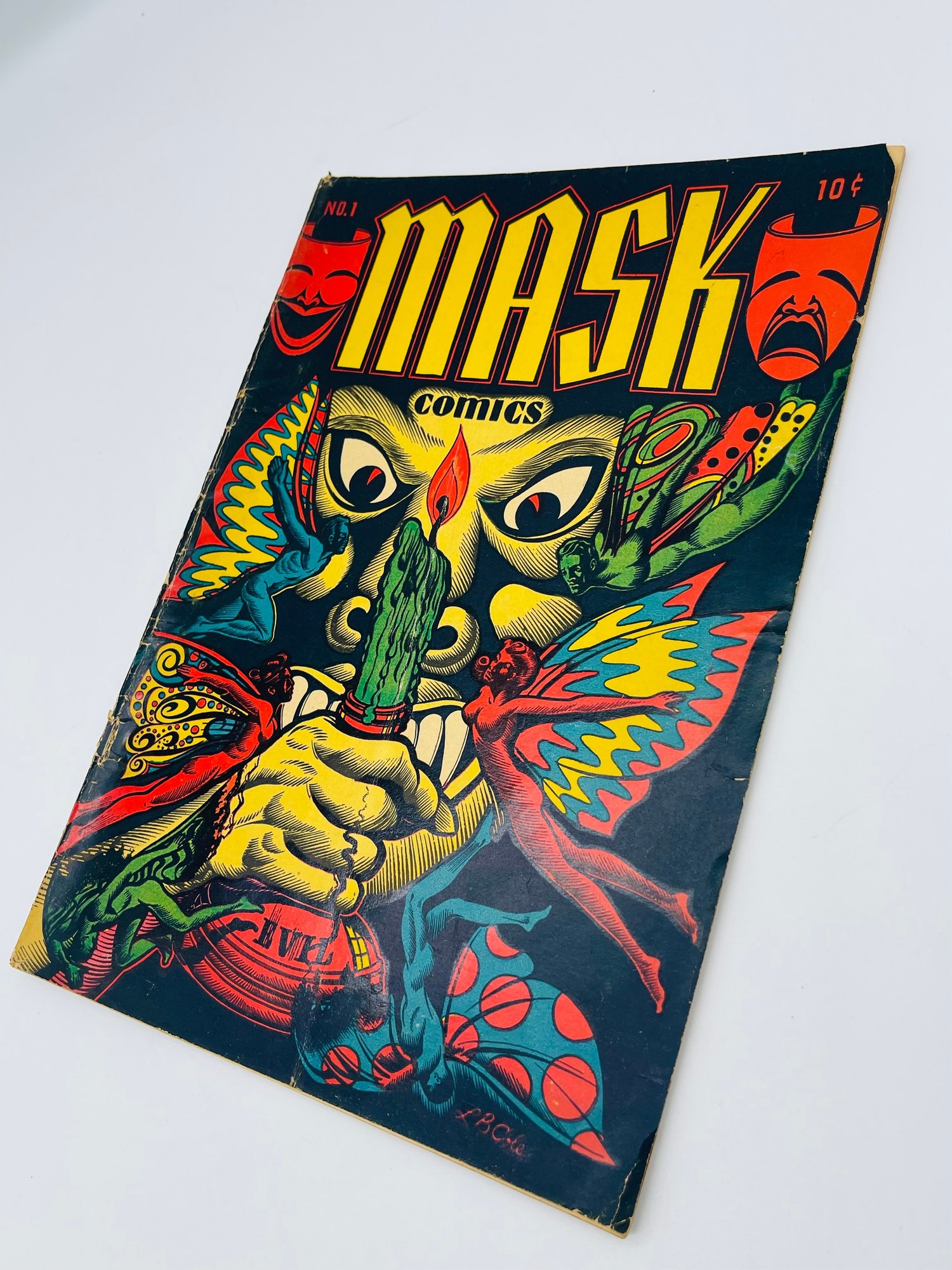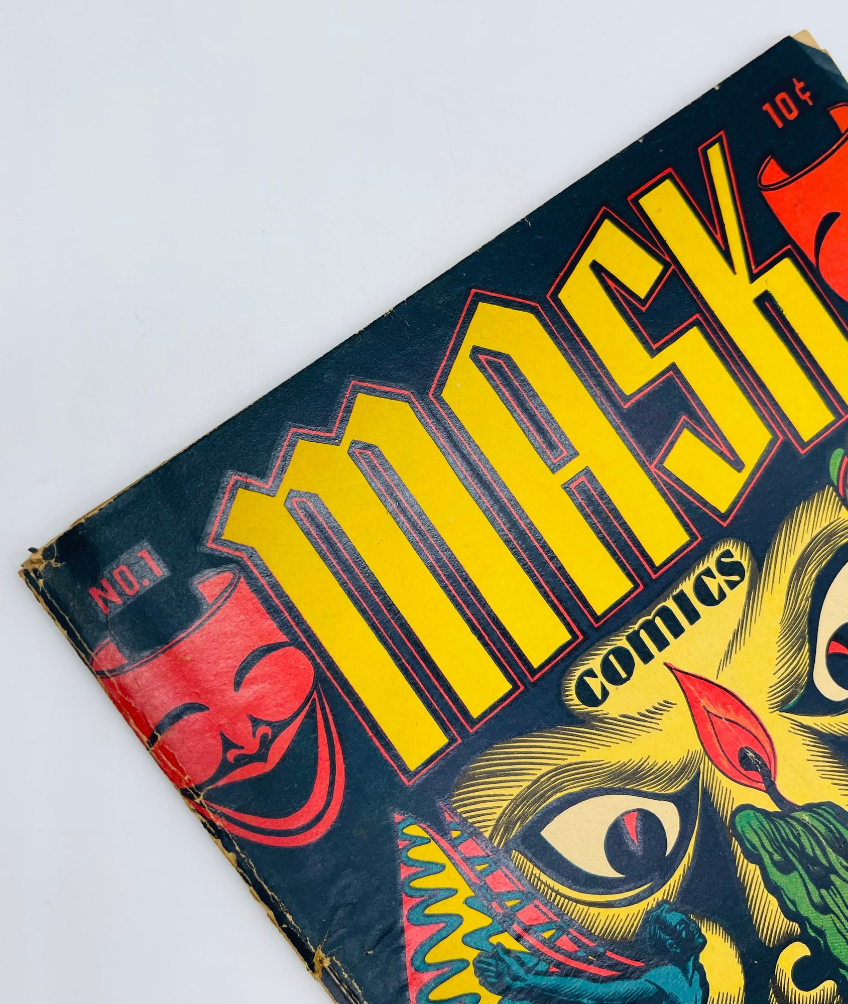 Up for sale in this NO RESERVE auction is a Extremely Rare and Highly sought after Vintage 10 Cent Golden Age Comic Book First Issue of Mask Comics Issue No. 1 1945. This is one of the most sought after Golden Age Comic Books for Collector's with less then 100 copies recorded in the CGC Comics Census with this for sure being an unknown existing copy as it has been hiding in the same estate home for the last 80 years. Published by Rural Home Publications. All pages are intact with cover attached and please view close up photos to help in condition detail. As stated this is what people would call a barn find in the car world, to us it looks to be in very good condition and better then some we are seeing at a 3.5, 4.0 rating but if you are a serious buyer that needs more photos, information, would like to do a face time call to view the piece or come see in person we more then welcome that so please contact the auction company on this or any of the comics posted for a viewing. Rare opportunity for this piece fresh out of a Missouri Estate that has been in the family for years.
