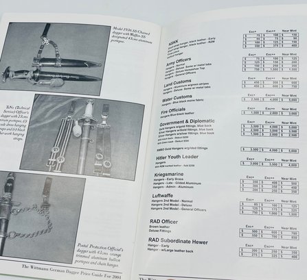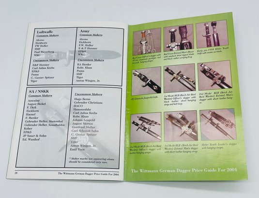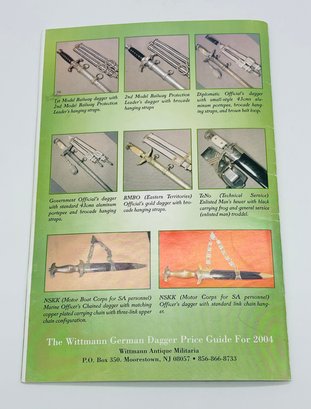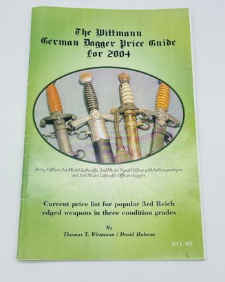 The Wittmann German Dagger Price Guide For 200+ 3rd Reich Edged Weapons By Thomas T. Wittmann Book. It is a sift bound book with 28 pages that is in good condition.