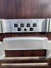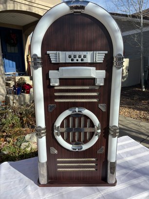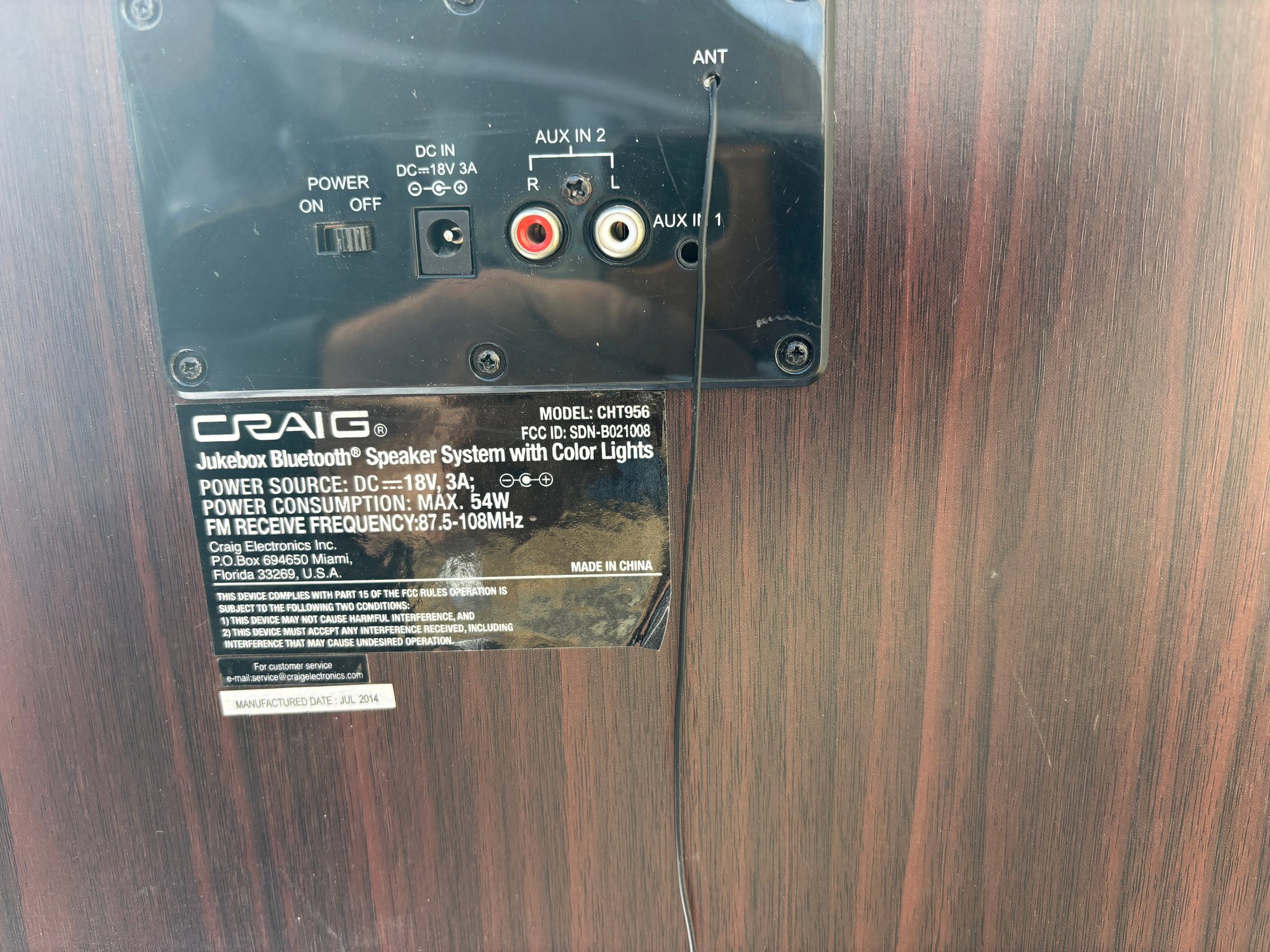 Retro wood-style cabinet and color-changing LED lighting.