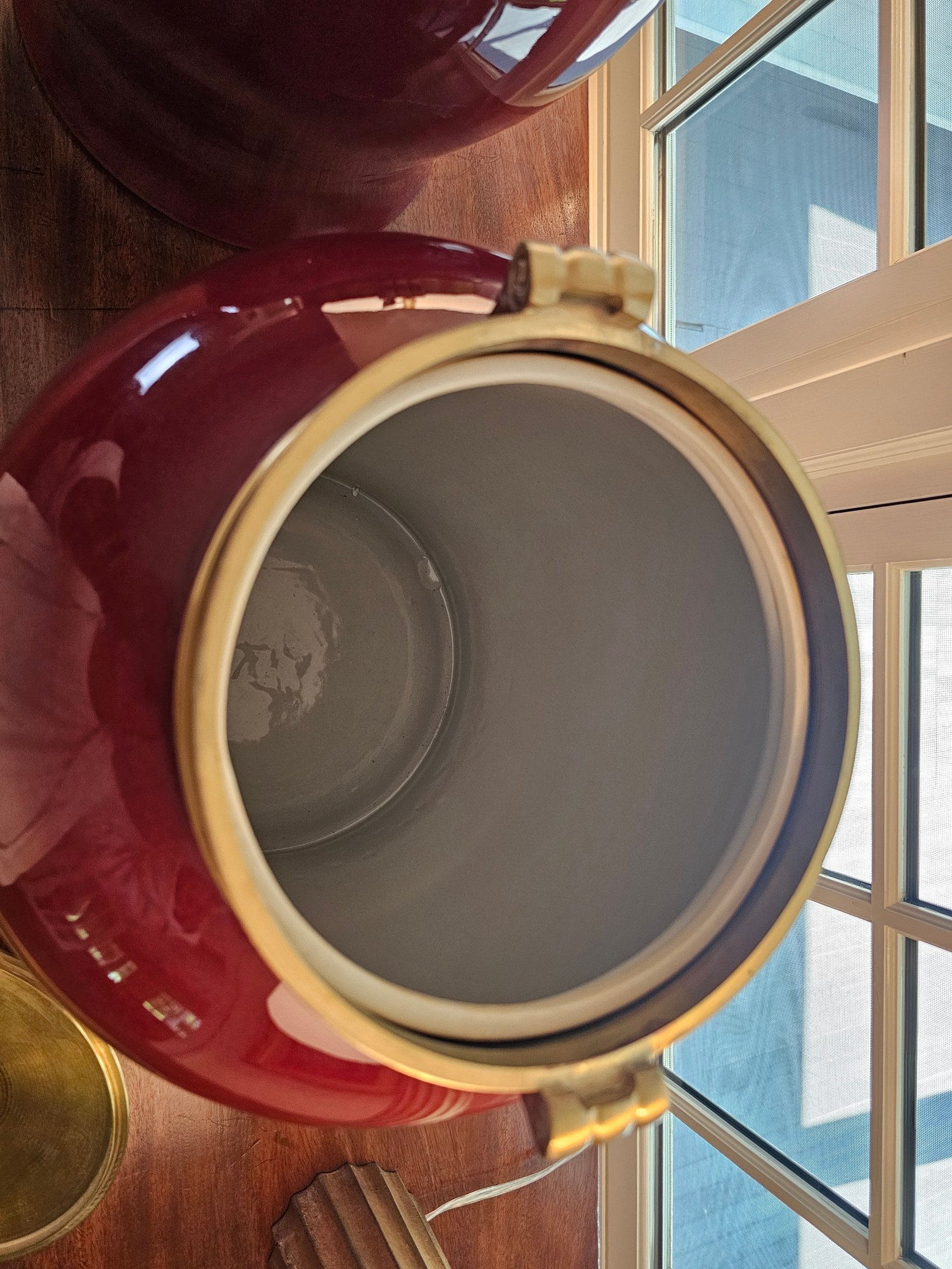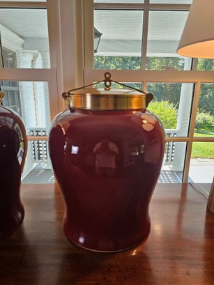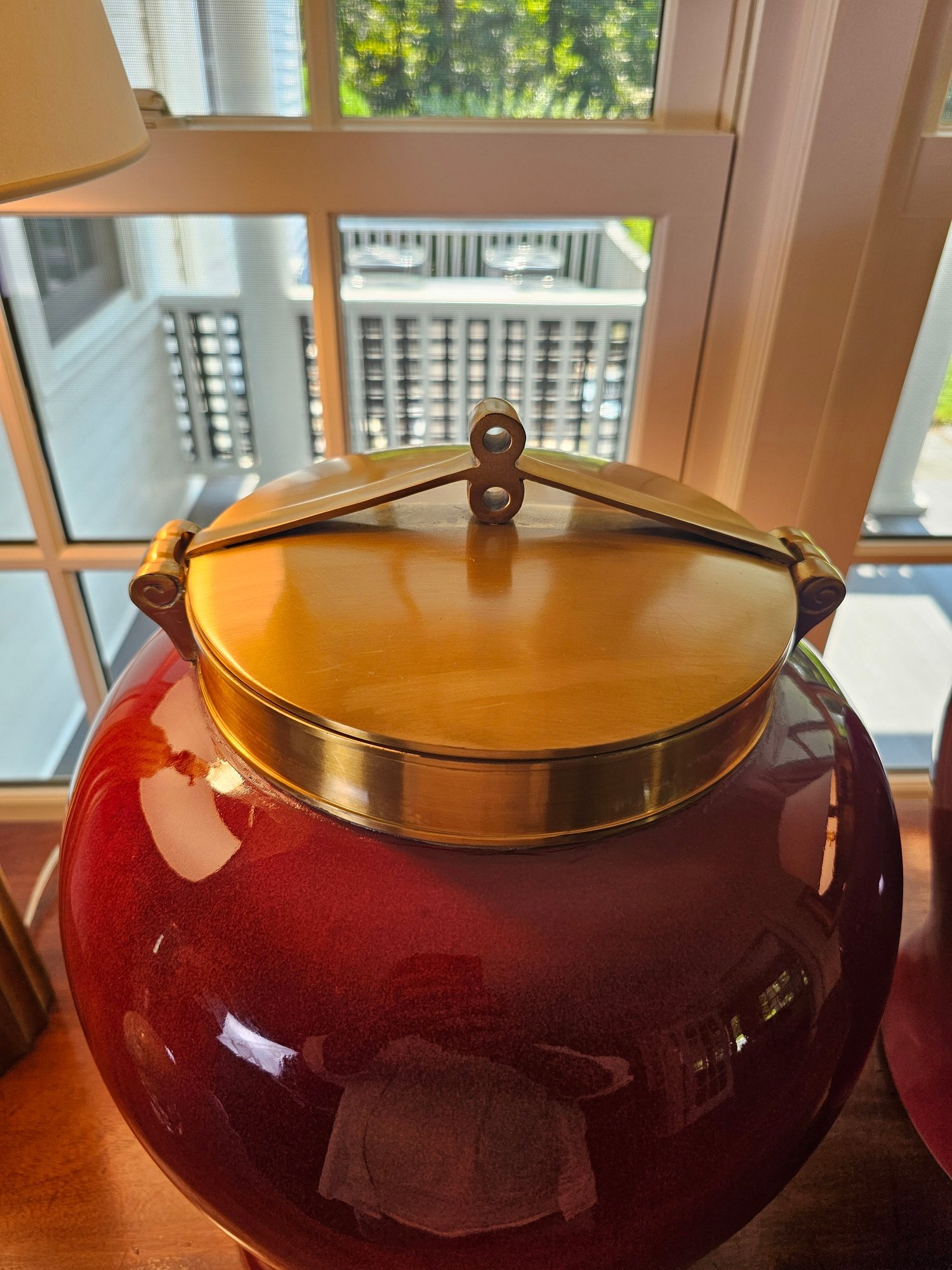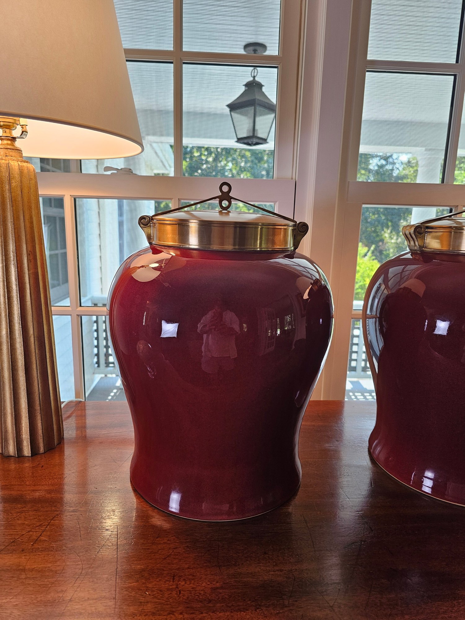 Pair of Blood Red Urns/Ginger Jars with Brass Accents, 18 tall and 15 wide