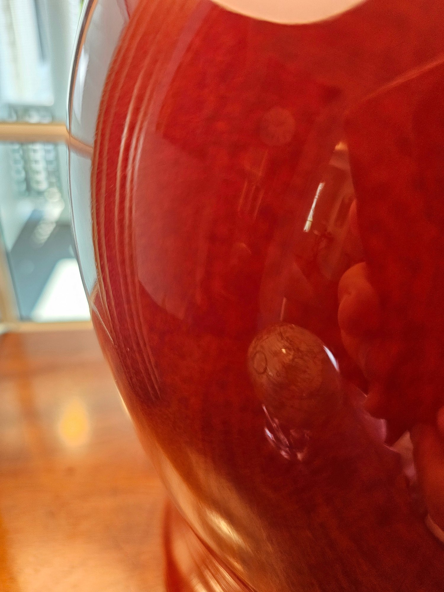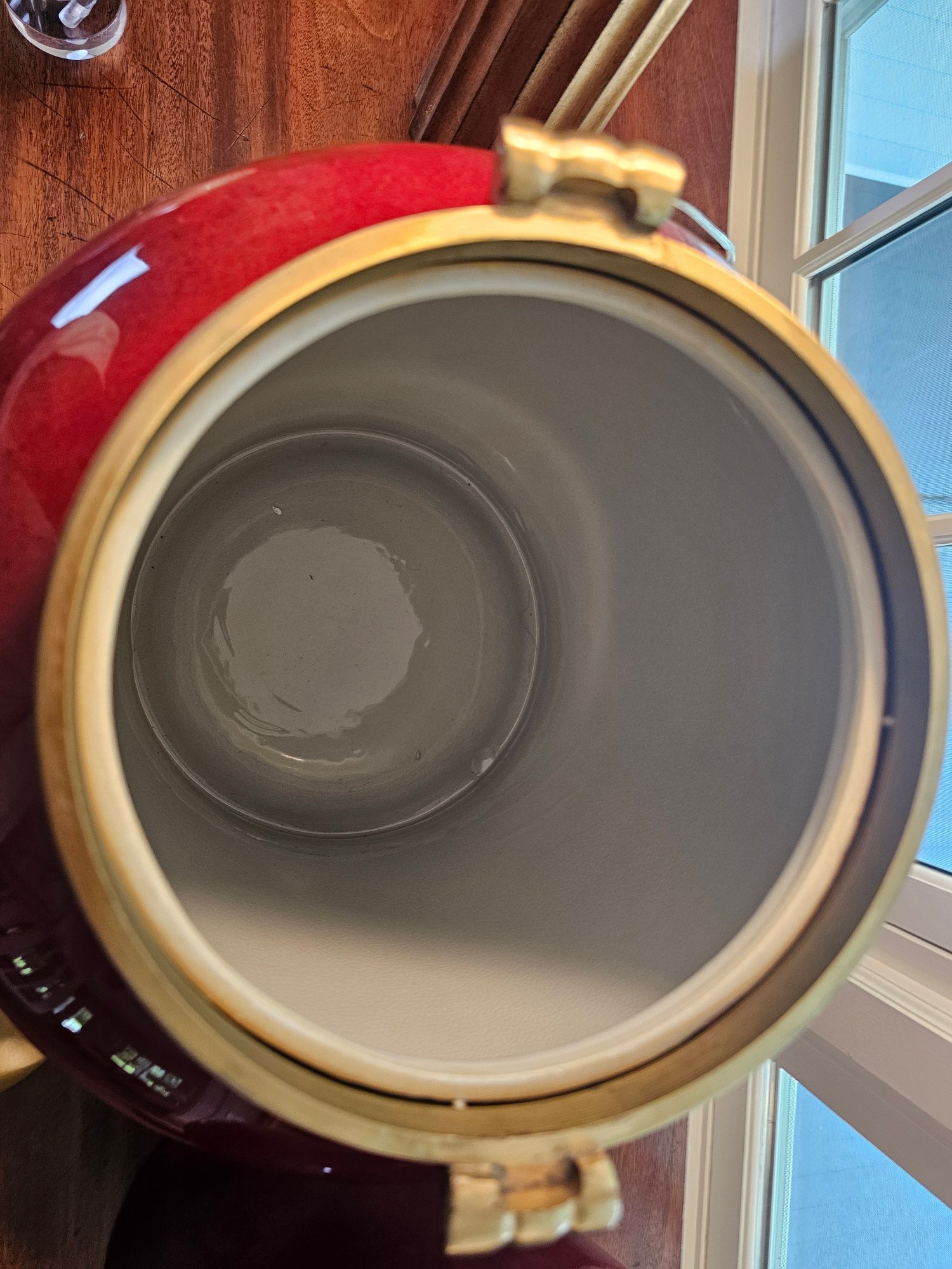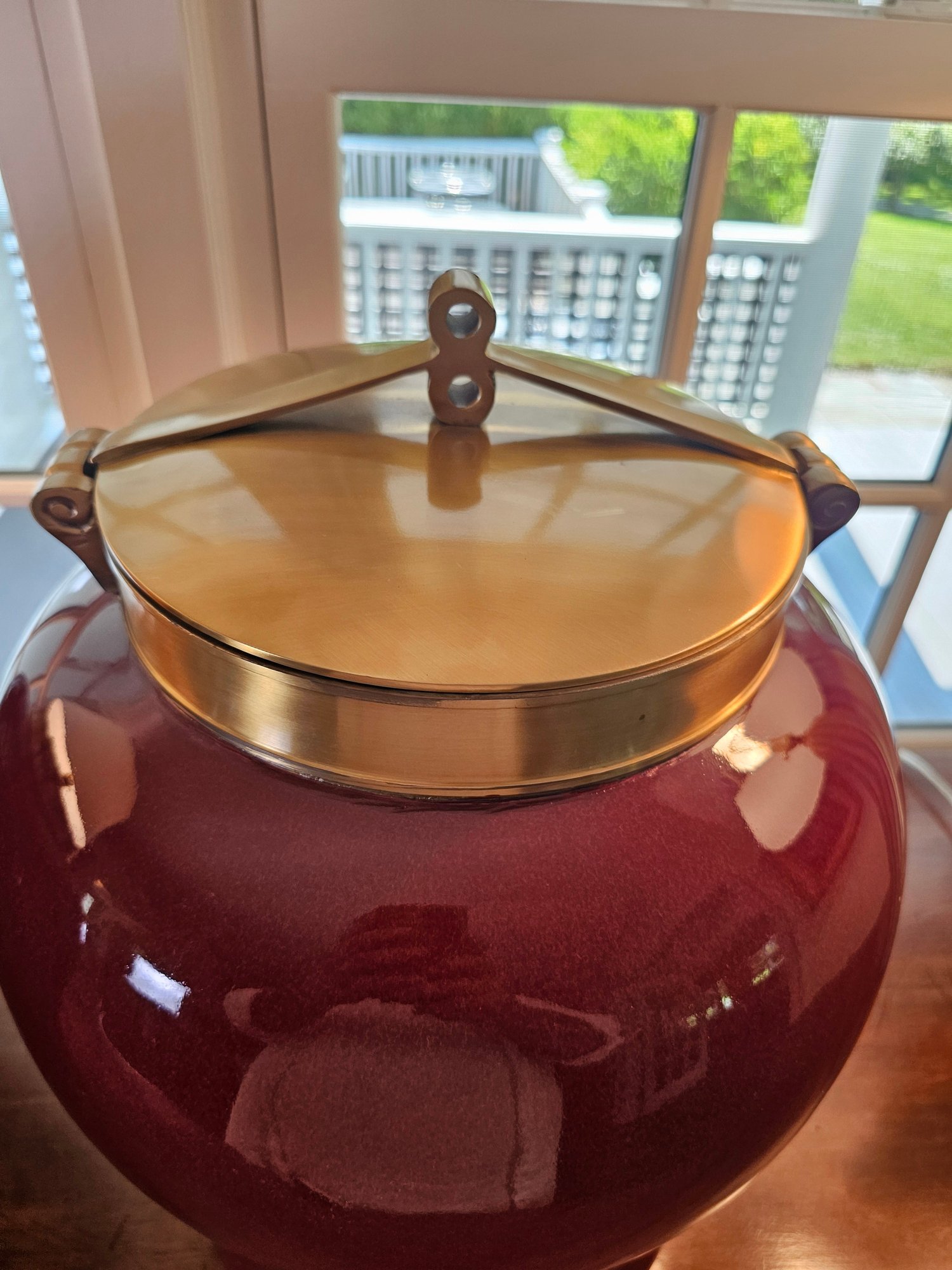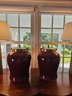 Pair of Blood Red Urns/Ginger Jars with Brass Accents, 18 tall and 15 wide