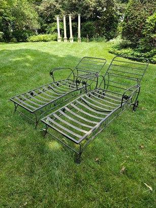 Pair of Classic Wrought Iron Chaise Loungers. Nice condition, few chips to wheel rubber. Couple of cushions and these are ready for another generation of use. 29 wide at (outside armrest) and 72 long