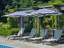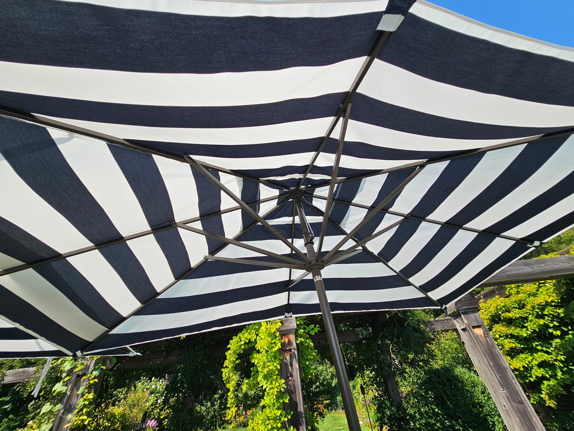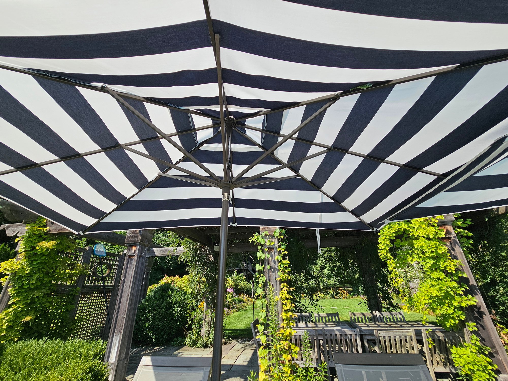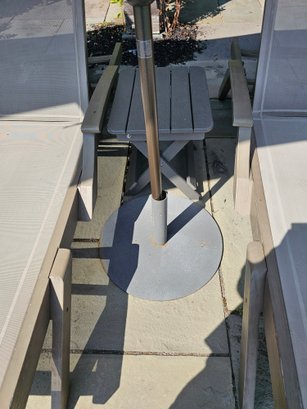 Pair of Navy and White Patio Umbrellas with Stands. Umbrellas are 110 wide