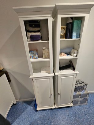 Pair Of Tall And Narrow Cabinets 16x10x67. Great for bathrooms and small spaces. Uncertain if real wood but seems well made.