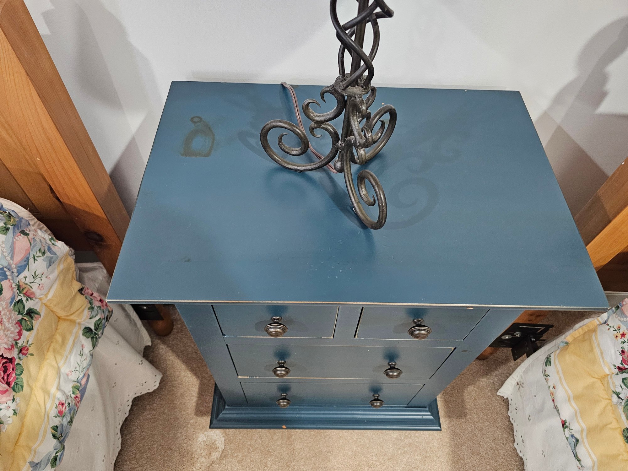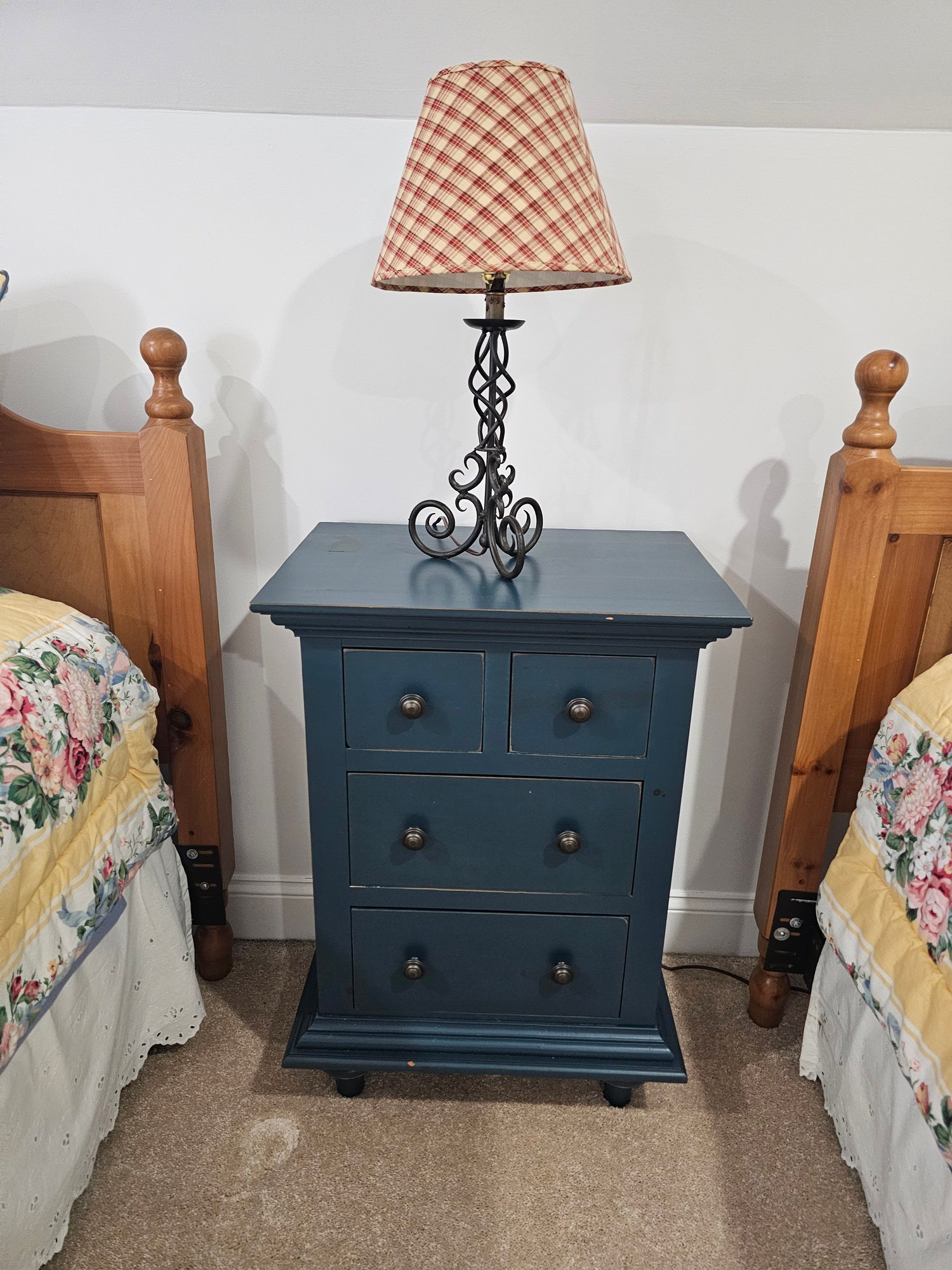 Pair of Twin Beds with Linens, Nightstand and Lamp. Mattresses not inspected, must take all. Nightstand is 23x16x32 Headboard is 44x43