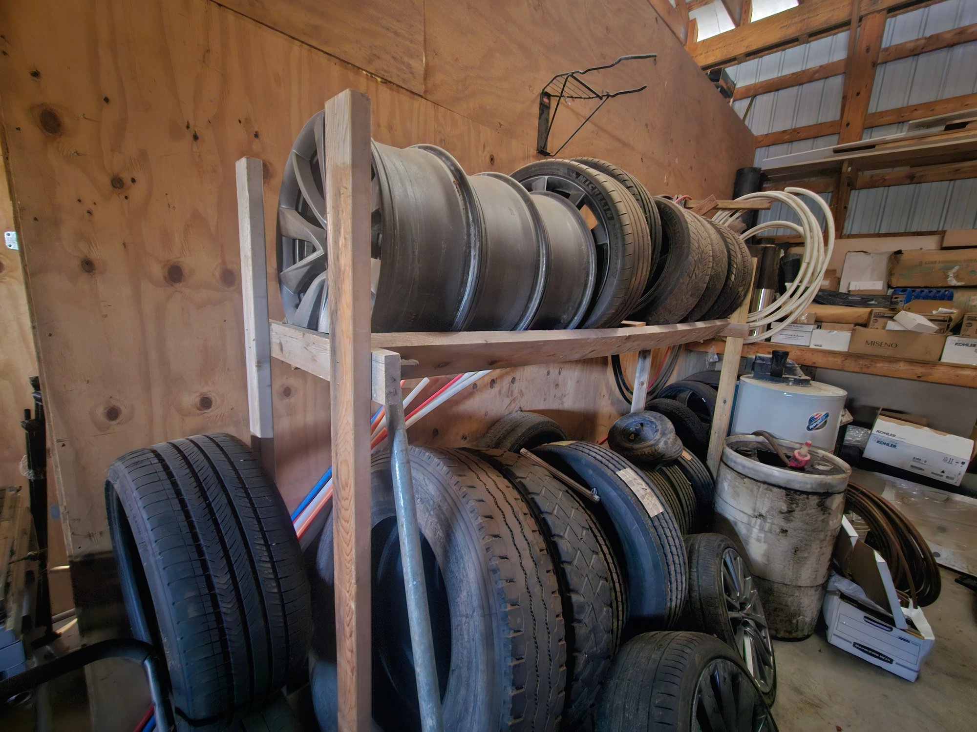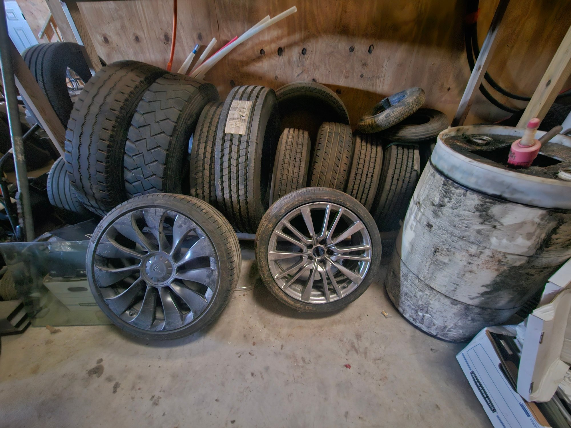 All of The Tires Seen Here (B). I think that there are 2 or 3 other tires not in the picture. I believe rims are to Tesla. Located on ground floor.