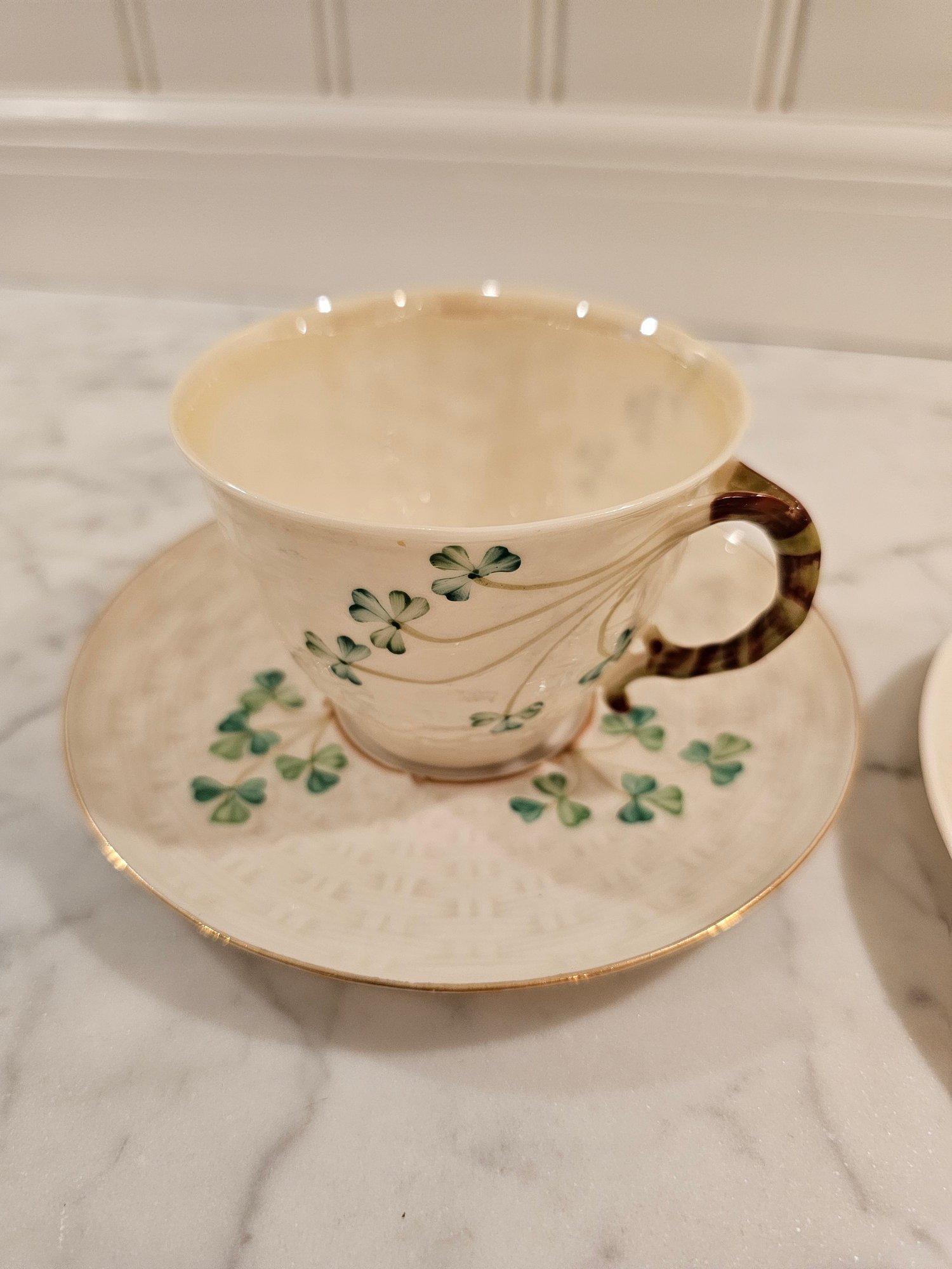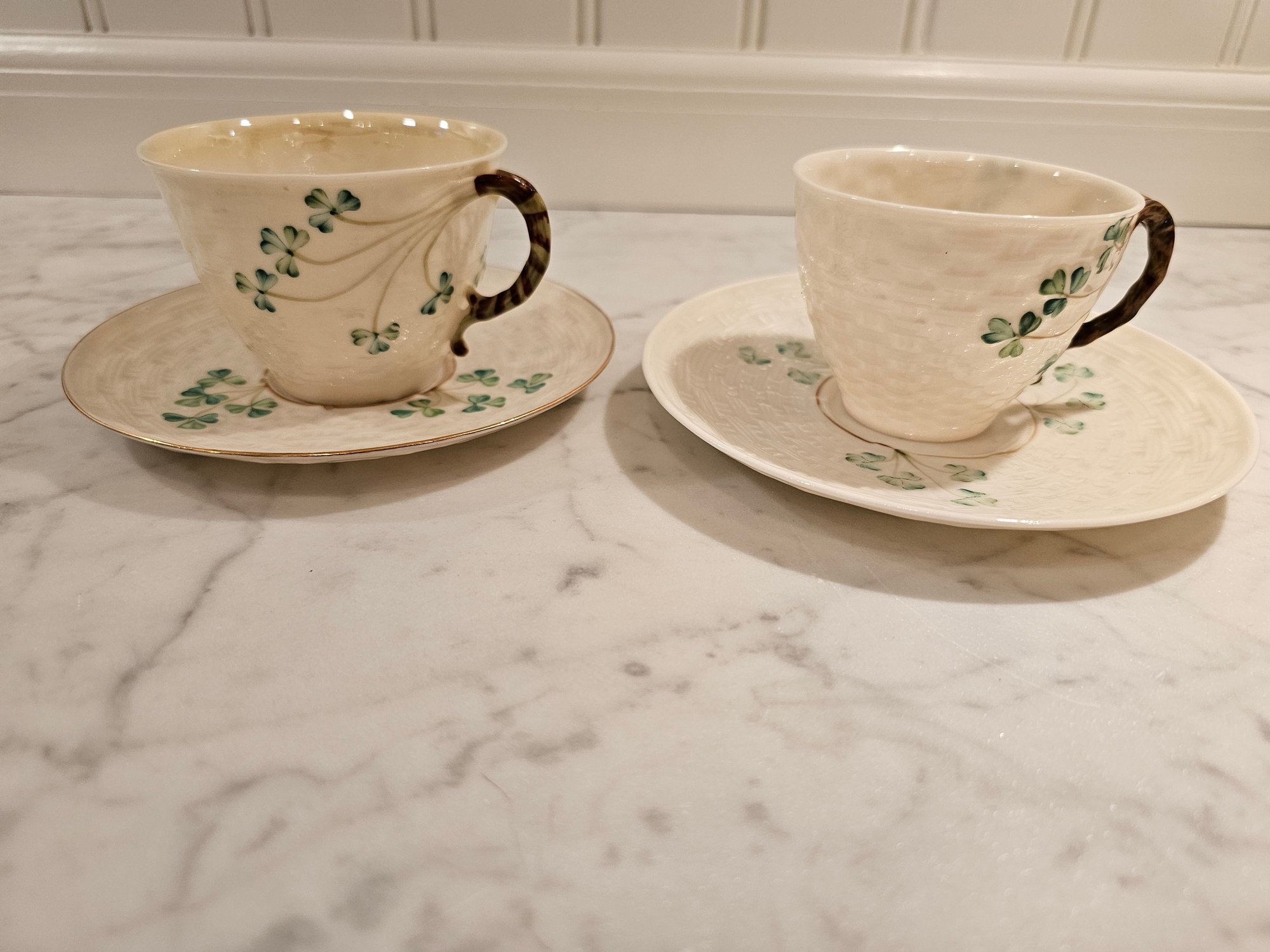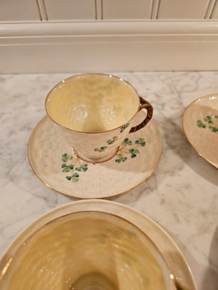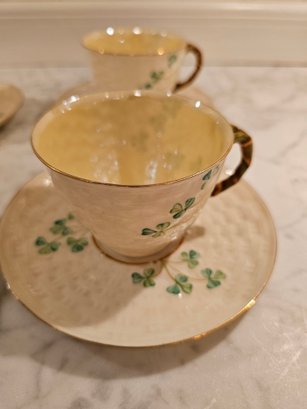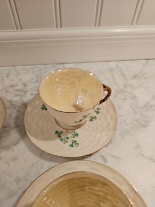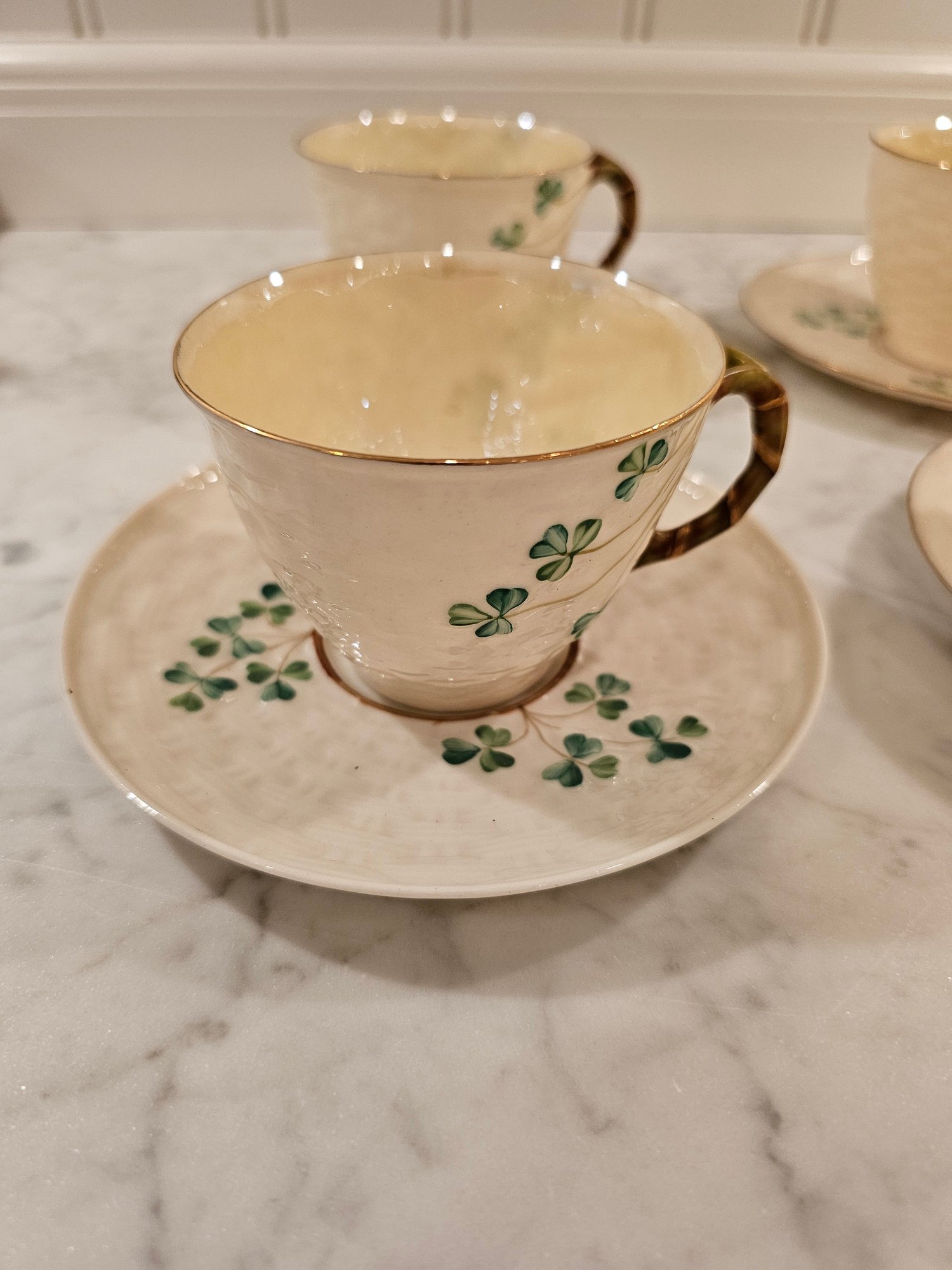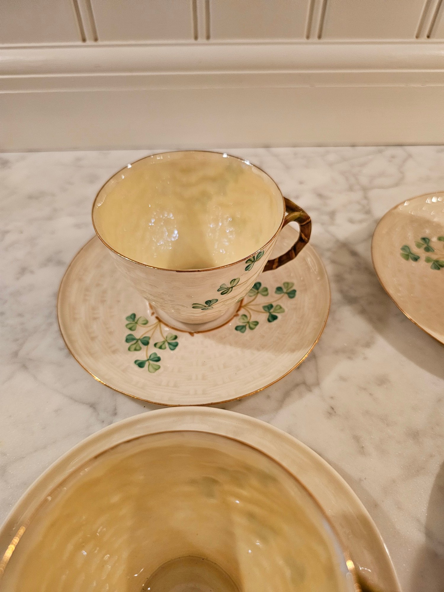 Antique Belleek Teacups and Saucers in the Shamrock Pattern, group of four. Very fine Irish china - paper thin porcelain. Beautiful set.