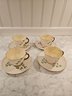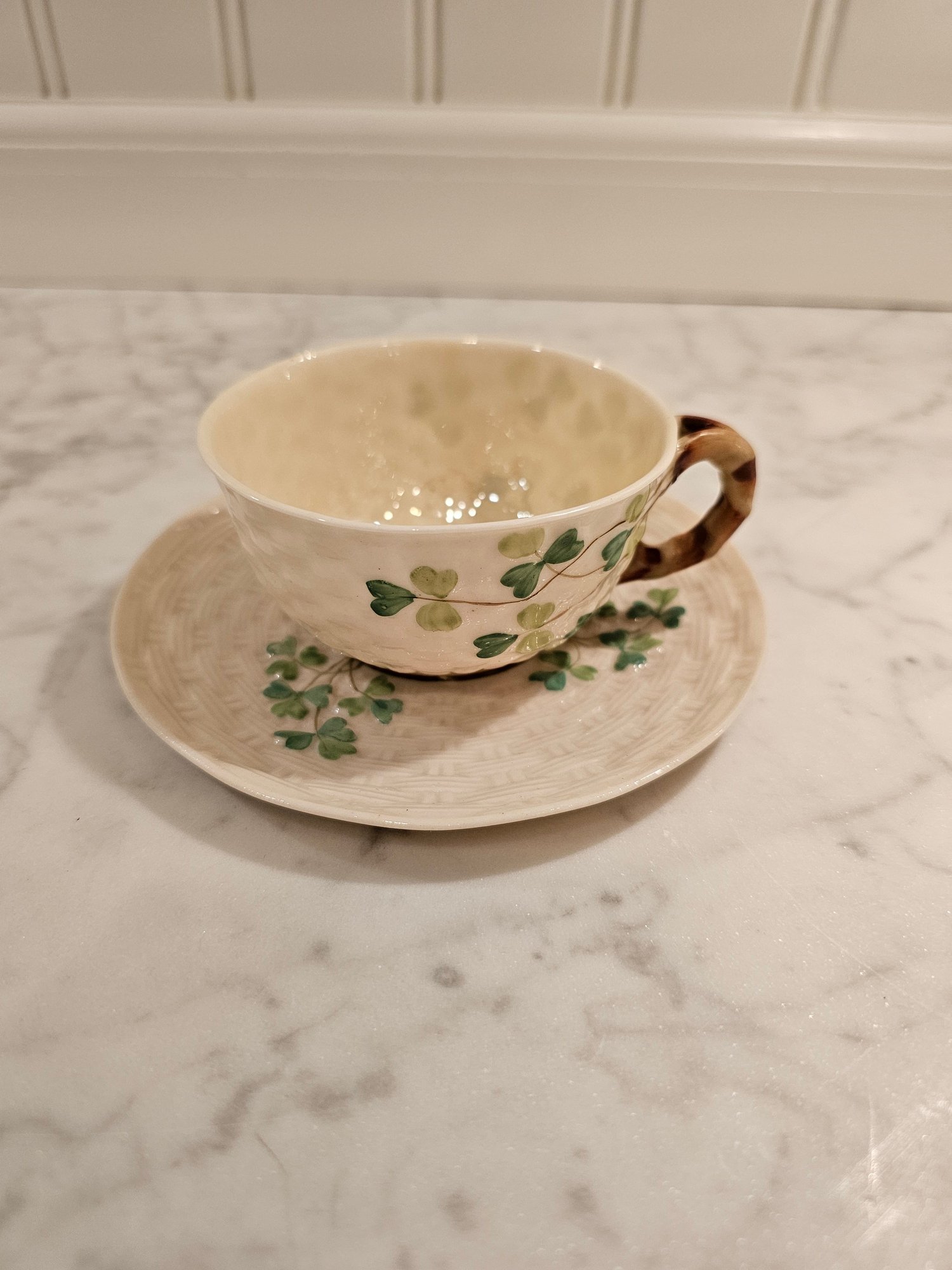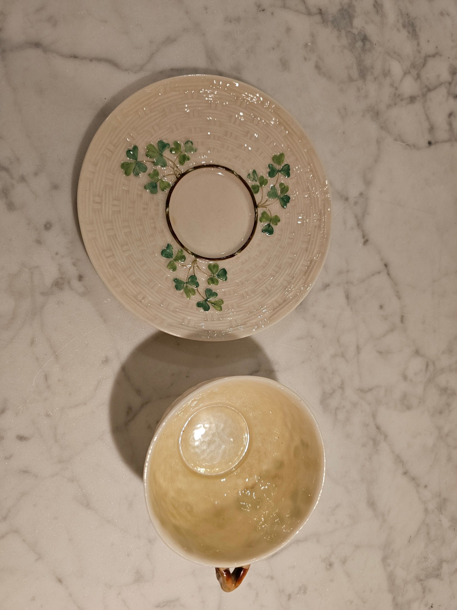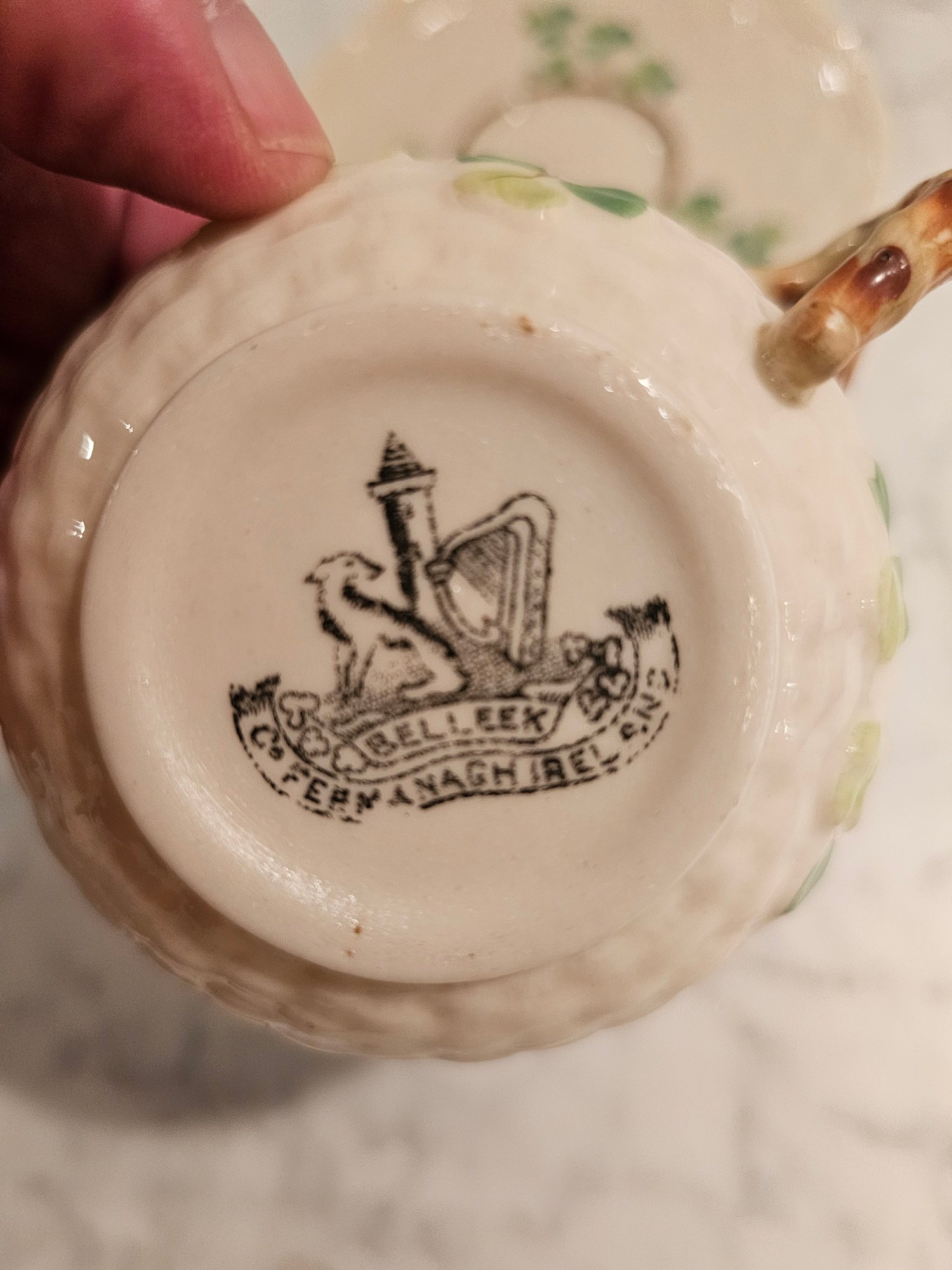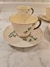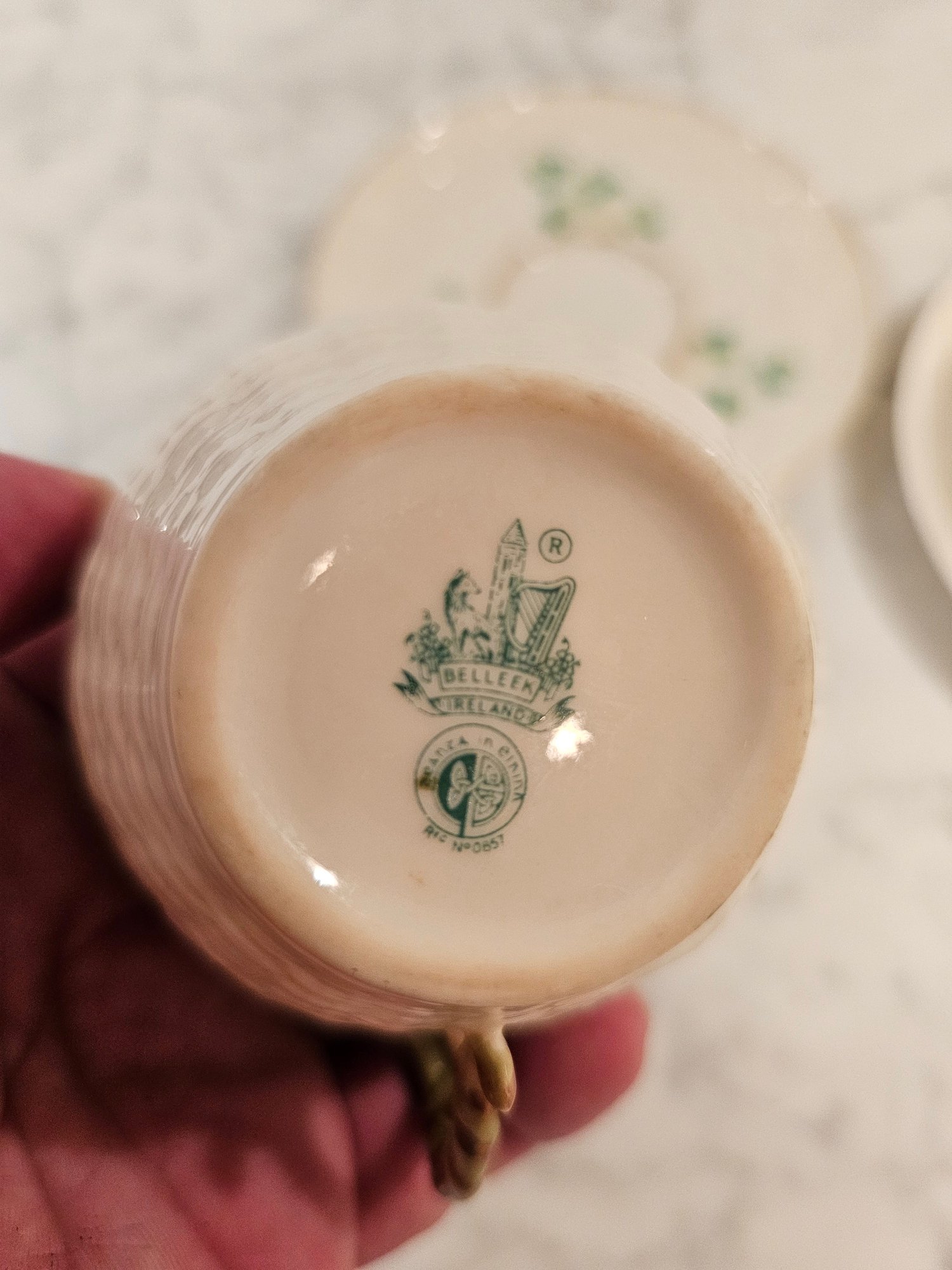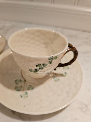 Antique Belleek Teacups and Saucers in the Shamrock Pattern, group of four. Very fine Irish china - paper thin porcelain. Beautiful set.