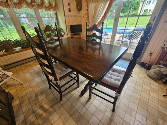 Attractive Dining Table and Ladderback Chairs with rush seats. All look to be in really nice and stable condition. Table is 60x38 and the chairs are 17x45x16 with a seat height of 18 1/2. Great for smaller eating areas
