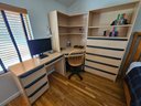 Combination Desk And Dresser With Open Shelving. From left to right, the desk portion is 18x42x30, the center desk area is 33x34 and 72 tall. The dresser is 36x18x72. Some disassembly may be required for removal.