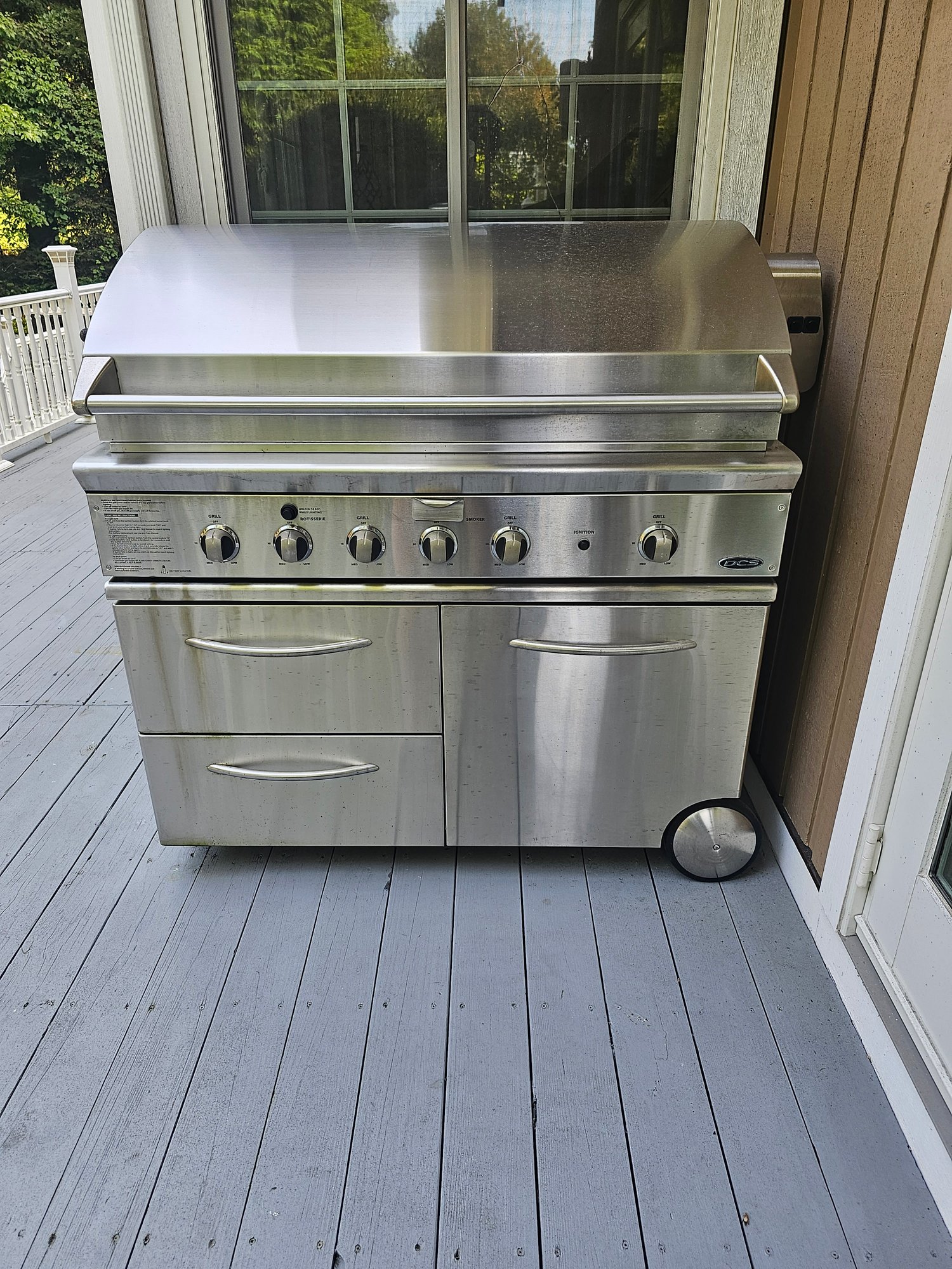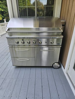 This is one of the best grills that money can buy. It measures 53x27x50. New these grills are a small fortune retailing for well over $5,000. This grill even has built in lighting, rotisserie and storage drawers below.
